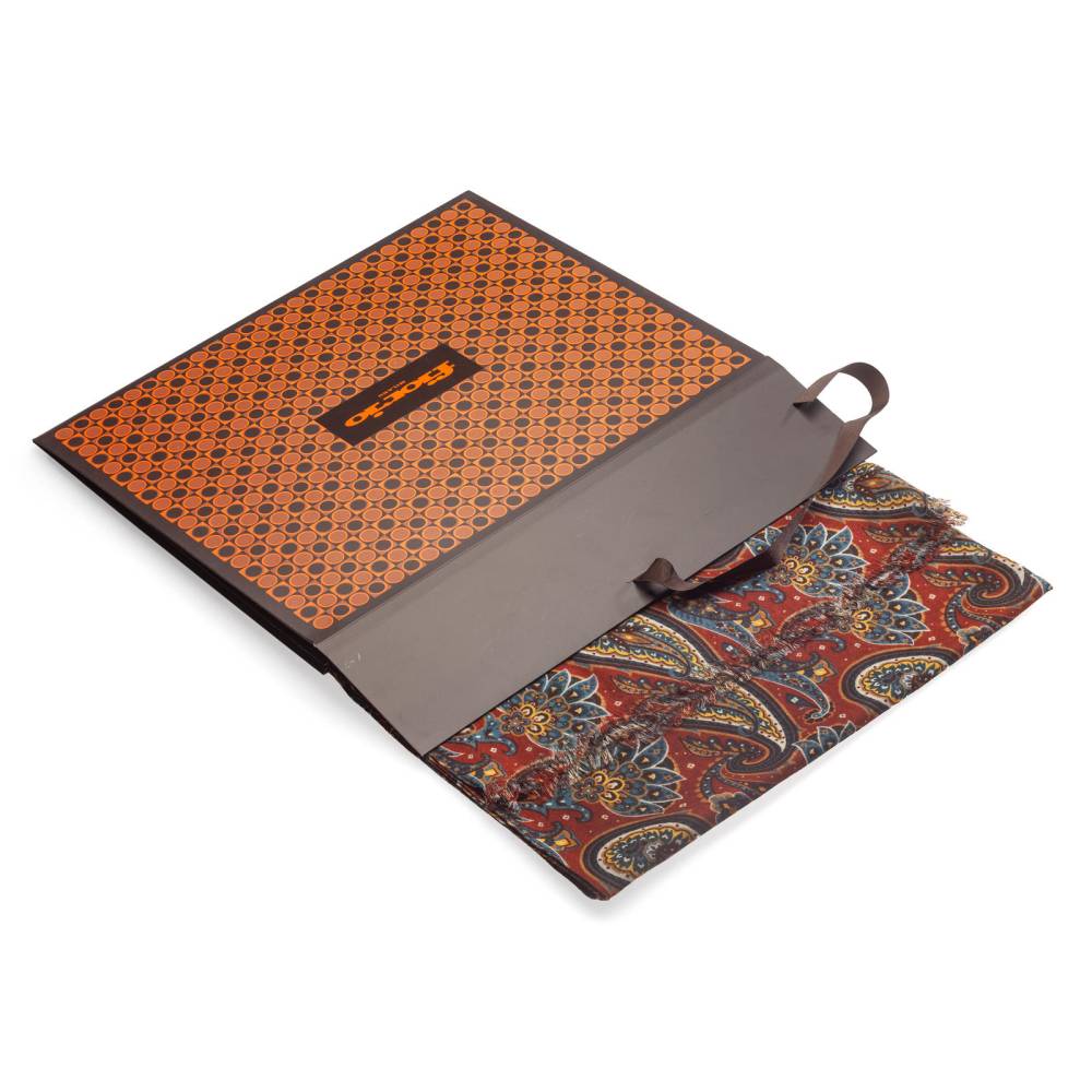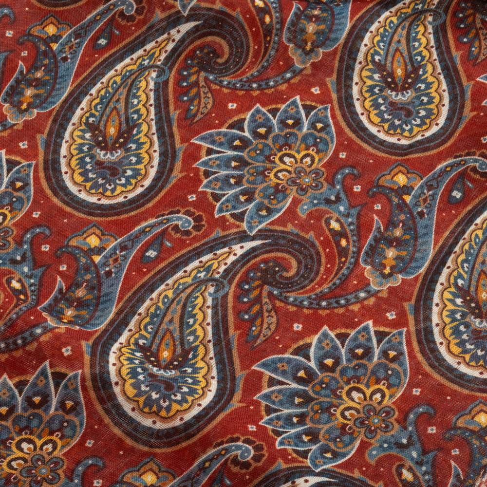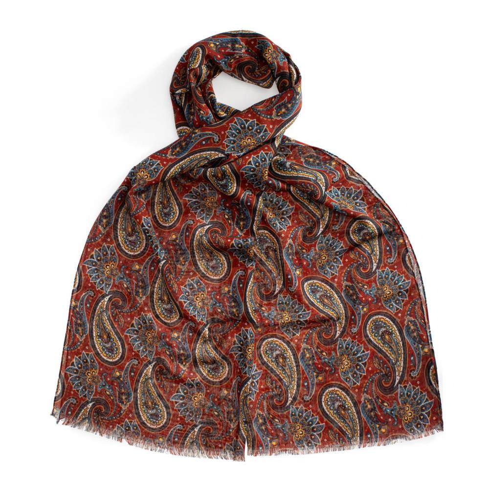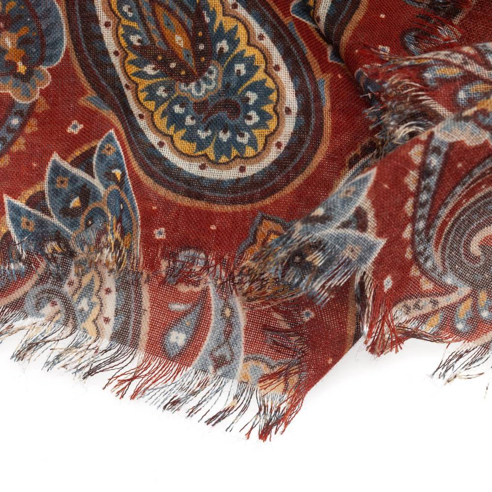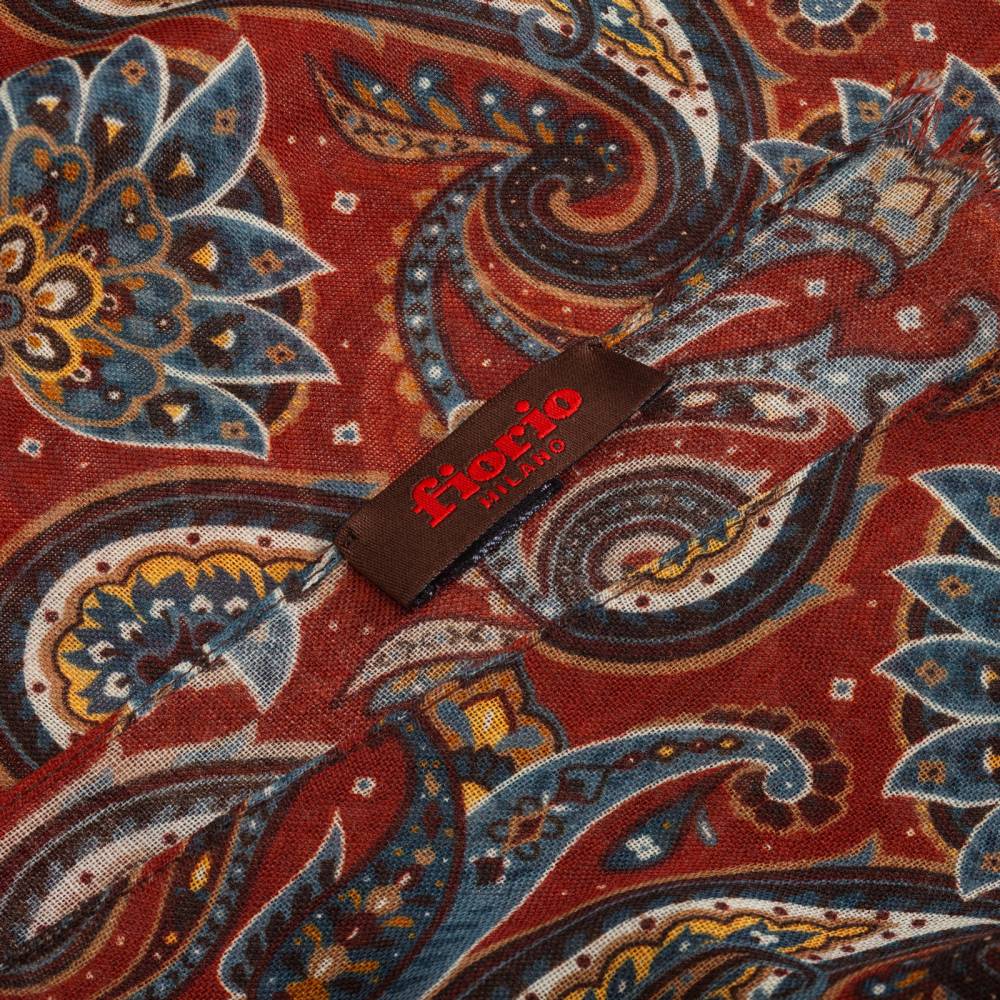 Лёгкий мужской шарф Fiorio, сотканный из высококачественной шерстяной пряжи. Приятный на ощупь, мягкий и практичный аксессуар не только согреет в прохладную погоду, но подойдёт практически к любому классическому образу, добавив ненавязчивый акцент. Полотно украшено крупными яркими узорами пейсли. Размер шарфа позволит удобно повязывать его всевозможными узлами. К аксессуару прилагается фирменный подарочный конверт.