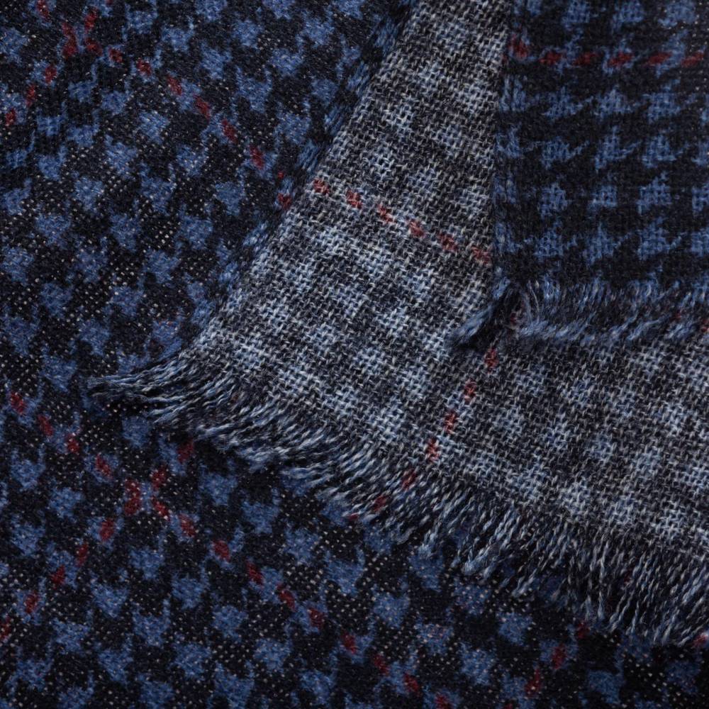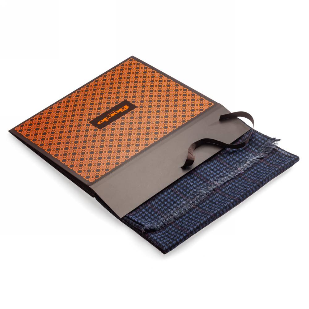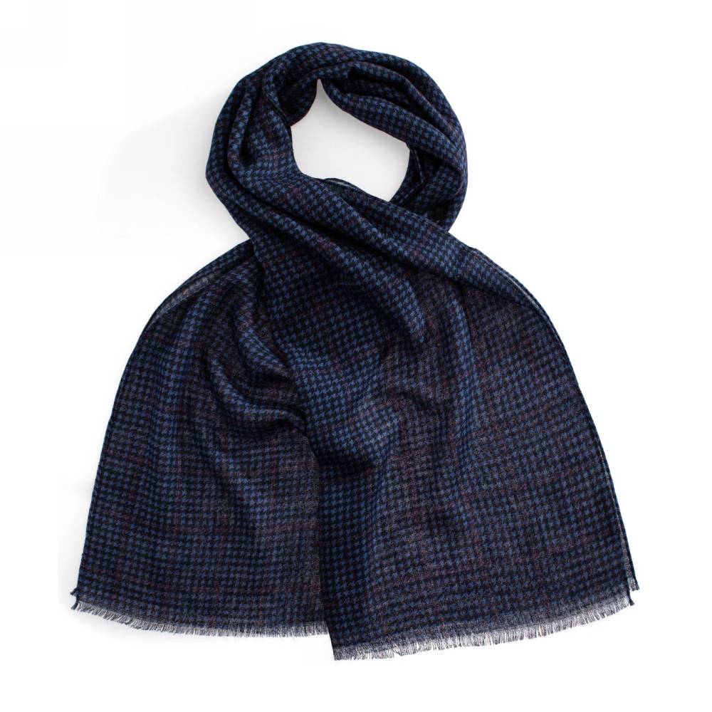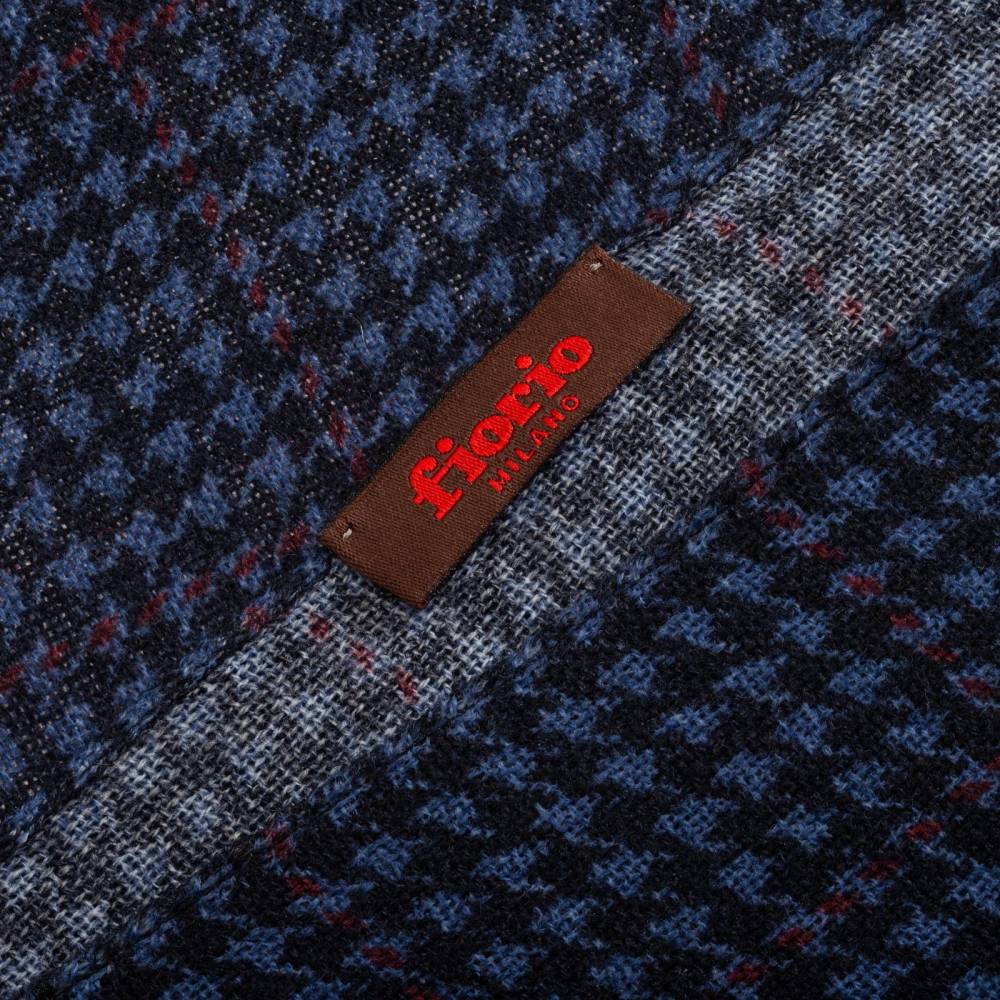 Тёплый мужской шарф Fiorio, сотканный из высококачественной овечьей шерсти средней плотности. Подойдёт практически к любому классическому образу, добавив ненавязчивый акцент. Полотно украшено узором «пастушья клетка» (англ. shepherd's check) в тёмно-синей цветовой гамме, а также короткой бахромой по краям. Размер шарфа позволит удобно повязывать его всевозможными узлами. К аксессуару прилагается фирменный подарочный конверт.