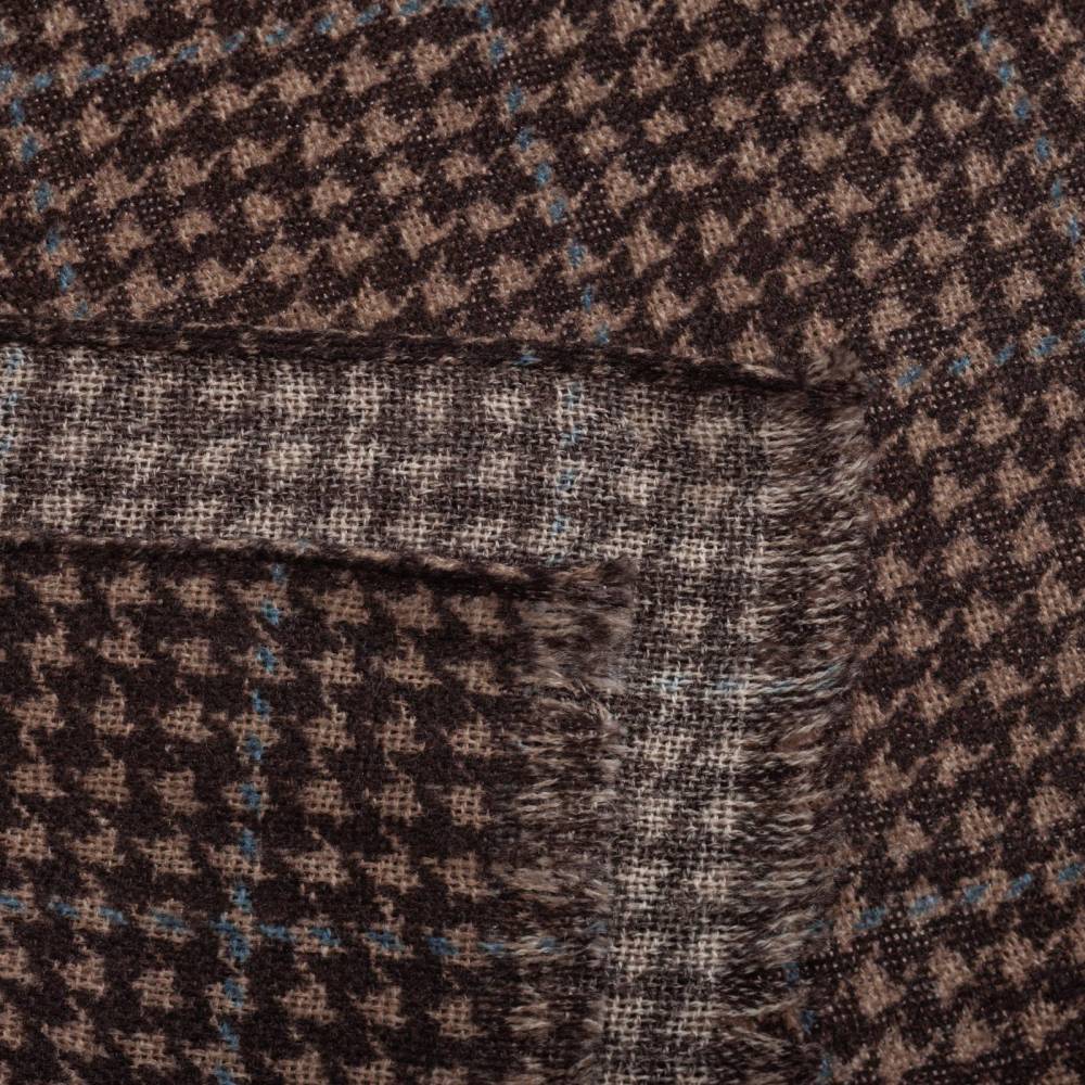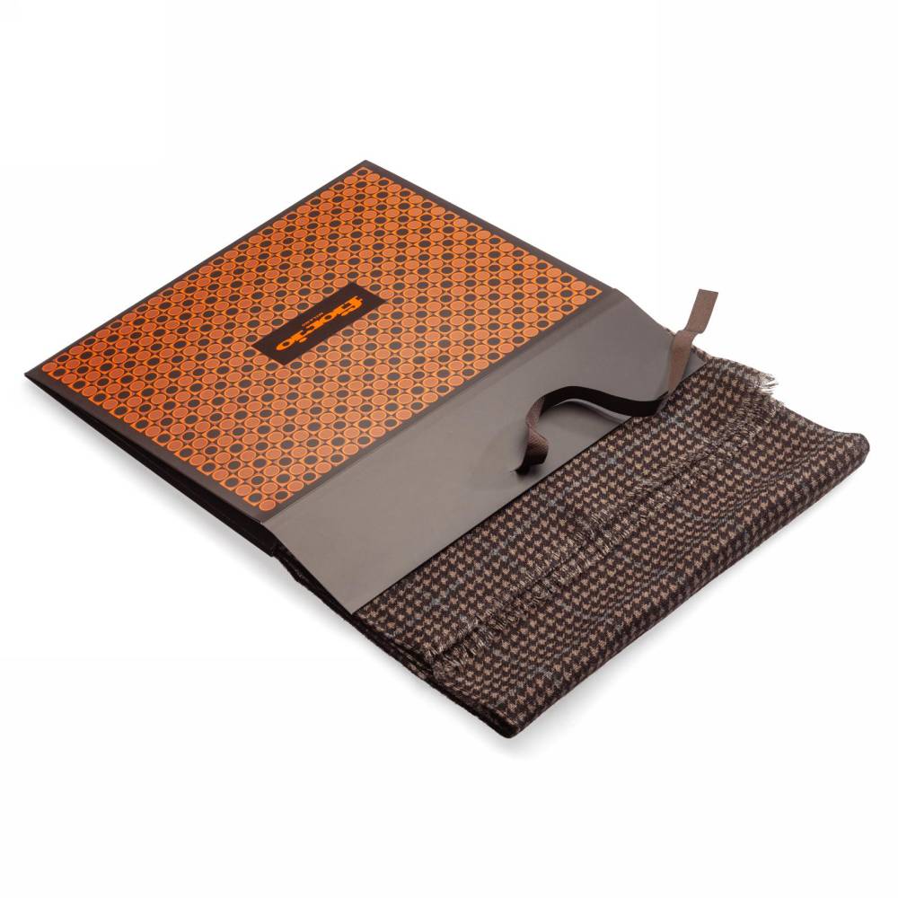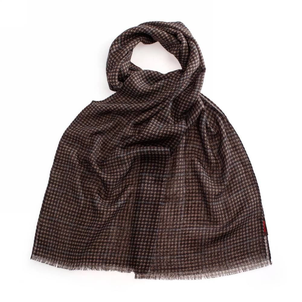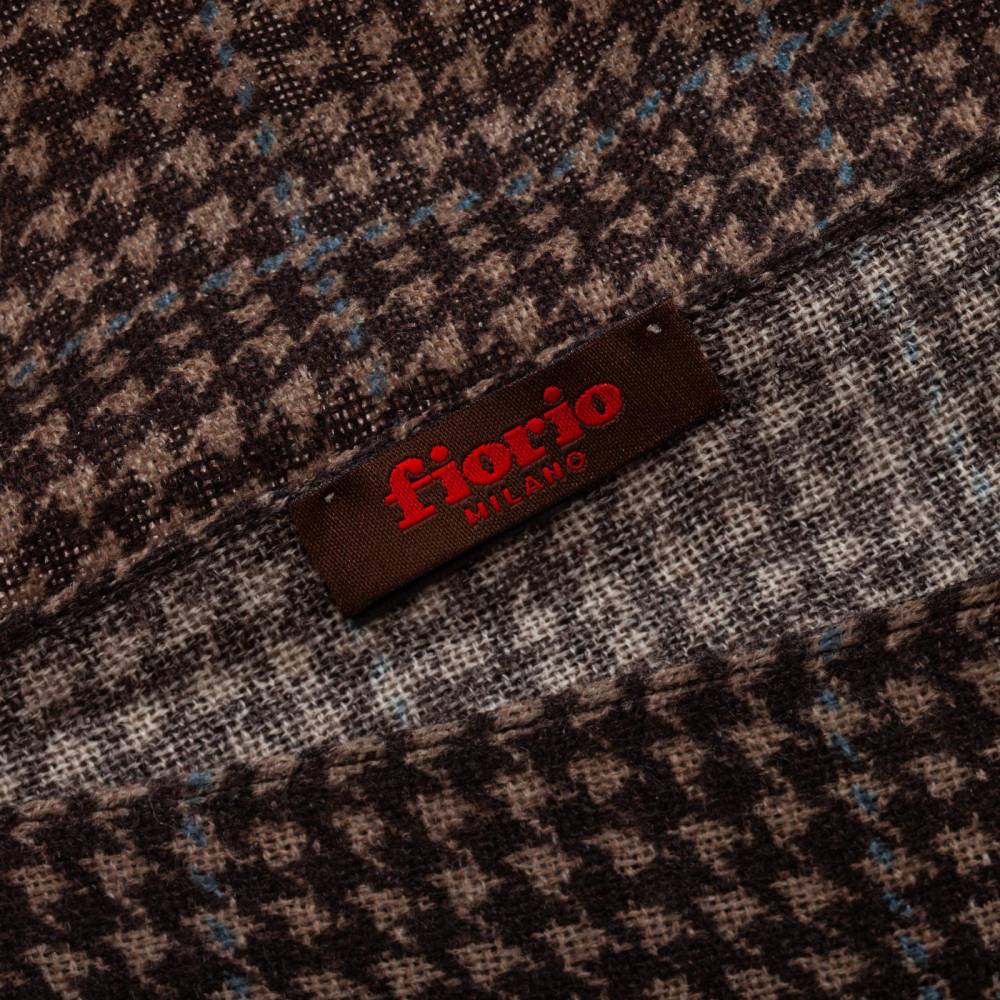 Тёплый мужской шарф Fiorio, сотканный из высококачественной овечьей шерсти средней плотности. Подойдёт практически к любому классическому образу, добавив ненавязчивый акцент. Полотно украшено узором «пастушья клетка» (англ. shepherd's check) в тёмно-коричневой цветовой гамме, а также короткой бахромой по краям. Размер шарфа позволит удобно повязывать его всевозможными узлами. К аксессуару прилагается фирменный подарочный конверт.