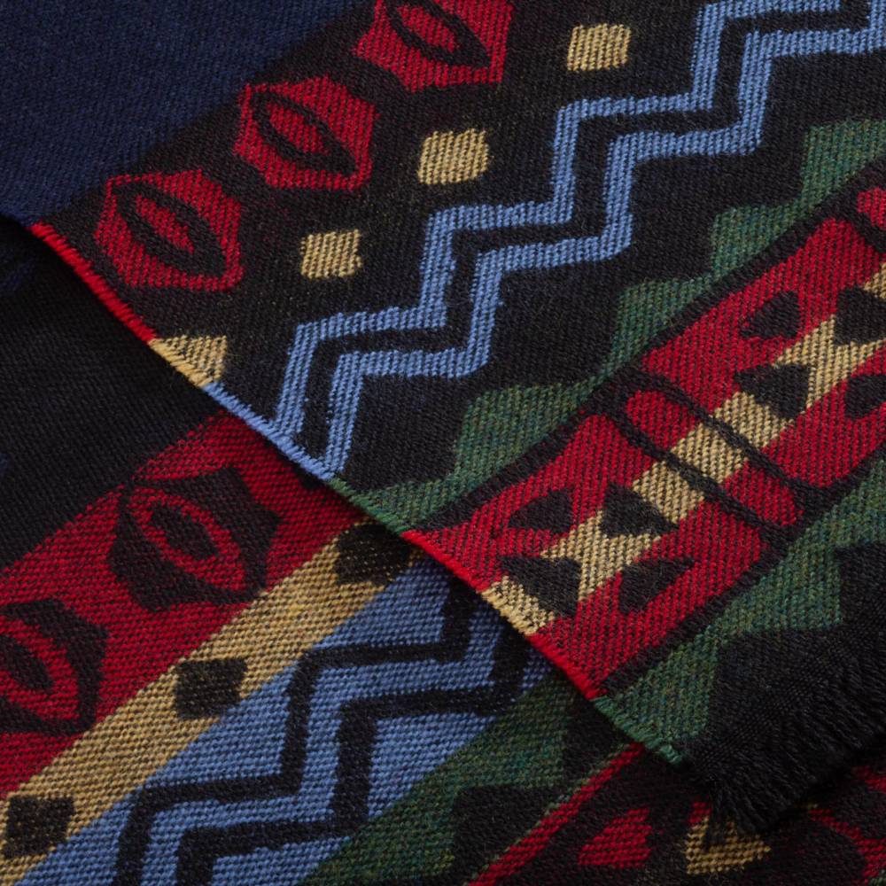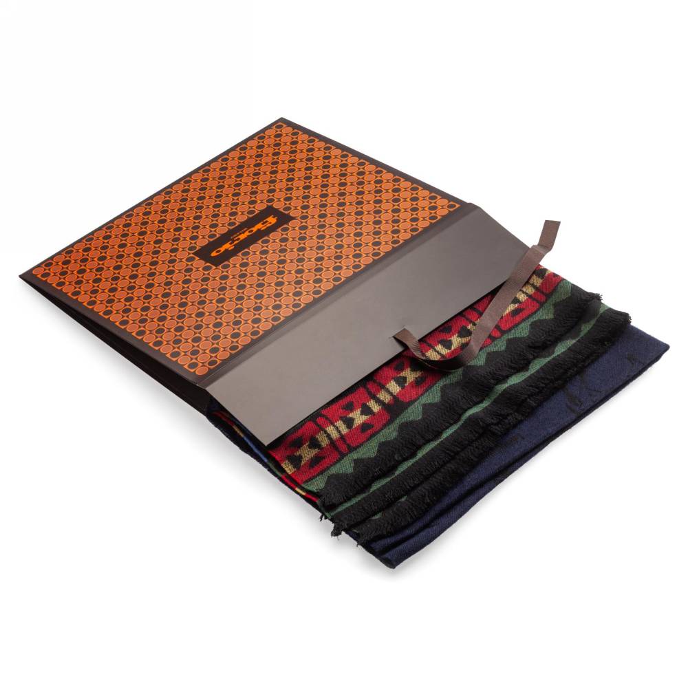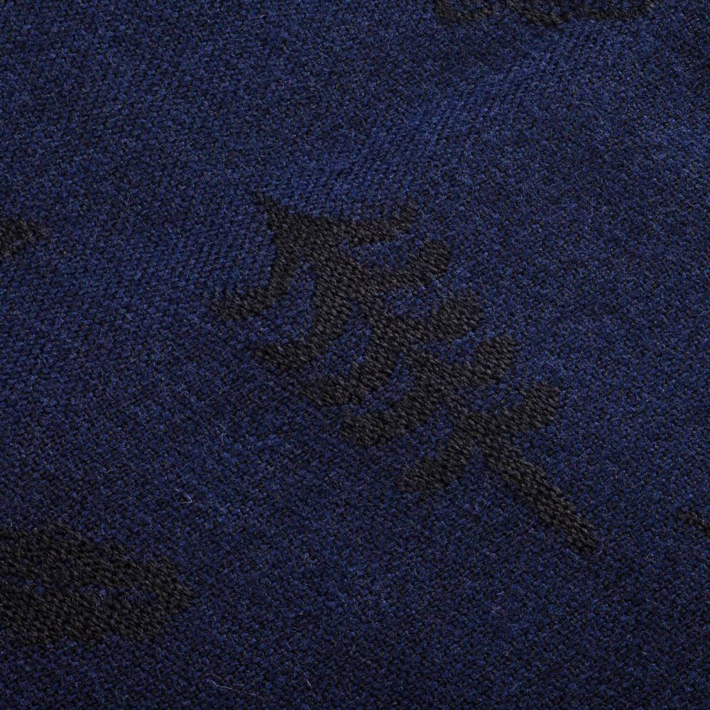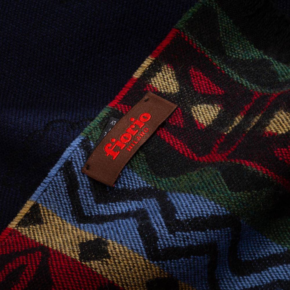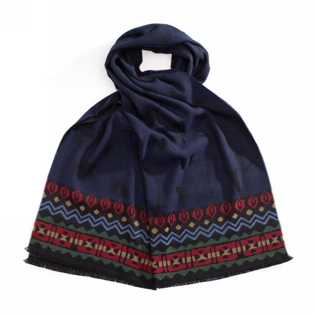 Тёплый объёмный тёмно-синий шарф Fiorio, выполненный из мягкой шерсти ягнёнка. Подойдёт практически к любому классическому образу, добавив ненавязчивый акцент. Модель украшена принтами в виде наскальных рисунков и геометрическими фольклорными узорами, а также короткой бахромой. Размер шарфа позволит удобно повязывать его всевозможными узлами. К аксессуару прилагается фирменный подарочный конверт.