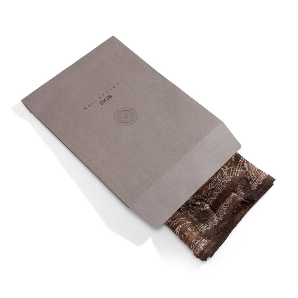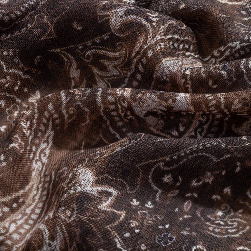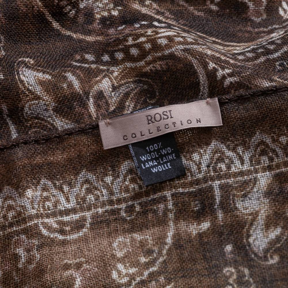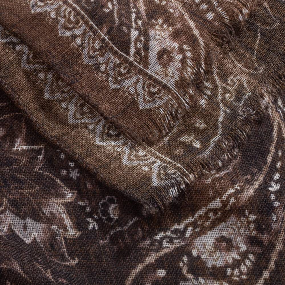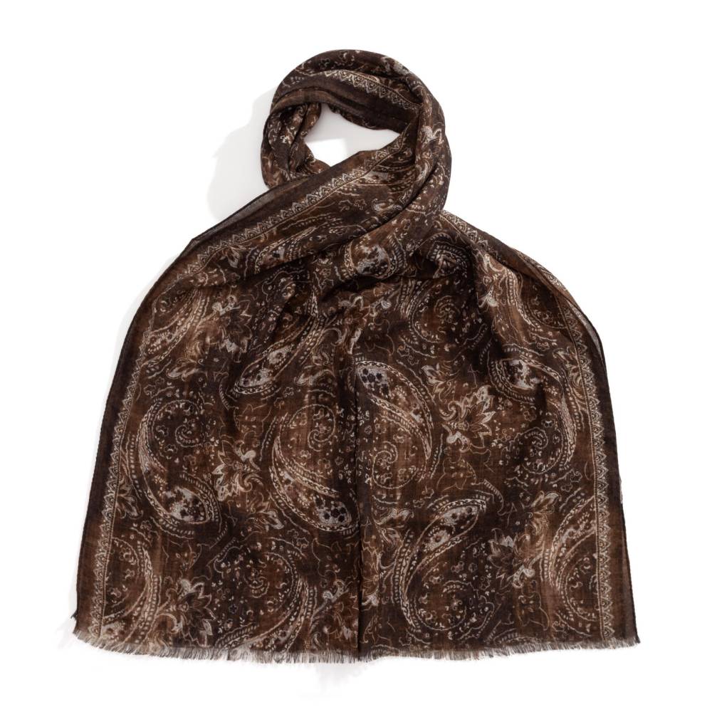 Роскошный шарф Rosi соткан из высококачественной тонкой шерстяной пряжи. Легкий, нежный и почти невесомый, он станет элегантным дополнением к любому классическому образу, добавив ненавязчивый акцент и нотку романтики. Полотно благородного коричневого цвета украшено крупным узором пейсли (Paisley) бежевых оттенков. Размер шарфа позволяет удобно повязывать его всевозможными узлами и складывать в несколько раз. Модель подходит как для мужчин, так и для женщин (унисекс). К аксессуару прилагается фирменный подарочный конверт.