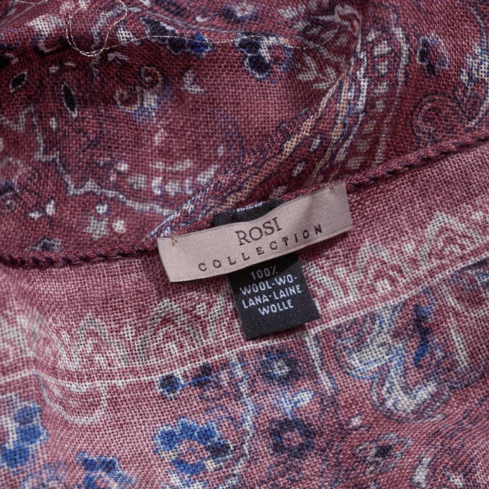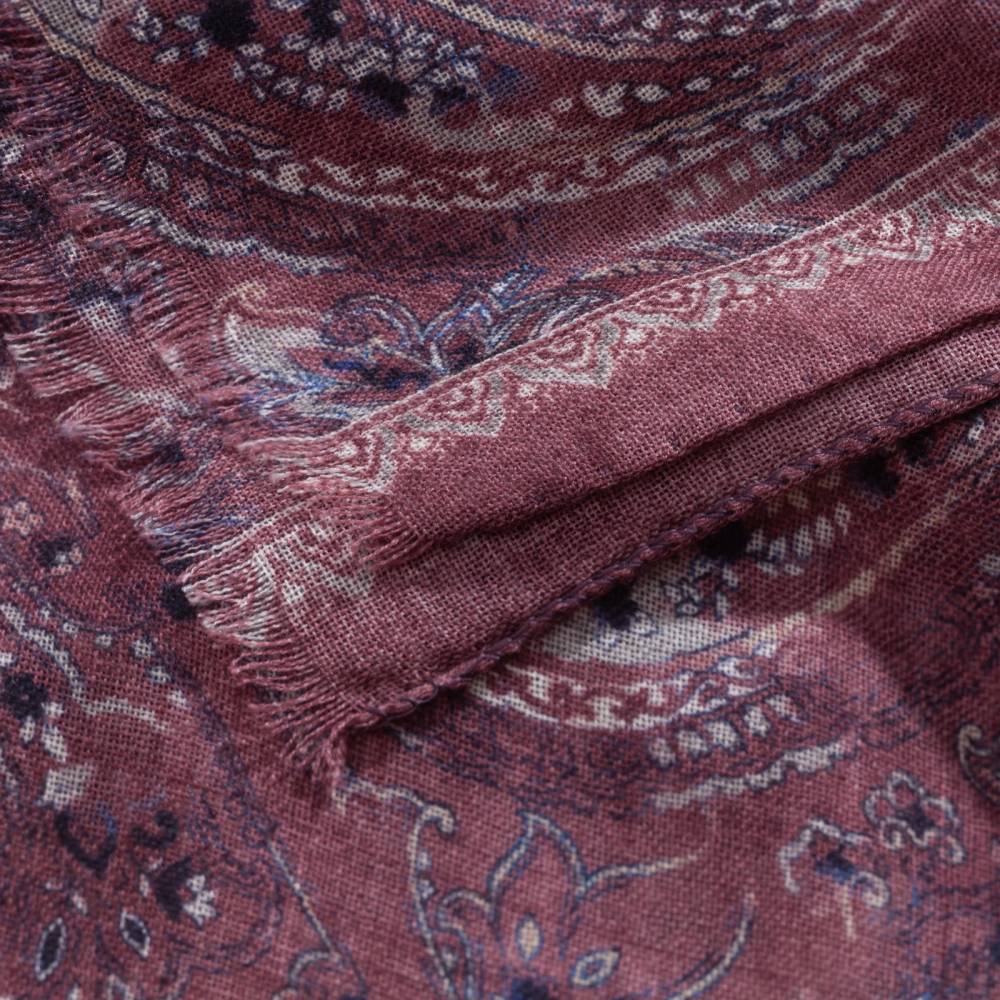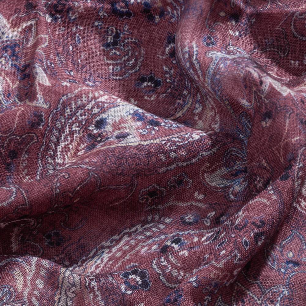 Роскошный шарф Rosi соткан из высококачественной тонкой шерстяной пряжи. Легкий, нежный и почти невесомый, он станет элегантным дополнением к любому классическому образу, добавив ненавязчивый акцент и нотку романтики. Полотно благородного бордового цвета украшено крупным узором пейсли (Paisley) синего и бежевого оттенков. Размер шарфа позволяет удобно повязывать его всевозможными узлами и складывать в несколько раз. Модель подходит как для мужчин, так и для женщин (унисекс). К аксессуару прилагается фирменный подарочный конверт.