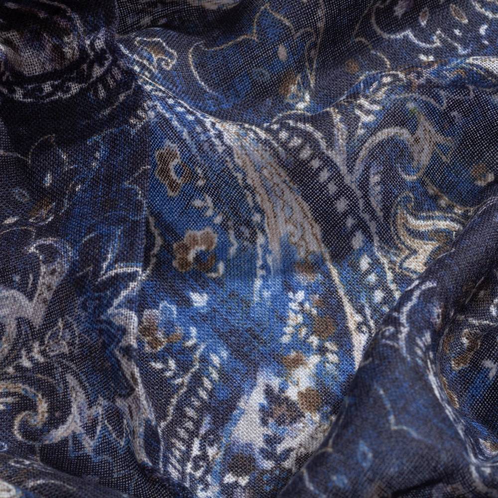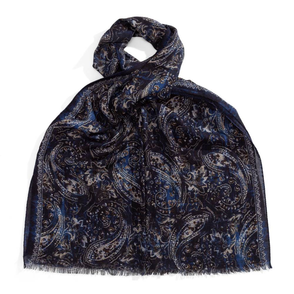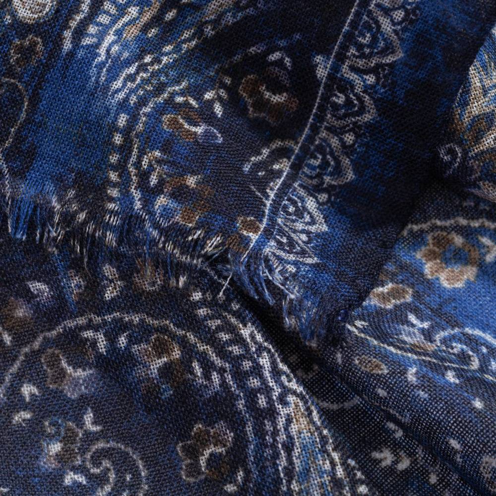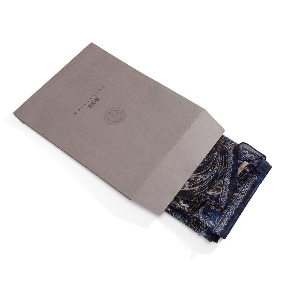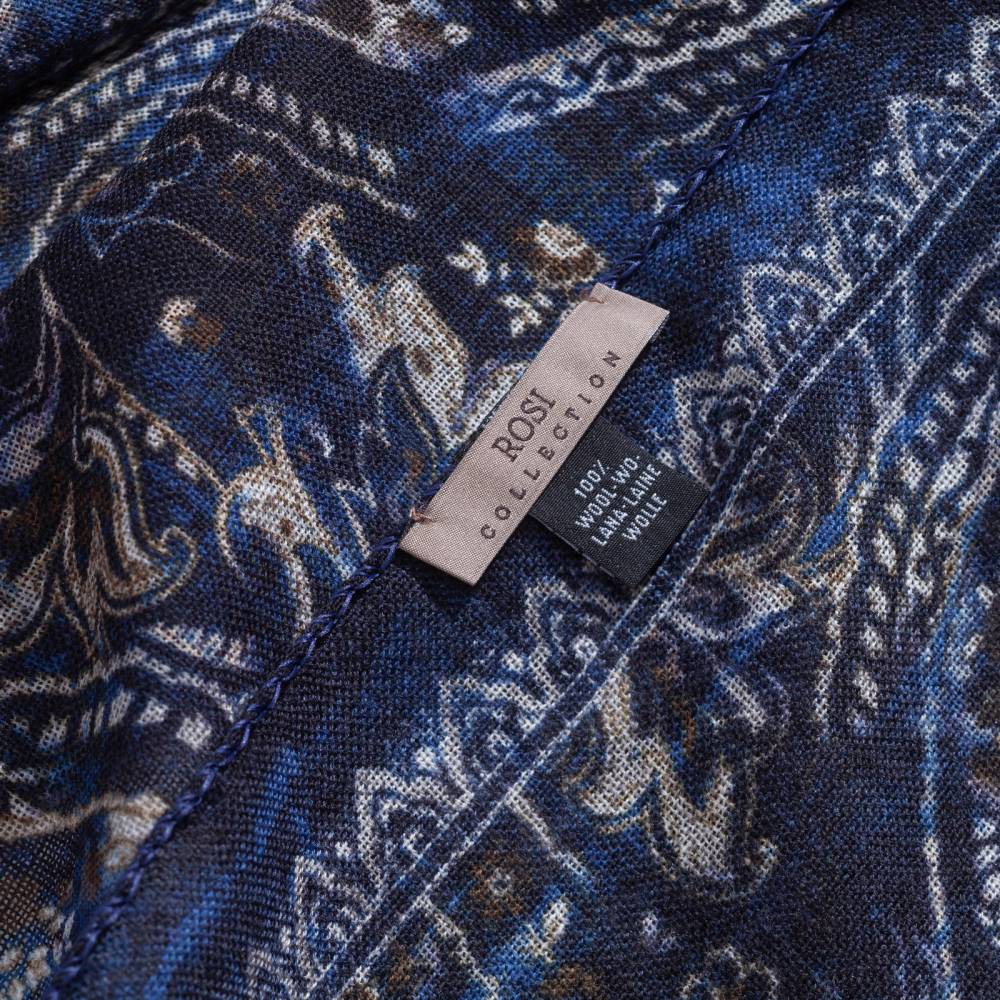 Роскошный шарф Rosi соткан из высококачественной тонкой шерстяной пряжи. Легкий, нежный и почти невесомый, он станет элегантным дополнением к любому классическому образу, добавив ненавязчивый акцент и нотку романтики. Полотно благородного тесно-синего цвета украшено крупным узором пейсли (Paisley) коричневых, синих и бежевых оттенков. Размер шарфа позволяет удобно повязывать его всевозможными узлами и складывать в несколько раз. Модель подходит как для мужчин, так и для женщин (унисекс). К аксессуару прилагается фирменный подарочный конверт.