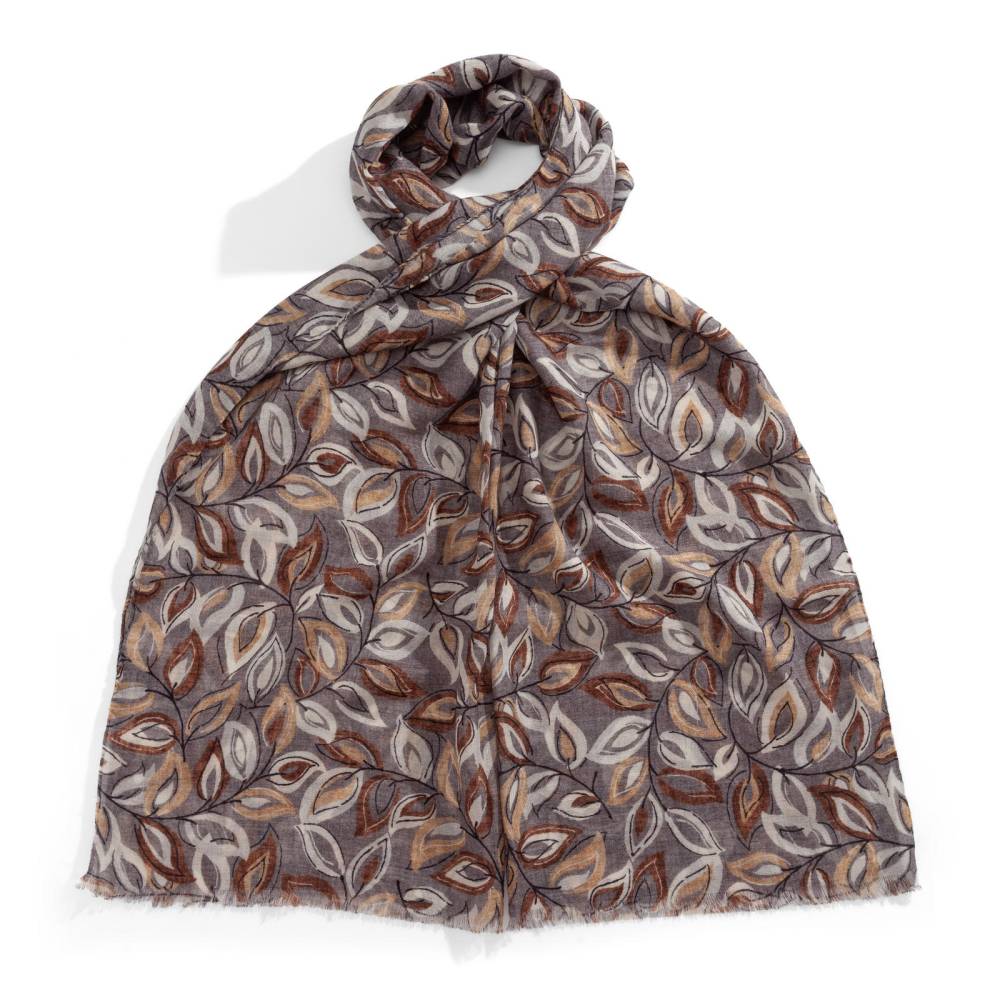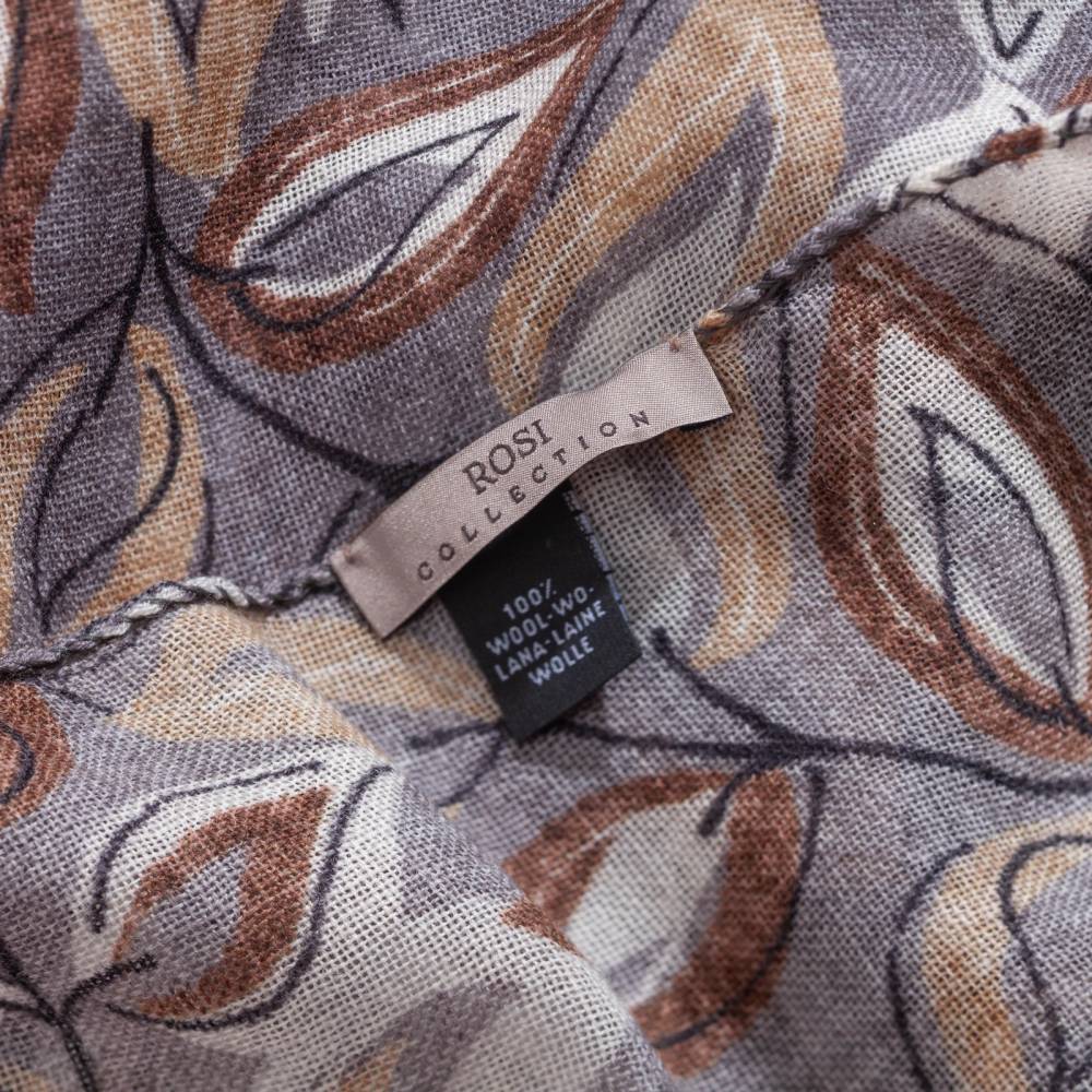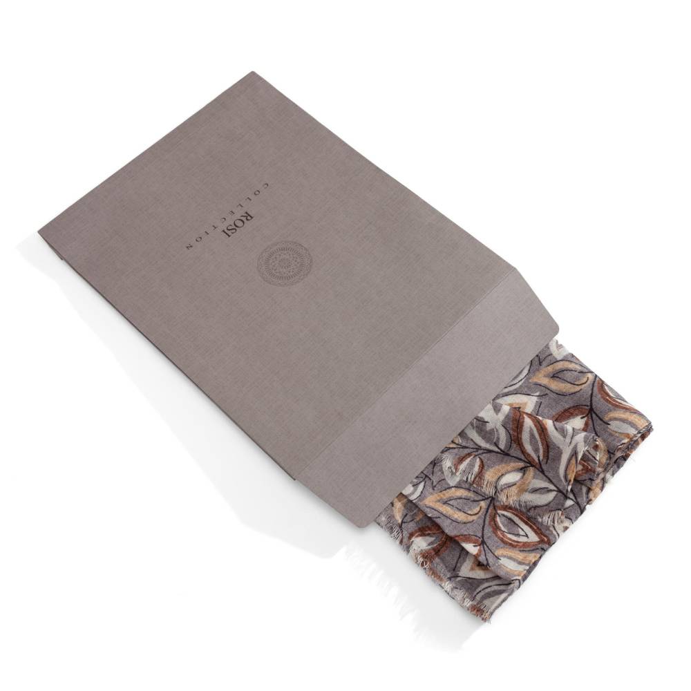 Роскошный шарф Rosi соткан из высококачественной тонкой шерстяной пряжи. Легкий, нежный и почти невесомый, он станет элегантным дополнением к любому классическому образу, добавив ненавязчивый акцент и нотку романтики. Полотно серо-коричневого цвета украшено изящным узором из листьев коричневых и бежевых оттенков. Благодаря оптимальному размеру, шарф легко повязывать всевозможными узлами, адаптируя под любой образ. Модель подходит как для мужчин, так и для женщин (унисекс). К аксессуару прилагается фирменный подарочный конверт.