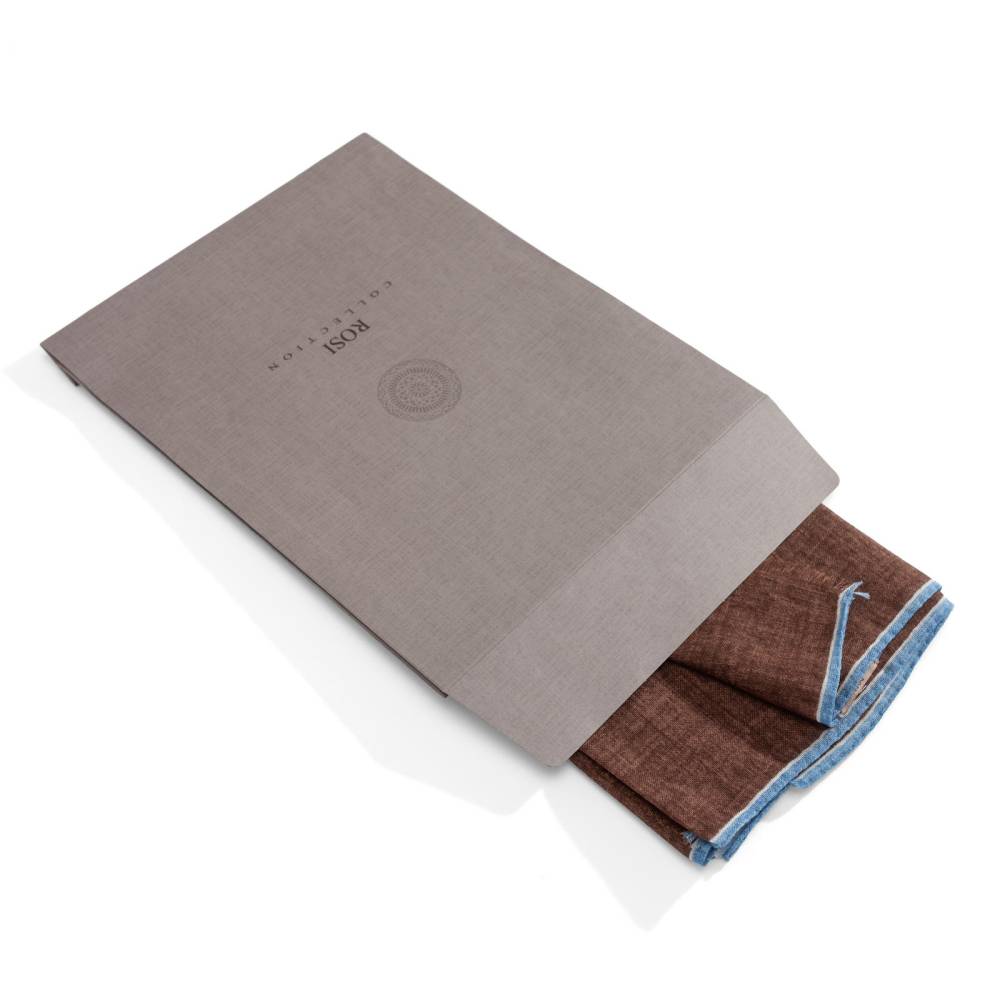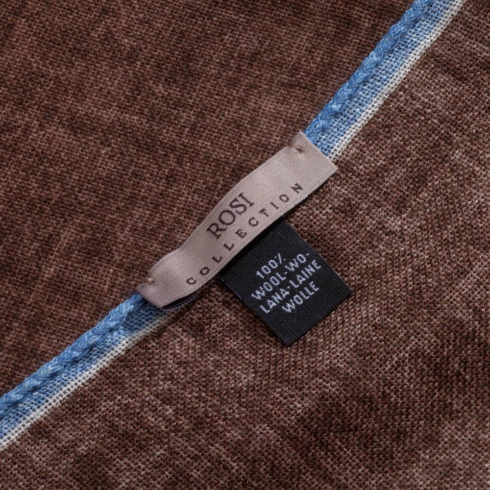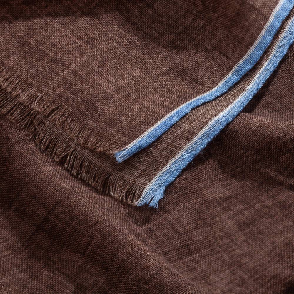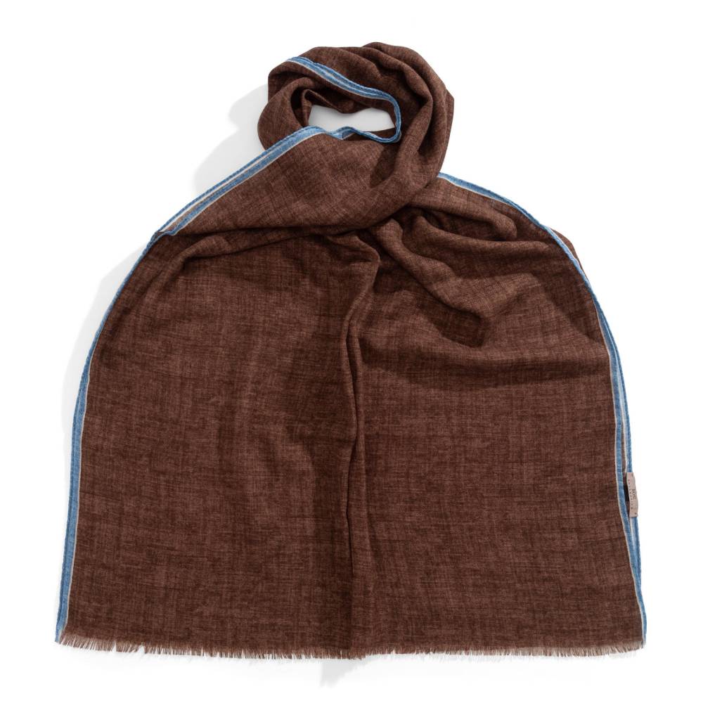 Роскошный шарф Rosi соткан из высококачественной тонкой шерстяной пряжи. Легкий, нежный и почти невесомый, он станет элегантным дополнением к любому классическому образу, добавив ненавязчивый акцент и нотку романтики. Полотно благородного коричневого цвета украшено изящной каймой голубого цвета. Оптимальный размер позволяет легко повязывать его всевозможными узлами, адаптируя под любой образ. Модель подходит как для мужчин, так и для женщин (унисекс). К аксессуару прилагается фирменный подарочный конверт.