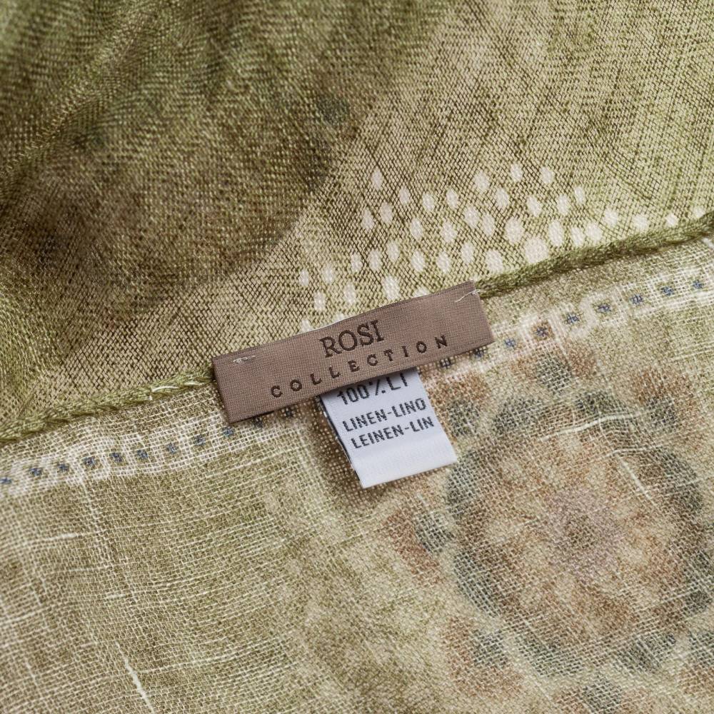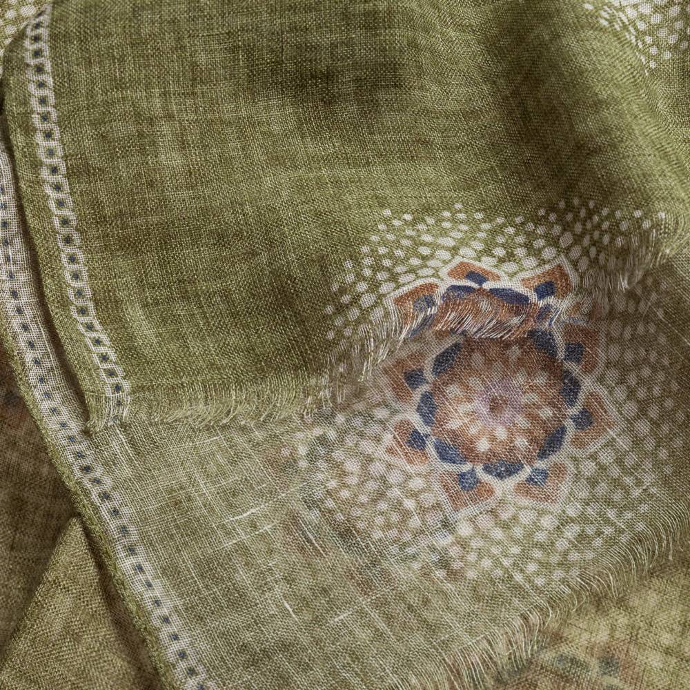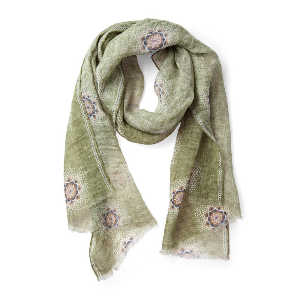 Лёгкий невесомый летний шарф итальянского бренда Rosi Collection приглушённого зелёного оттенка для мужчин и для женщин. Полностью выполнен из полупрозрачной льняной ткани, украшенной витиеватыми флористическими узорами. Размер шарфа позволяет удобно повязывать его всевозможными узлами. Превосходно подходит для непринужденных элегантных образов весной, ранней осенью, а также в прохладные летние вечера. К аксессуару прилагается фирменный подарочный конверт.