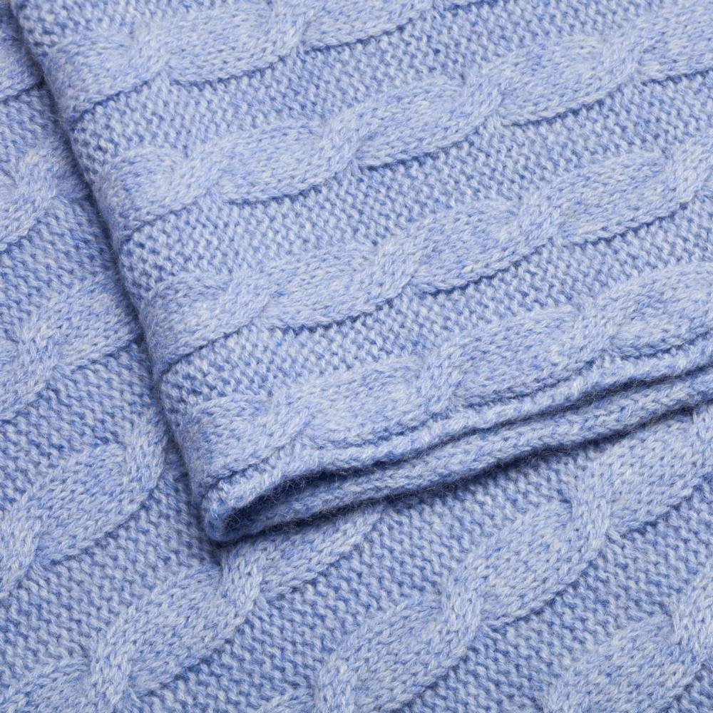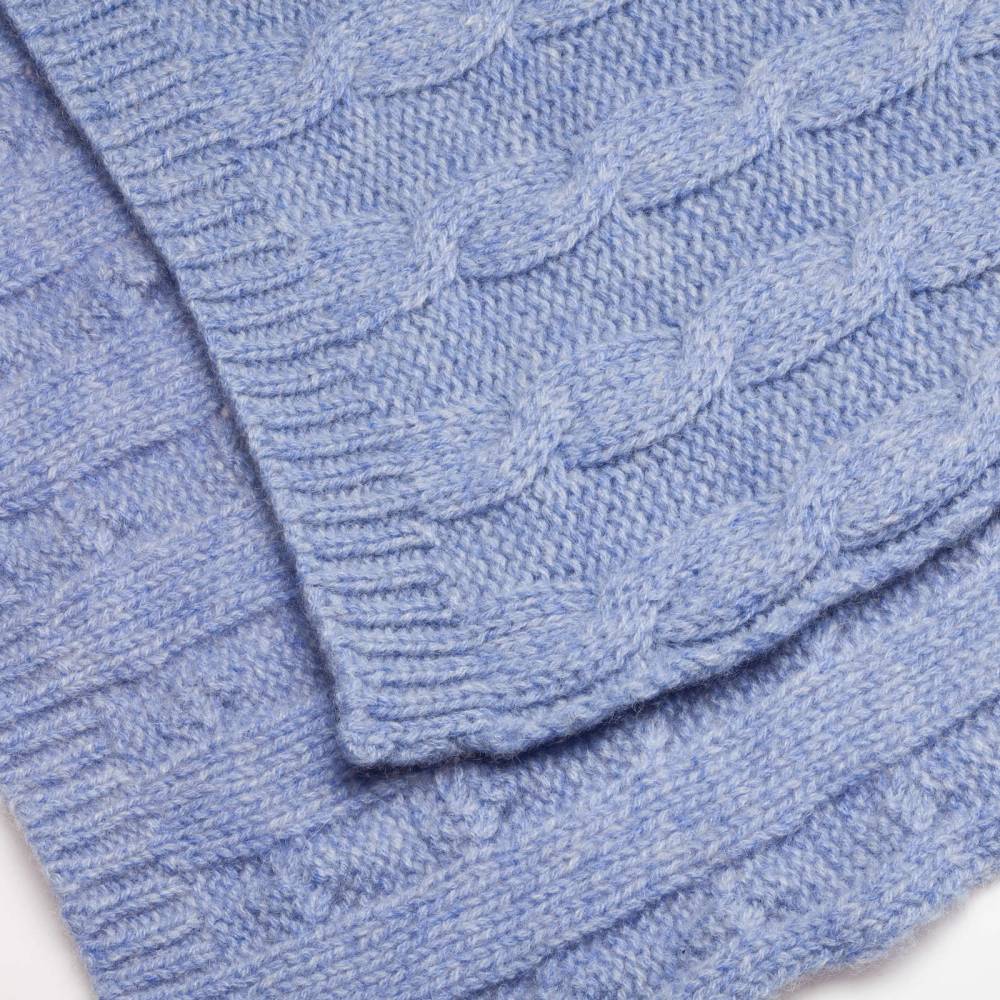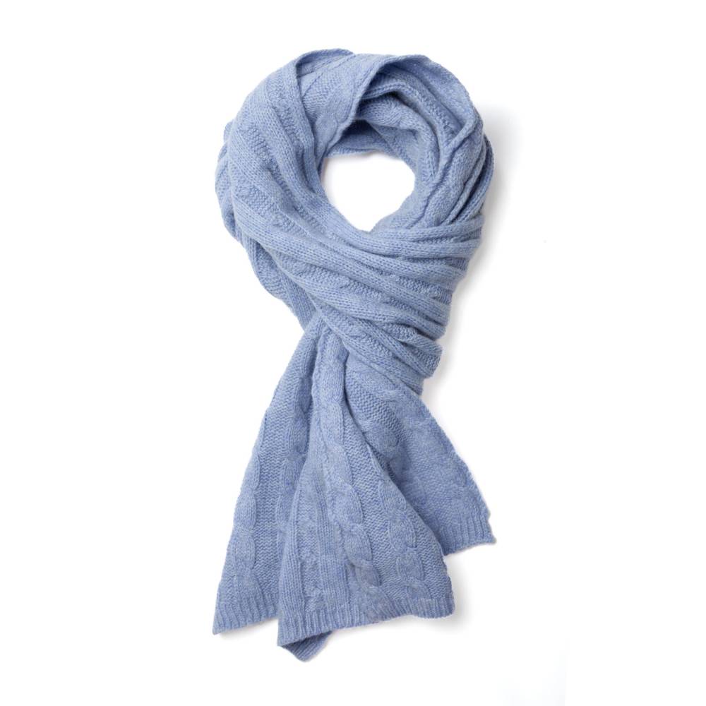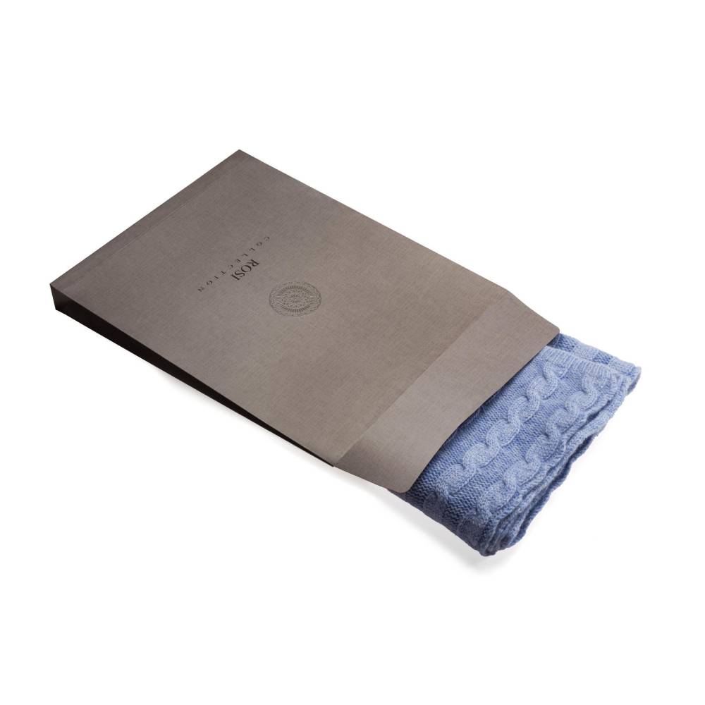 Однотонный классической шарф Rosi из нежного приятного на ощупь кашемира голубого цвета с фактурными косами. Модель украшена ненавязчивой ребристой фактурой по краям. Несмотря на свою мягкость шарф довольно плотный. Благодаря этому он не только согреет в холодную погоду, но и обеспечит защиту от ветра. Размер шарфа позволяет удобно повязывать его всевозможными узлами. Подходит как для мужчин, так и для женщин. К аксессуару прилагается фирменный подарочный конверт.