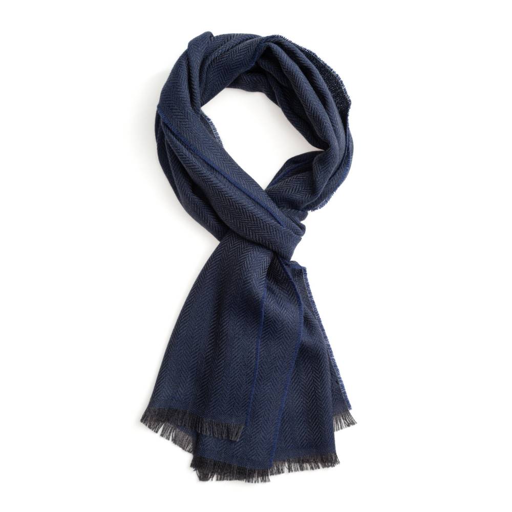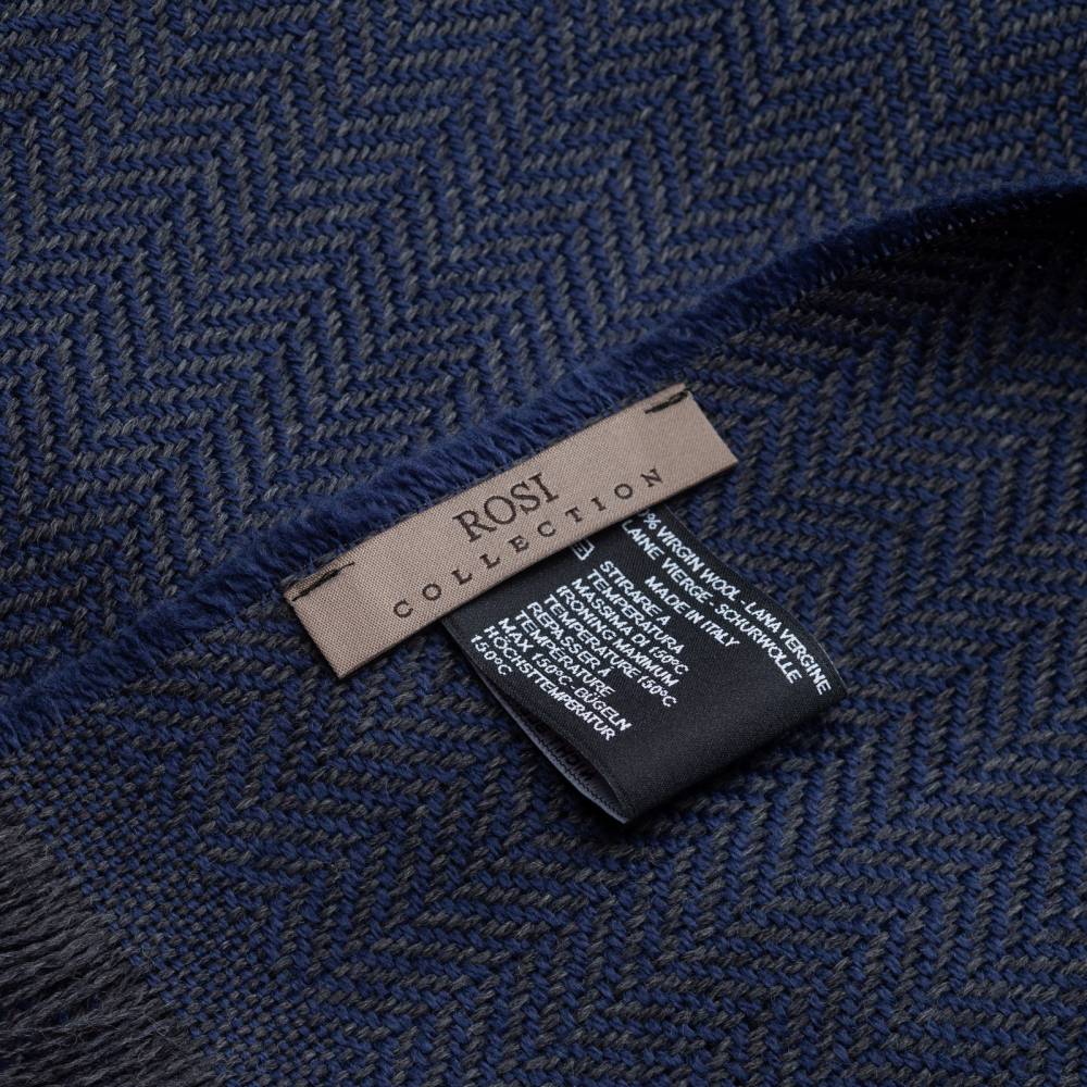 Мужской классической шарф Rosi, сотканный из высококачественной шерстяной пряжи тёмно-синего цвета с фактурным узором «ёлочка». Несмотря на свою мягкость шарф довольно плотный. Благодаря этому он не только согреет в холодную погоду, но и обеспечит защиту от ветра. Размер шарфа позволяет удобно повязывать его всевозможными узлами. К аксессуару прилагается фирменный подарочный конверт.