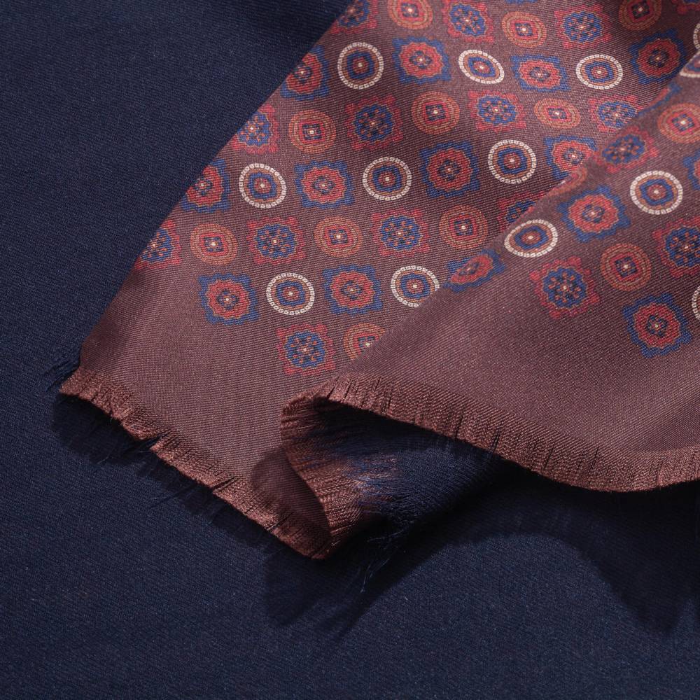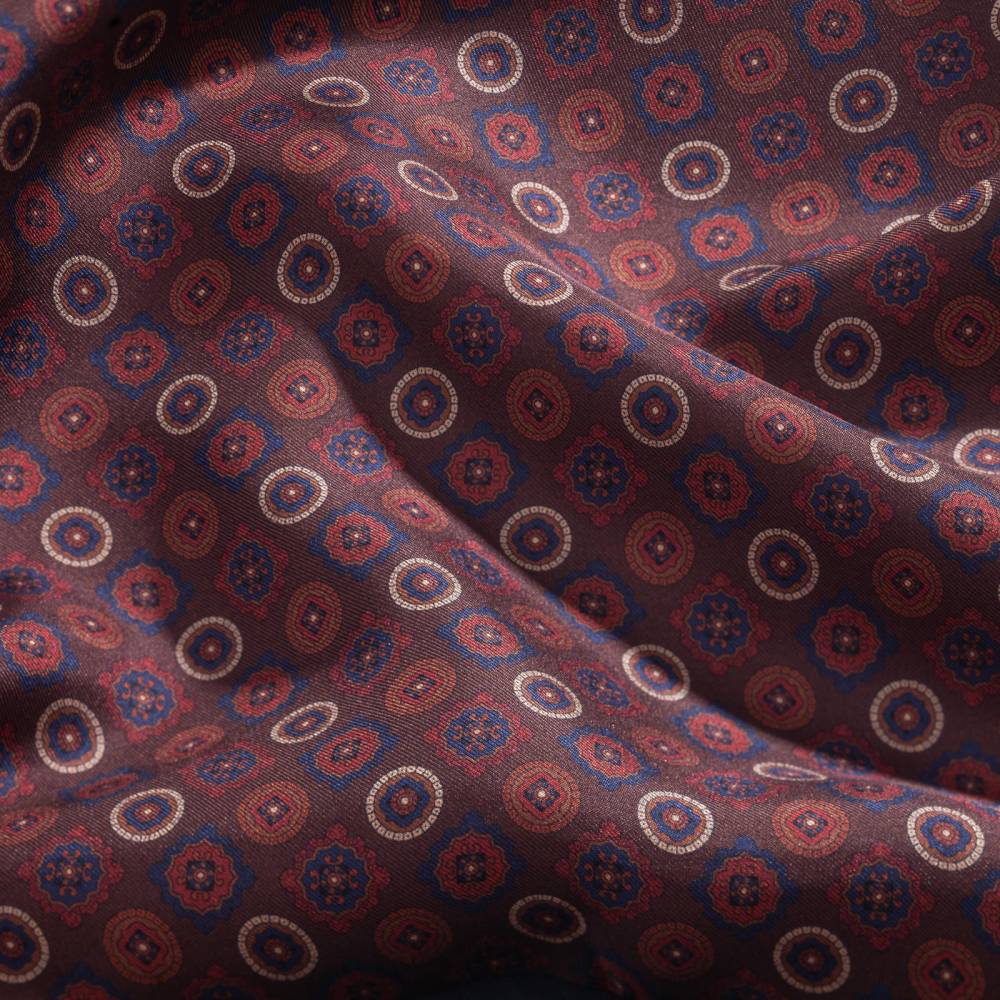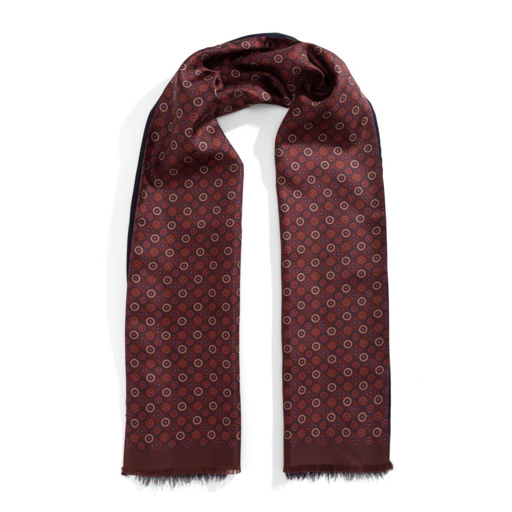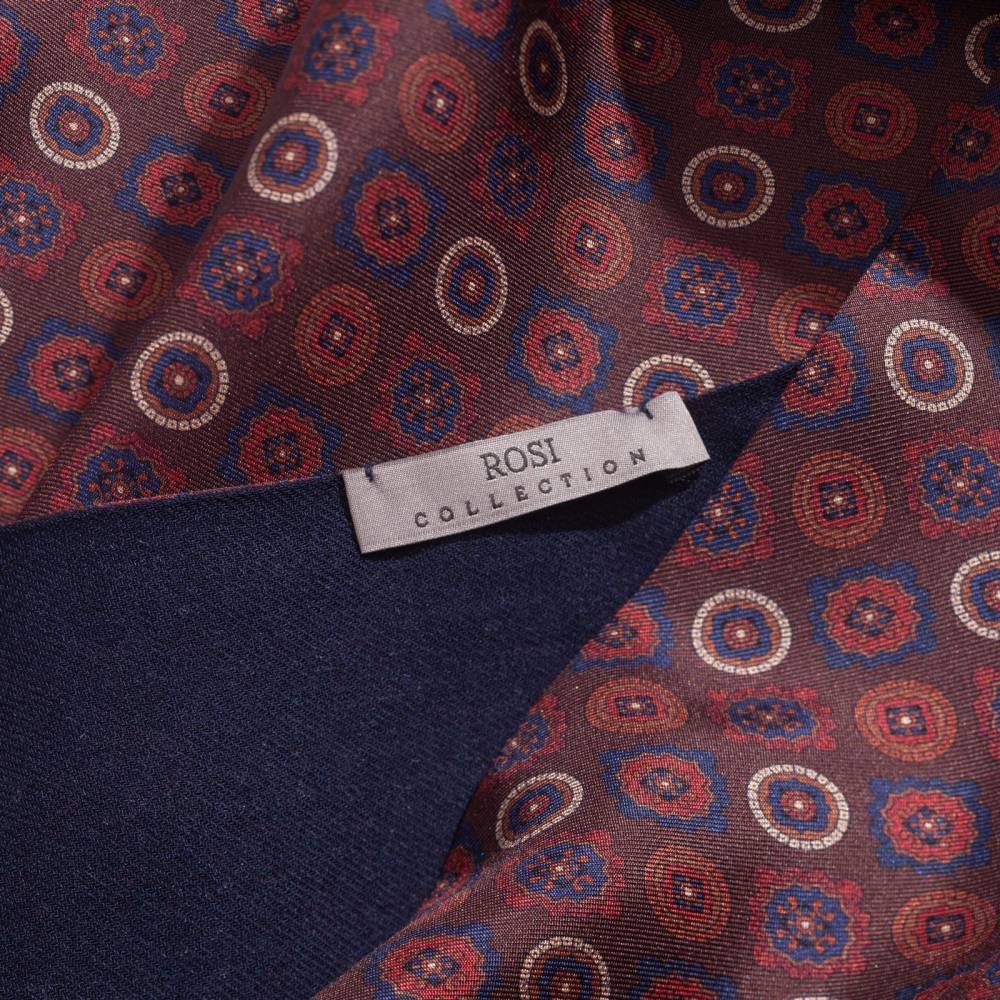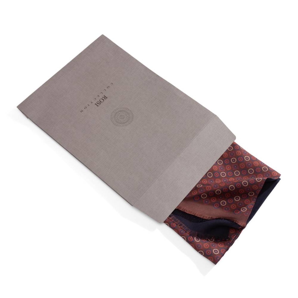 Вечерний двухсторонний шарф Rosi для важных, торжественных мероприятий и премьер. Превосходно сочетается с пальто и костюмом. С внешней стороны выполнен из гладкого шёлка, а с внутренней – из приятного на ощупь модала с добавлением кашемира. Полотно бордового цвета украшено ненавязчивым фуляровым орнаментом. К аксессуару прилагается фирменный подарочный конверт.