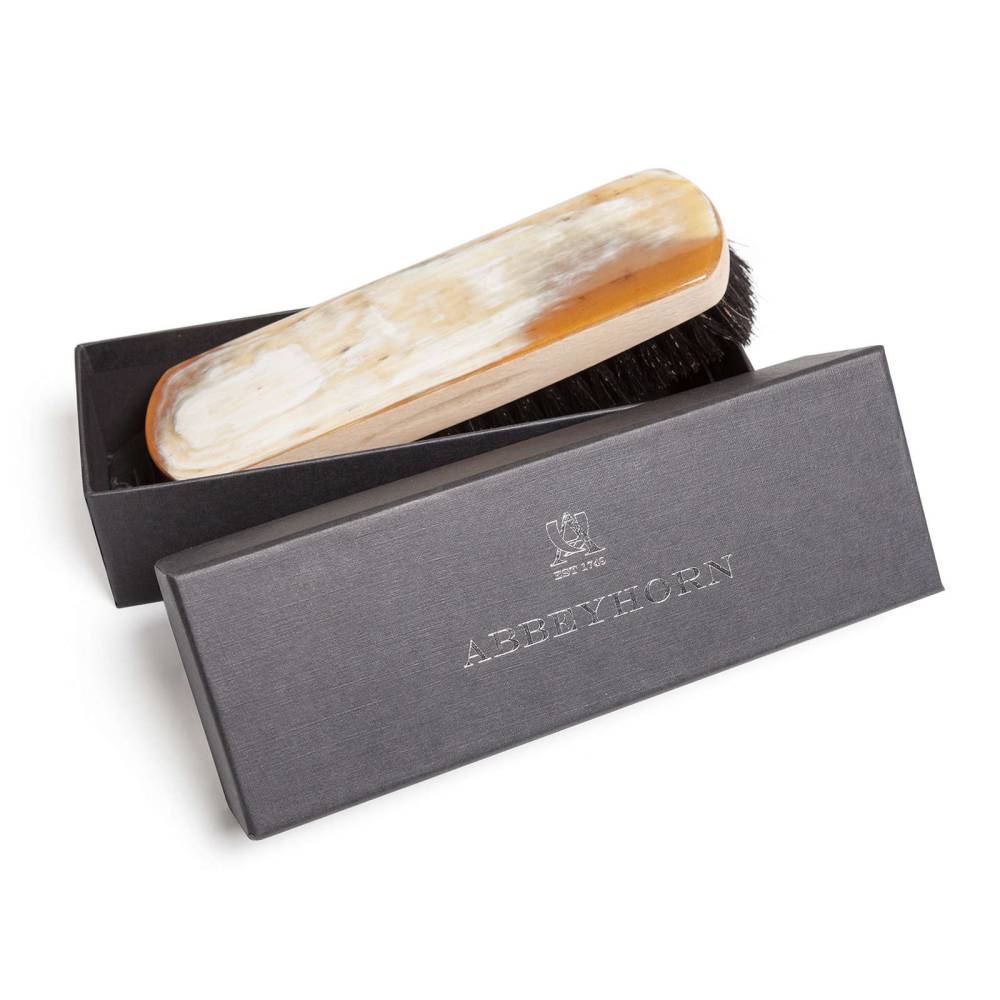 Коллекционная щётка Abbeyhorn для чистки и полировки дорогой обуви. Основа выполнена из древесины бука и дополнена цельной пластиной из обработанного рога вола. Щётка имеет мягкую густую щетину из натурального конского волоса чёрного цвета. Сбоку модель украшена логотипом бренда. Фирменная подарочная коробка прилагается.