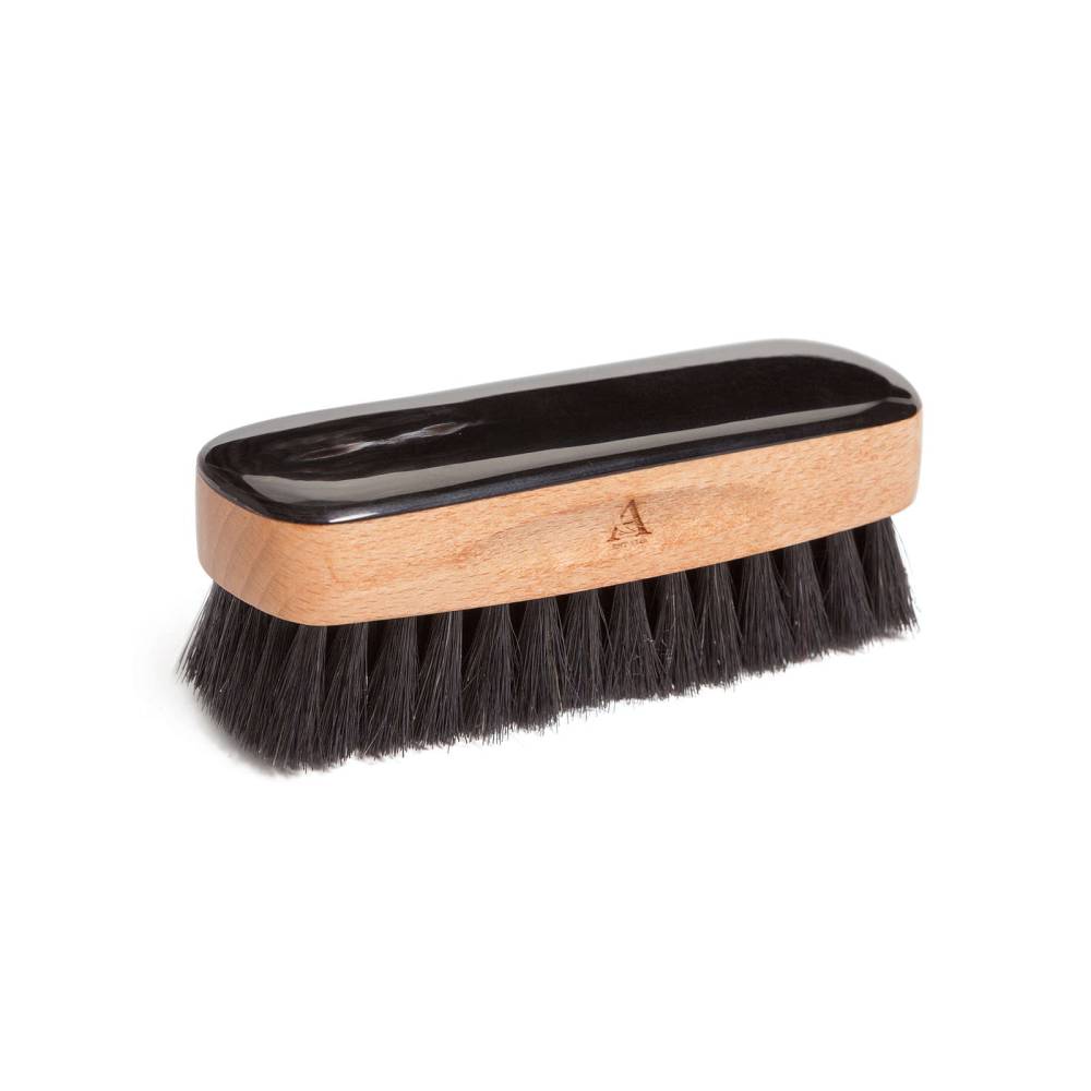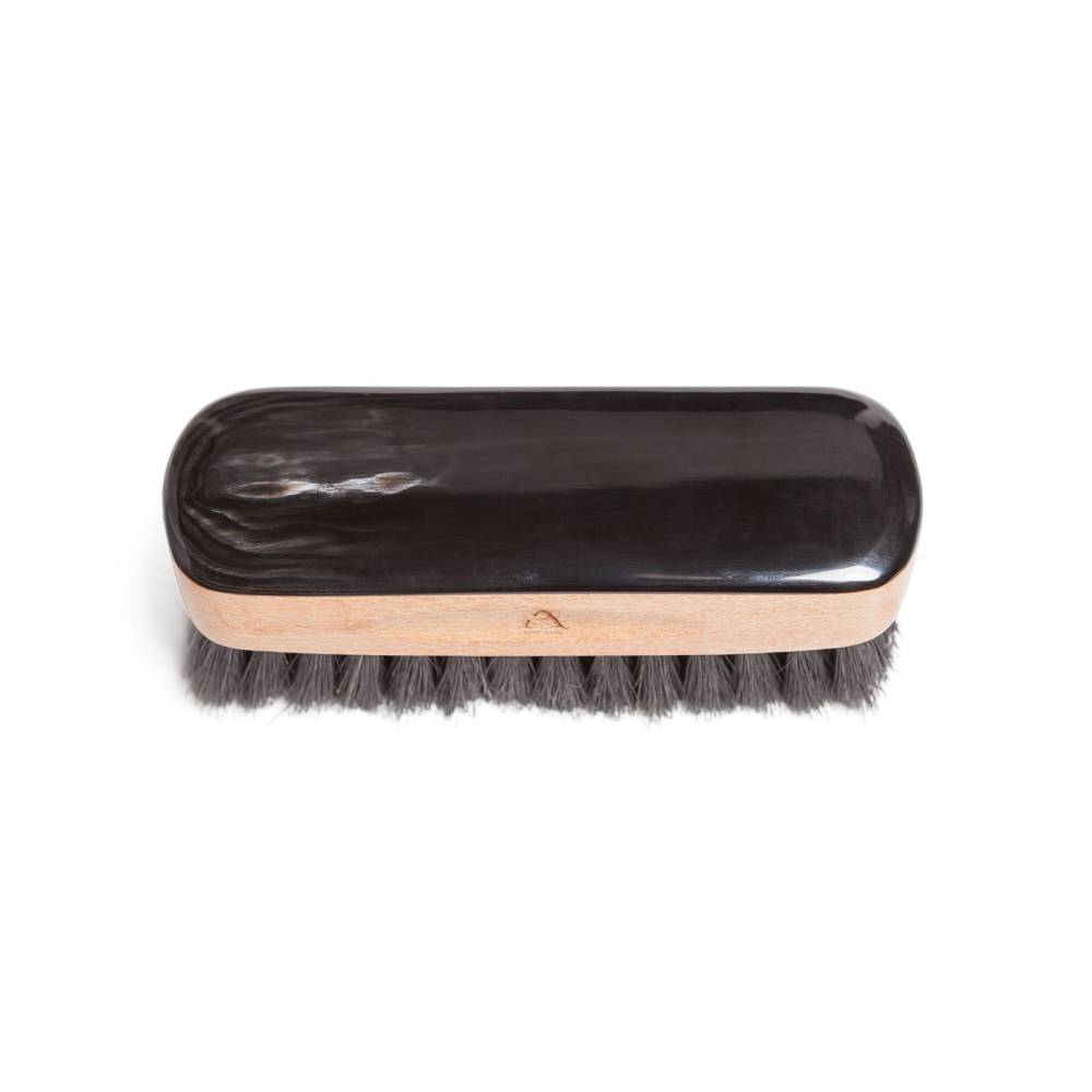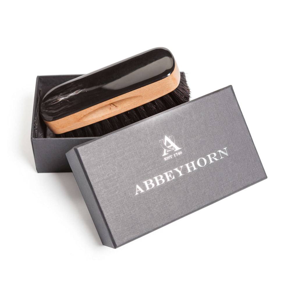 Коллекционная щётка Abbeyhorn для чистки и полировки дорогой обуви. Основа выполнена из древесины бука и дополнена цельной пластиной из обработанного рога вола. Щётка имеет мягкую густую щетину из натурального конского волоса чёрного цвета. Сбоку модель украшена логотипом бренда. Фирменная подарочная коробка прилагается.