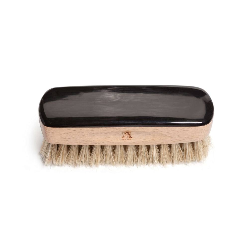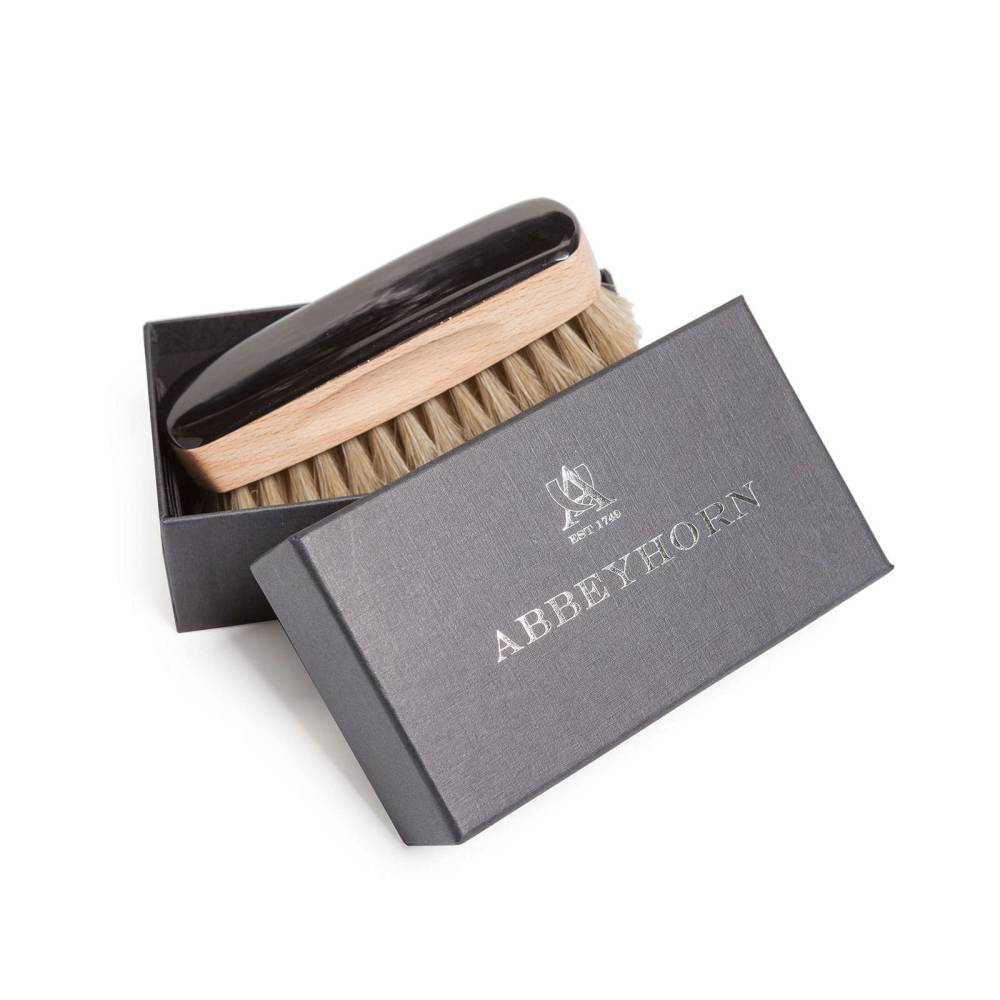 Коллекционная щётка Abbeyhorn для чистки и полировки дорогой обуви. Основа выполнена из древесины бука и дополнена цельной пластиной из обработанного рога вола. Щётка имеет мягкую густую щетину из натурального конского волоса бежевого цвета. Сбоку модель украшена логотипом бренда. Фирменная подарочная коробка прилагается.