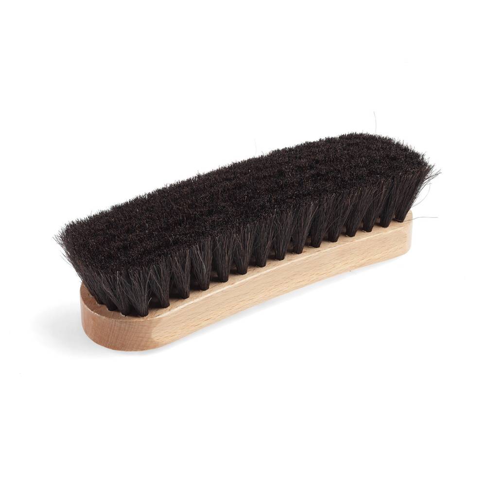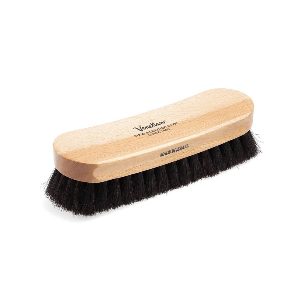 Высококачественная щётка для обуви из линейки Venetian. Основа из натурального дерева, щетина из 100% конского волоса чёрного цвета. Прекрасно распределяет крем и ваксу по поверхности кожи и позволяет добиться естественного блеска.