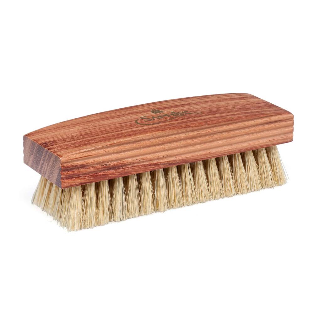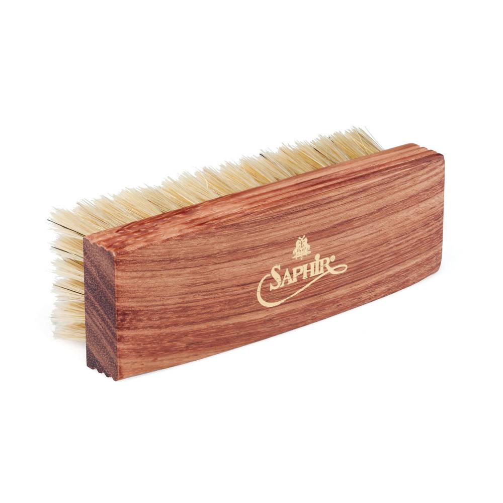 Благодаря эргономичной форме и ребристым боковым частям, щетка идеально лежит в руке и значительно облегчает процесс полировки и чистки обуви. Жёсткая щетина из прочного натурального конского волоса отлично подходит как для полировки гладкой кожи, так и для эффективного удаления грязи, пыли и излишков крема. Эта щетка — незаменимый инструмент для поддержания вашей обуви в идеальном состоянии и придания ей мягкого, естественного блеска, особенно на рельефной и текстурированной коже.