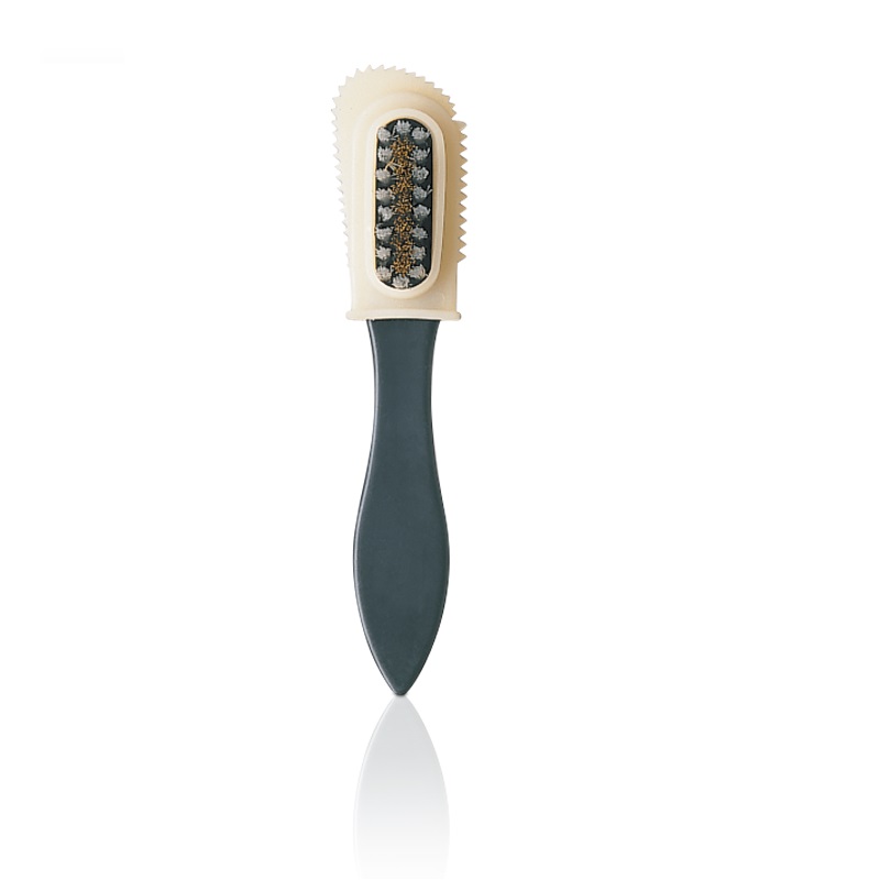 Щётка Solitaire предназначена для глубокой чистки нубука и замши. Щётка состоит из латунной щетины для удаления сильных загрязнений, острых выступов для чистки труднодоступных мест, и резинового ворса, позволяющего взъерошить очищенную поверхность.