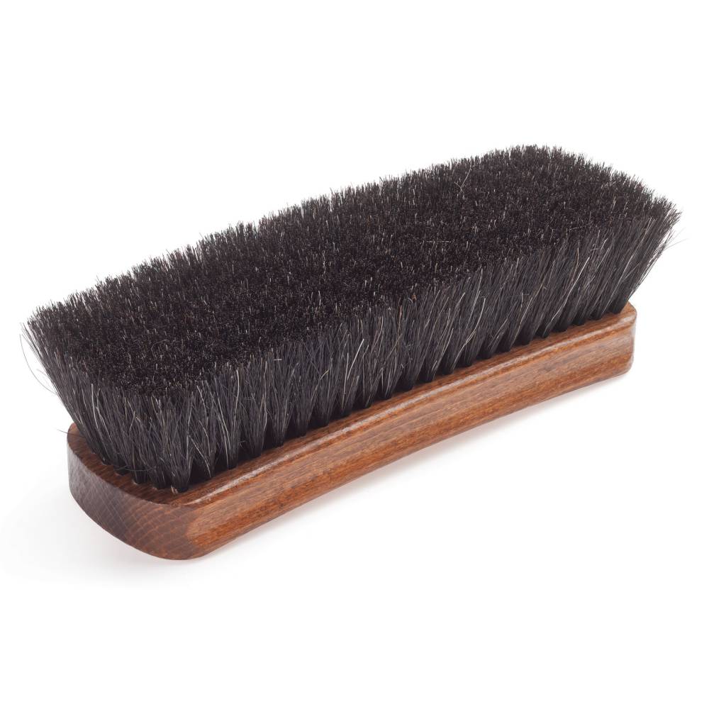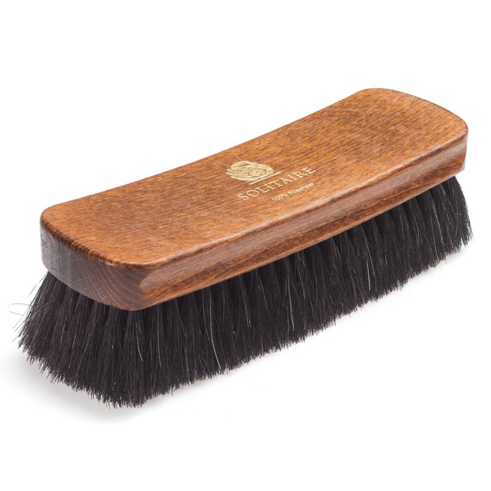 Большая щётка немецкой фирмы Solitaire c ворсом из натурального конского волоса чёрного цвета. Подходит для кремов на основе воска. Предназначена для полировки и распределения крема по коже. Основание выполнено из натурального дерева, выкрашенного в коричневый цвет и покрытого лаком.