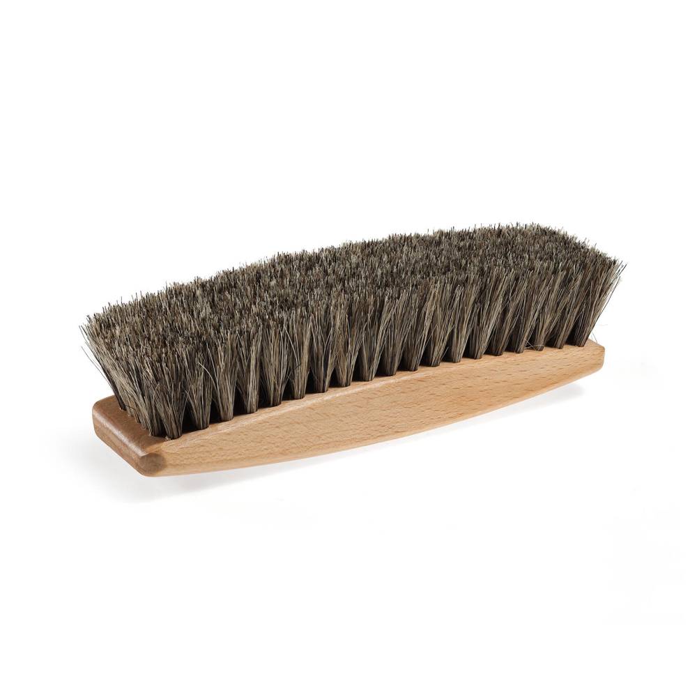 Щётка немецкой компании Tapir для чистки и полировки дорогой обуви. Основа выполнена из древесины бука. Модель имеет мягкую густую щетину из натурального конского волоса серого цвета.