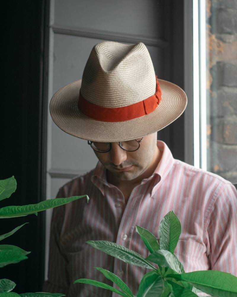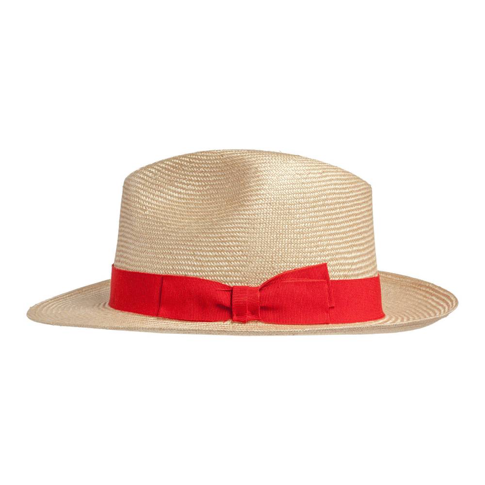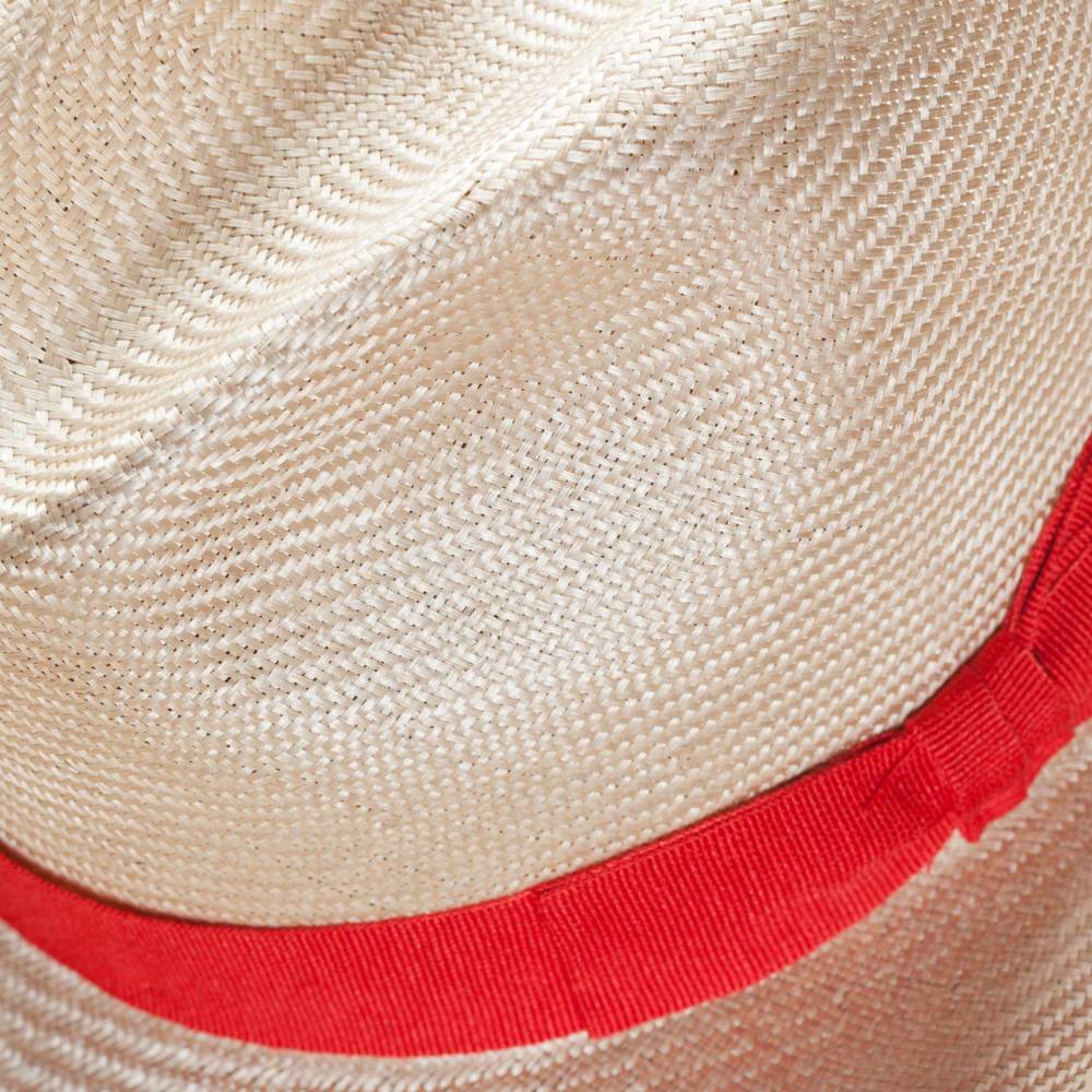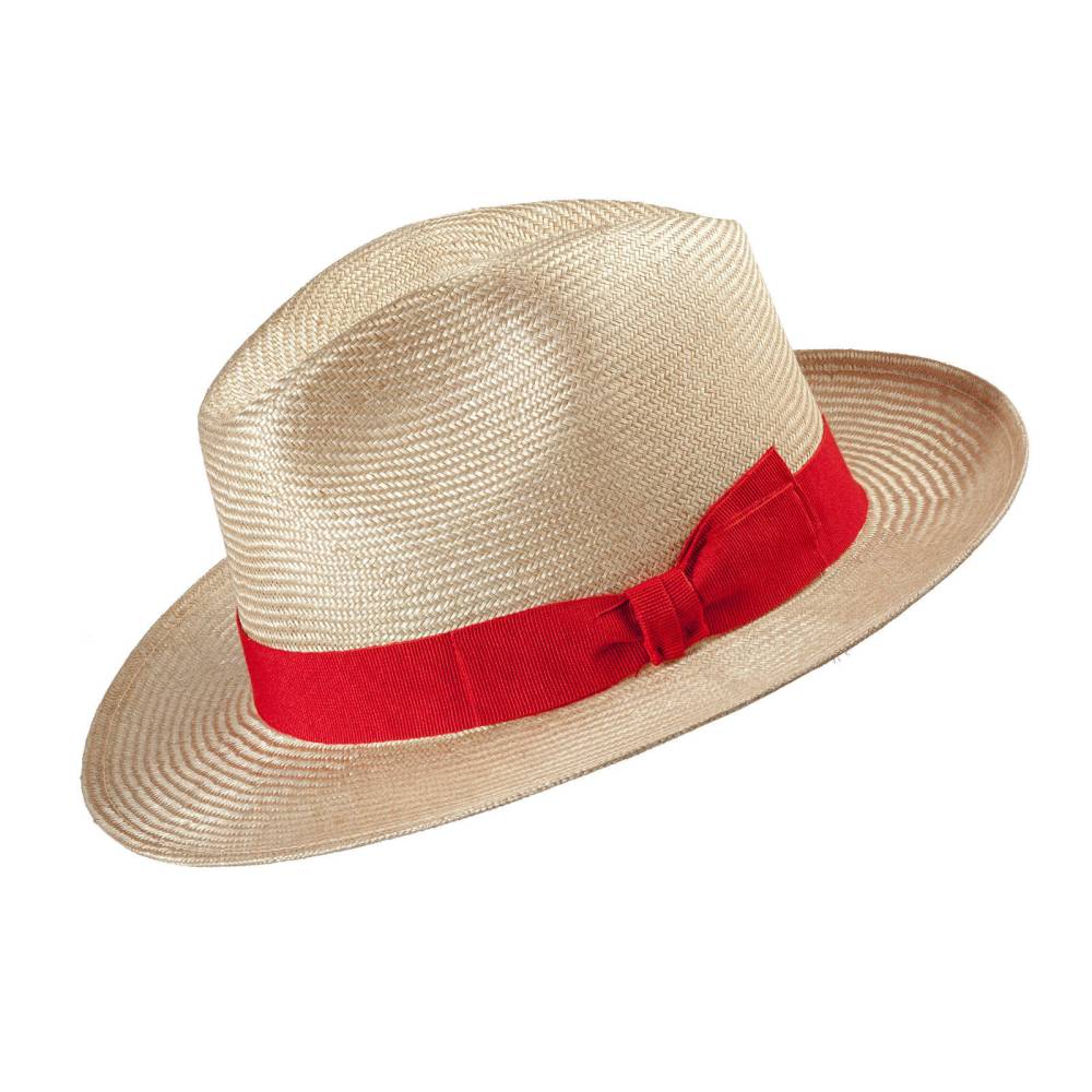 Летняя шляпа изготовлена итальянской мастерской Cappellificio Biellese из 100% сизаля наивысшего сорта (Agava sisolana). Благодаря тонкому плетению имеет эластичную структуру, не подвергается деформации и удобна в транспортировке. Особенностью шляпы является лёгкий золотистый оттенок. Верх по периметру украшен красной текстильной лентой с бантом.