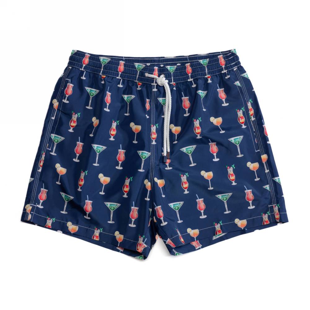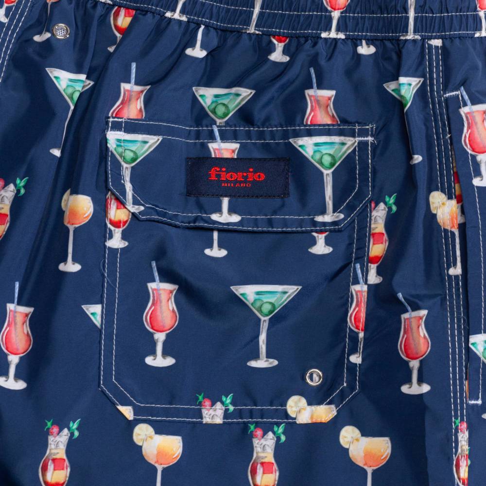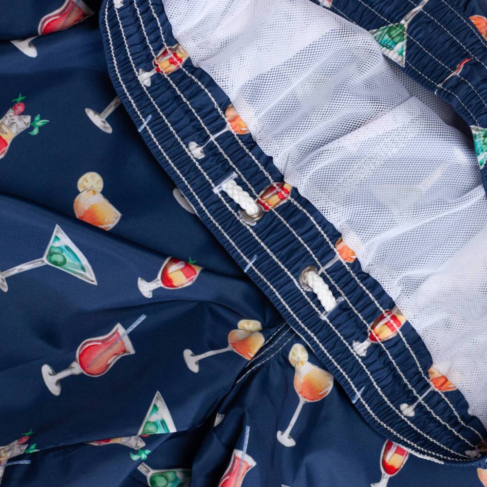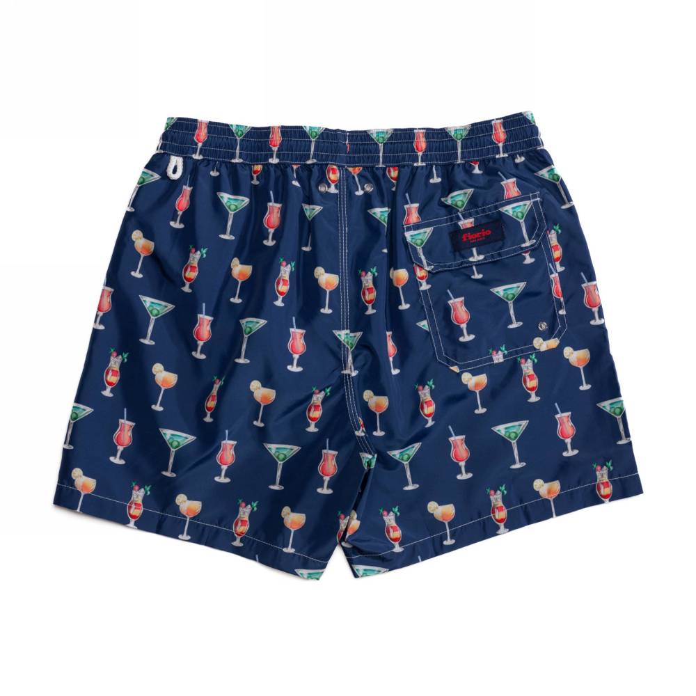 Яркие мужские плавательные шорты Fiorio Milano из тонкого гладкого полиэстера тёмно-синего цвета стандартного фасона (не узкие и не короткие). Модель украшена разноцветными принтами в виде коктейлей. Подкладка выполнена в форме трусов-брифов из белой сетки. Шорты оснащены двумя боковыми карманами и одним задним карманом с клапаном на липучке. На поясе модель затягивается при помощи текстильного шнурка. Слева на поясе шорты дополнены петлёй, за которую их удобно подвешивать в раздевалке или во время сушки. К шортам прилагается прозрачный пакет Zip Loсk.