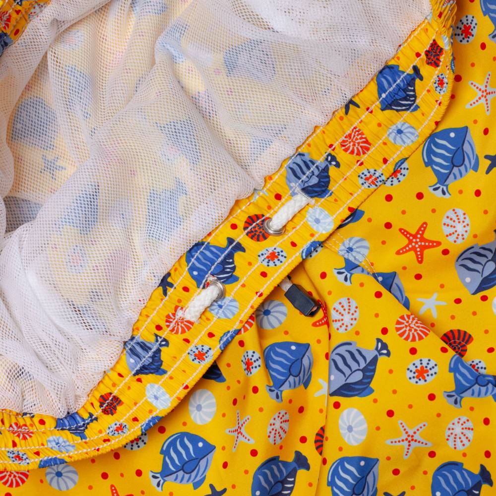 Яркие мужские плавательные шорты Fiorio Milano из тонкого гладкого полиэстера жёлтого цвета стандартного фасона (не узкие и не короткие). Модель украшена разноцветными принтами морской флоры и фауны. Подкладка выполнена в форме трусов-брифов из белой сетки. Шорты оснащены двумя боковыми карманами и одним задним карманом с клапаном на липучке. На поясе модель затягивается при помощи текстильного шнурка. Слева на поясе шорты дополнены петлёй, за которую их удобно подвешивать в раздевалке или во время сушки. К шортам прилагается прозрачный пакет Zip Loсk.