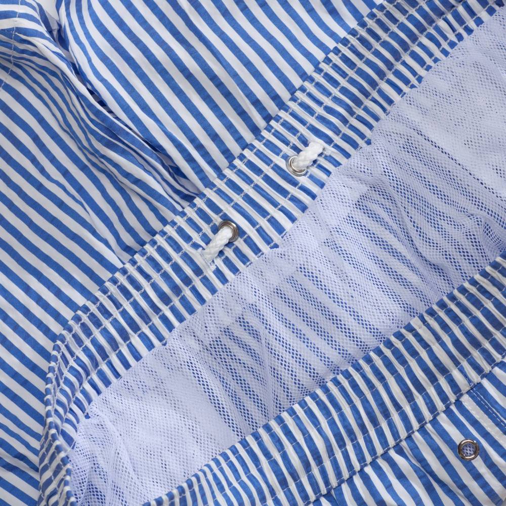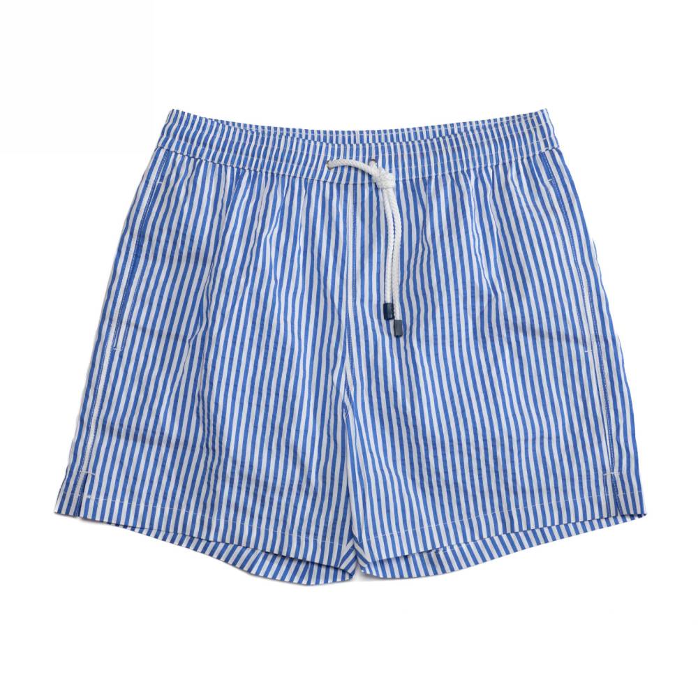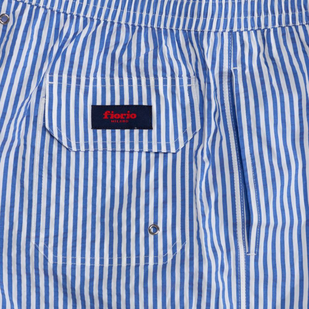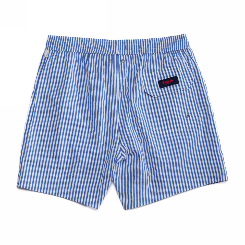Классические мужские плавательные шорты Fiorio Milano из фактурной смесовой ткани в полоску, напоминающей сирсакер. Обладают стандартным фасоном — не узкие и не короткие. Подкладка выполнена в форме трусов-брифов из белой сетки. Шорты оснащены двумя боковыми карманами и одним задним карманом с клапаном на липучке. На поясе модель затягивается при помощи текстильного шнурка. Слева на поясе шорты дополнены петлёй, за которую их удобно подвешивать в раздевалке или во время сушки. К шортам прилагается прозрачный пакет Zip Loсk.