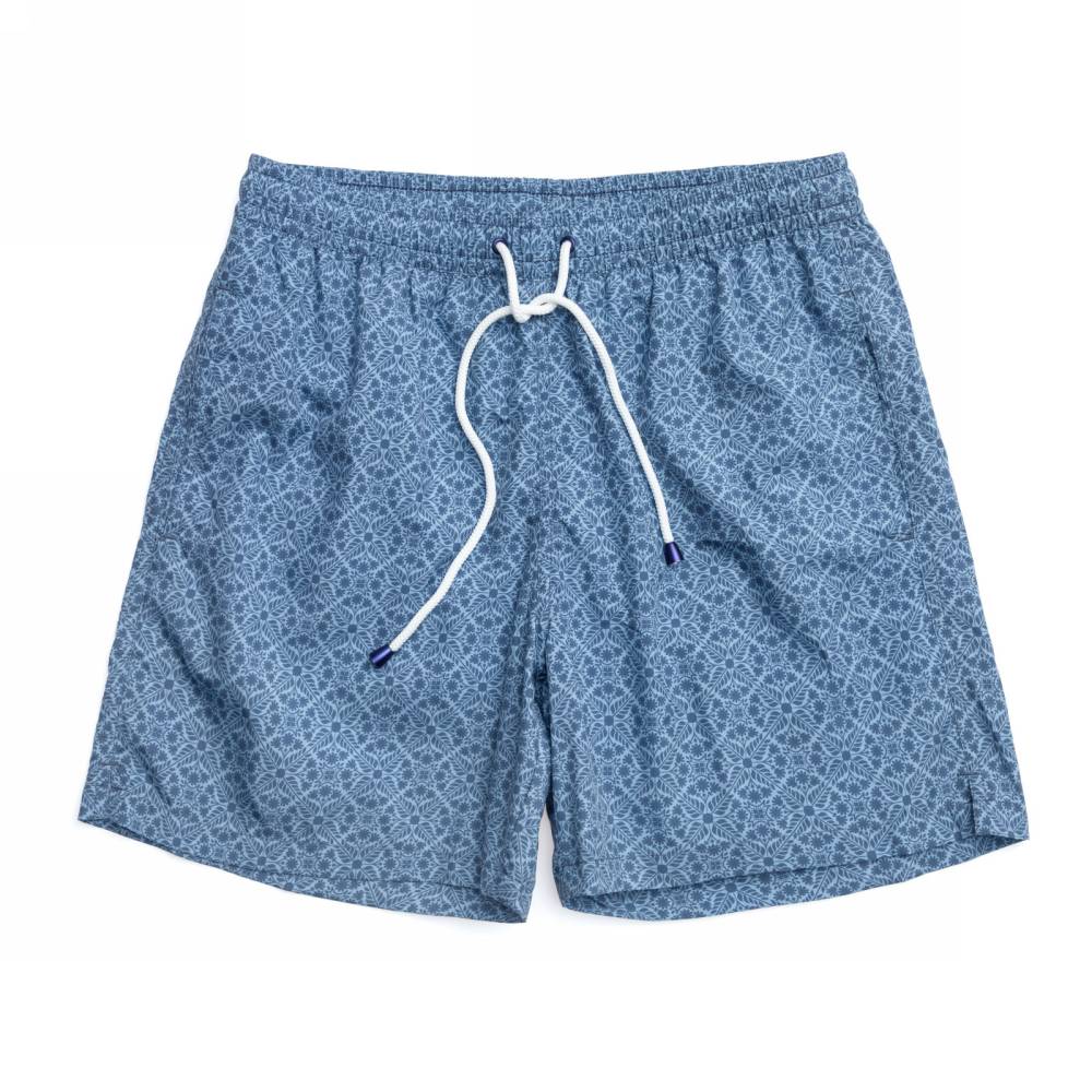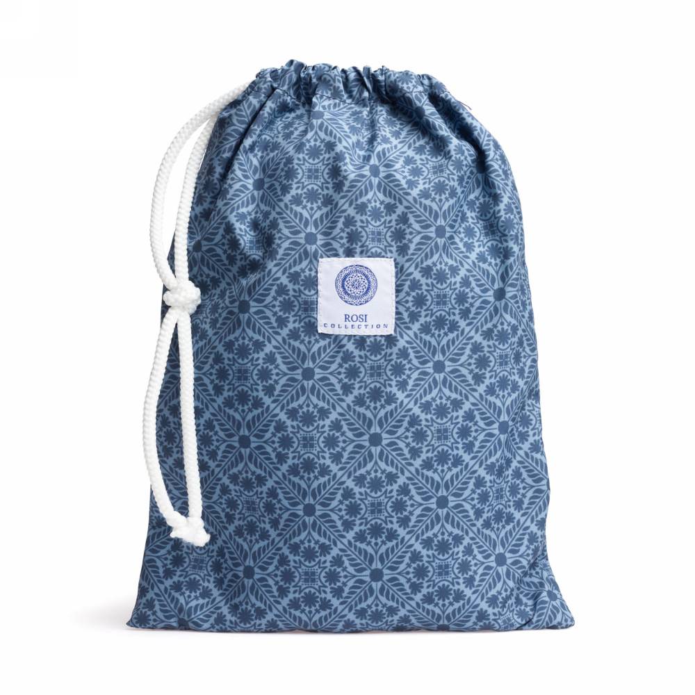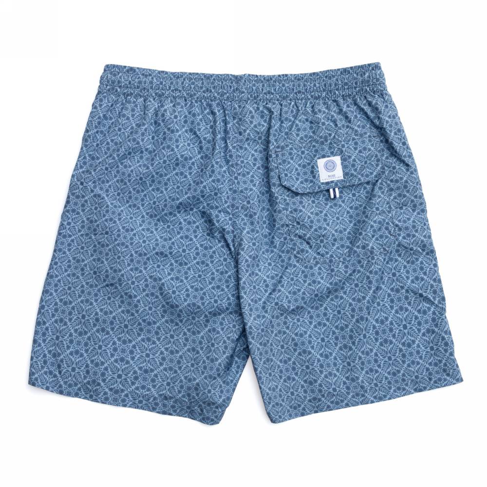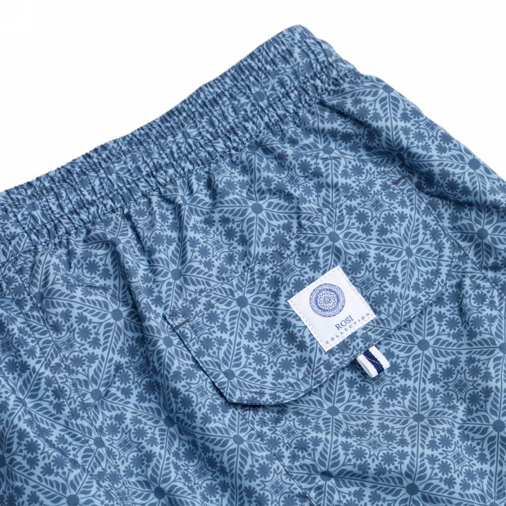 Плавательные шорты Rosi Collection из тонкого быстросохнущего полиэстера синего цвета стандартного фасона (не узкие и не короткие). Ткань украшена абстрактным флористическим принтом. Подкладка выполнена в форме трусов-брифов из белой сетки. Шорты оснащены двумя боковыми карманами и одним задним карманом с клапаном на липучке. На поясе модель затягивается при помощи текстильного шнурка. К шортам прилагается мешочек из такой же ткани.