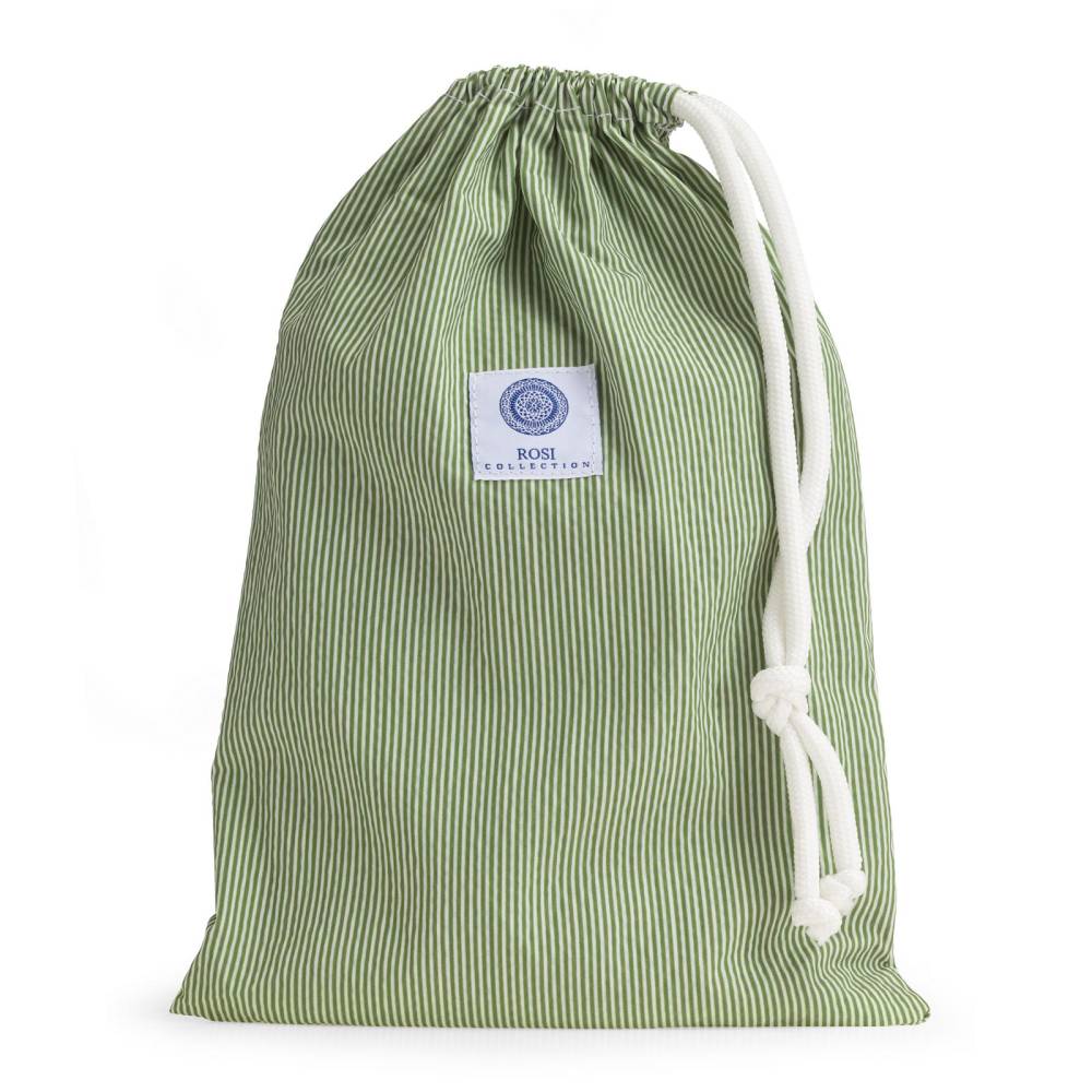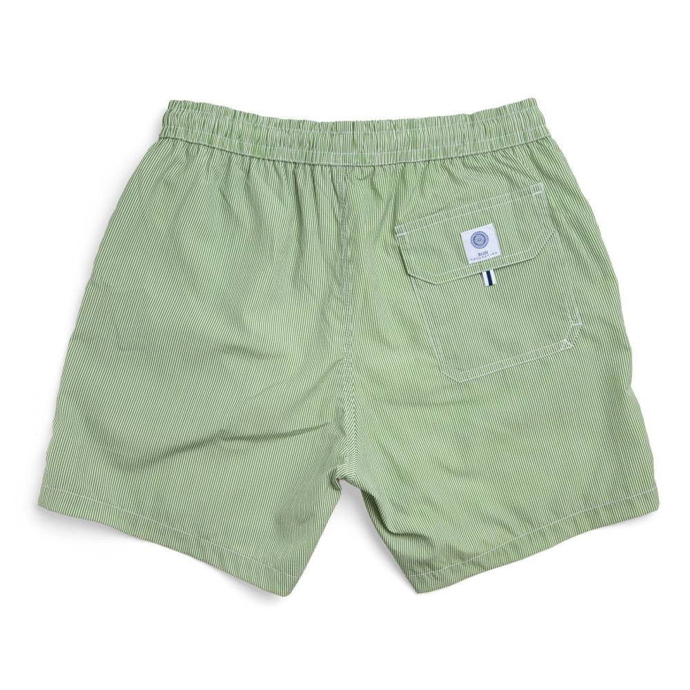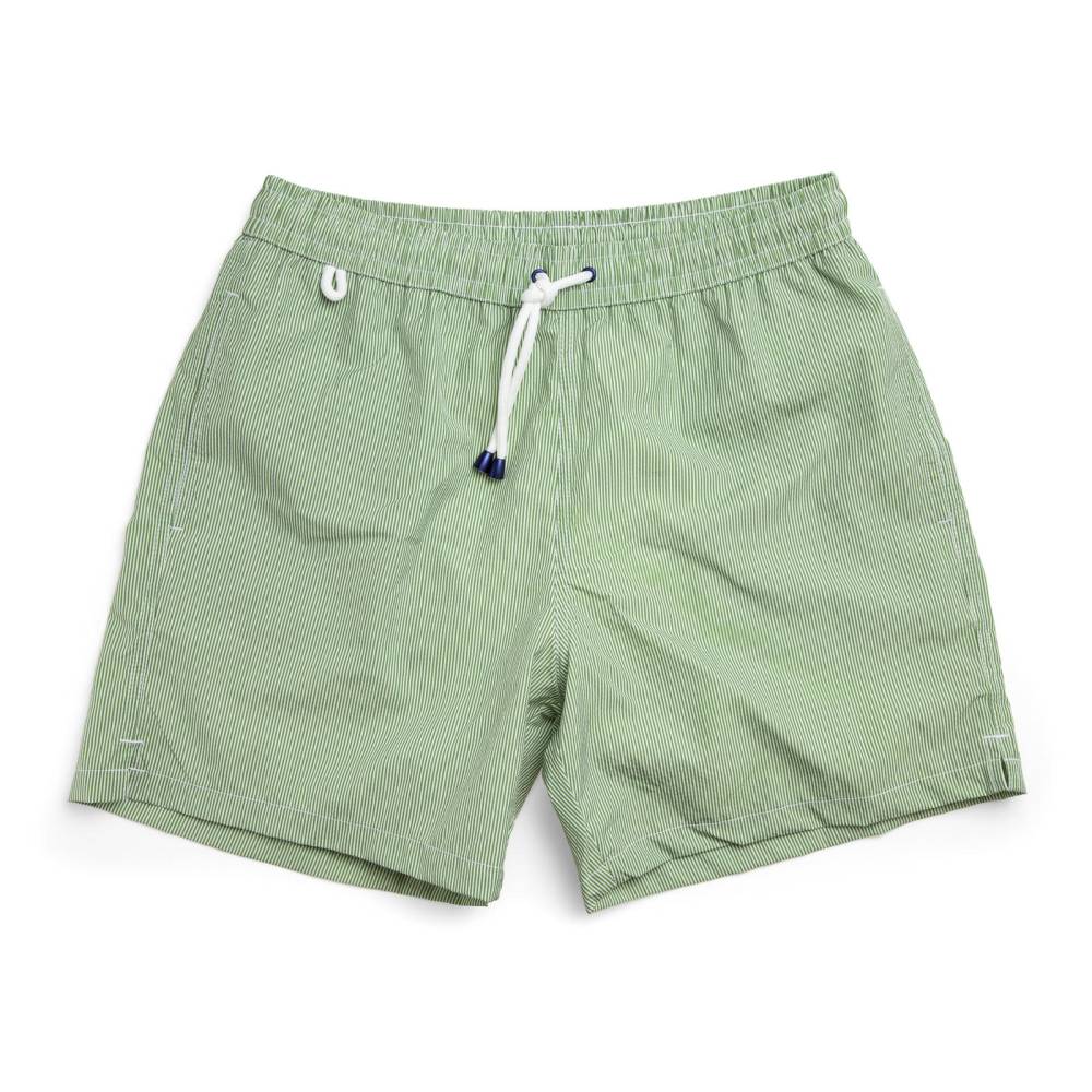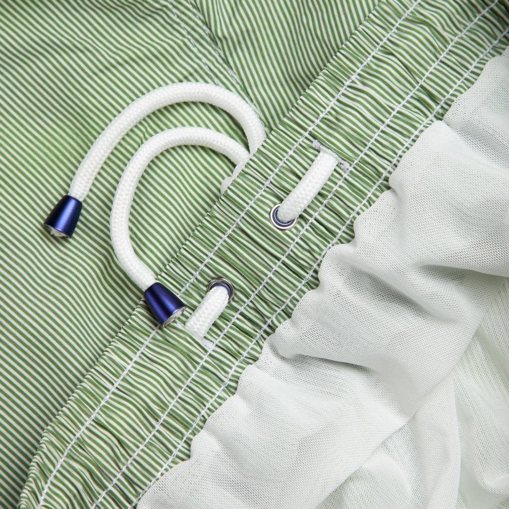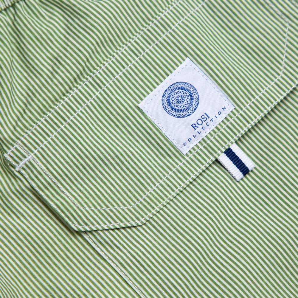 Плавательные шорты Rosi Collection из тонкого быстросохнущего полиэстера зелёного цвета стандартного фасона (не узкие и не короткие). Модель украшена принтом, имитирующим фактурную полосатую ткань сирсакер. Подкладка выполнена в форме трусов-брифов из белой сетки. Шорты оснащены петлёй для подвешивания в раздевалке, двумя боковыми карманами и одним задним карманом с клапаном на липучке. На поясе модель затягивается при помощи текстильного шнурка. К шортам прилагается мешочек из такой же ткани.