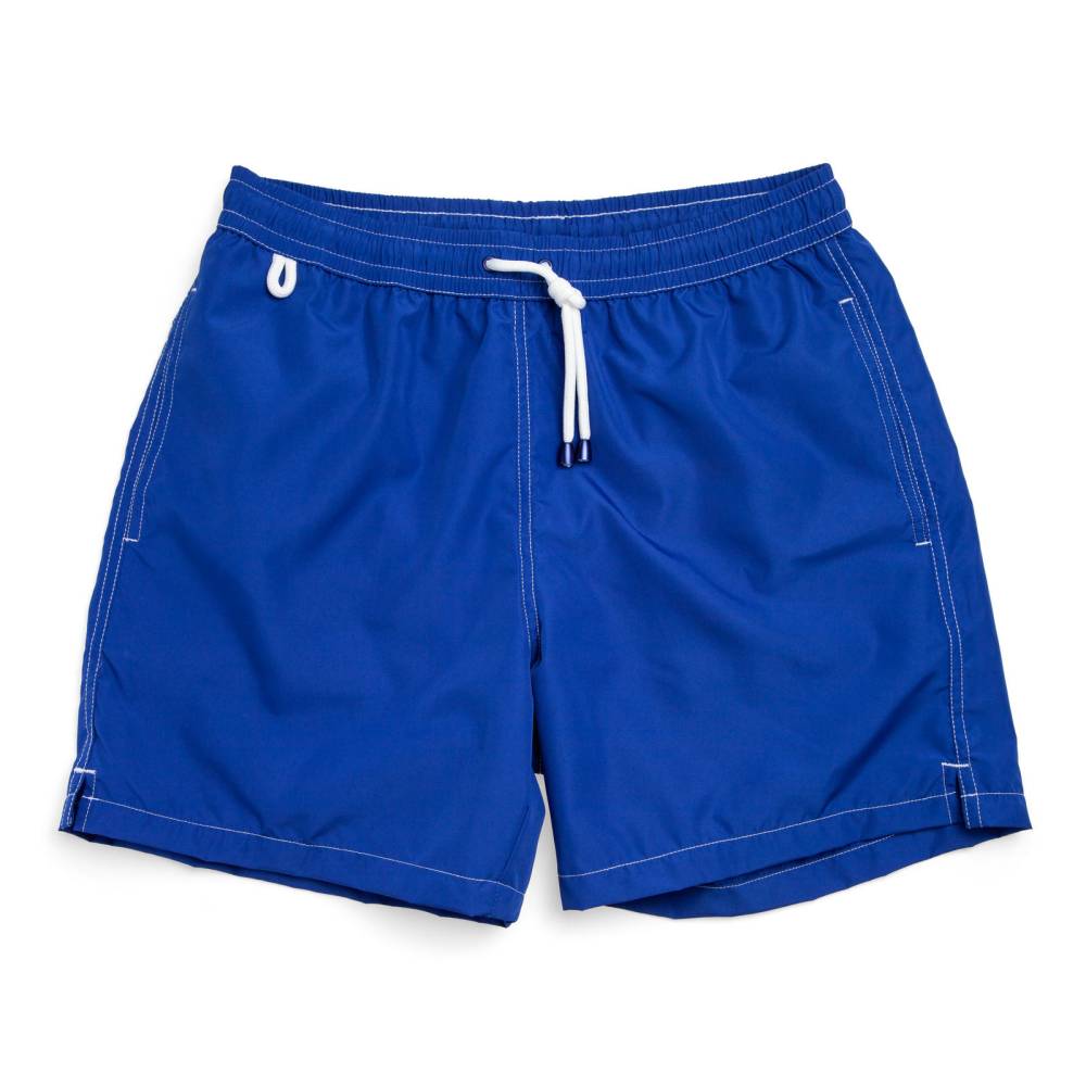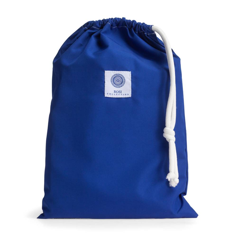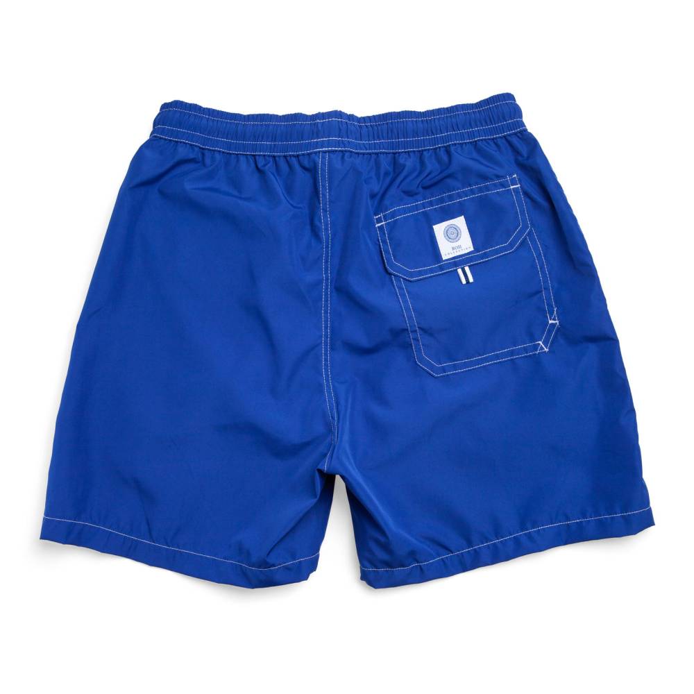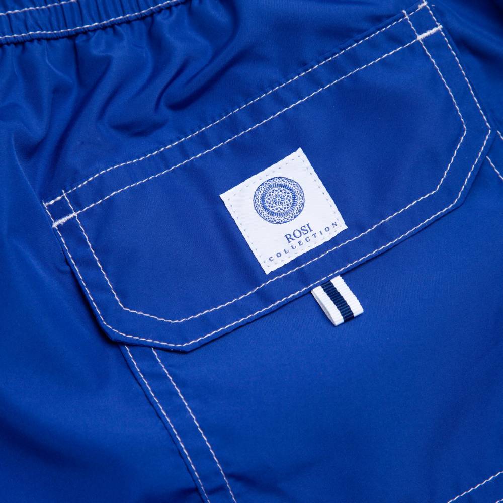 Плавательные шорты Rosi Collection из тонкого быстросохнущего полиэстера синего цвета стандартного фасона (не узкие и не короткие). Подкладка выполнена в форме трусов-брифов из белой сетки. Шорты оснащены петлёй для подвешивания в раздевалке, двумя боковыми карманами и одним задним карманом с клапаном на липучке. На поясе модель затягивается при помощи текстильного шнурка. К шортам прилагается мешочек из такой же ткани.