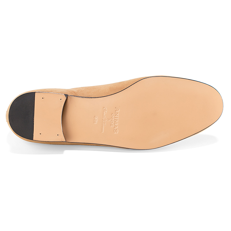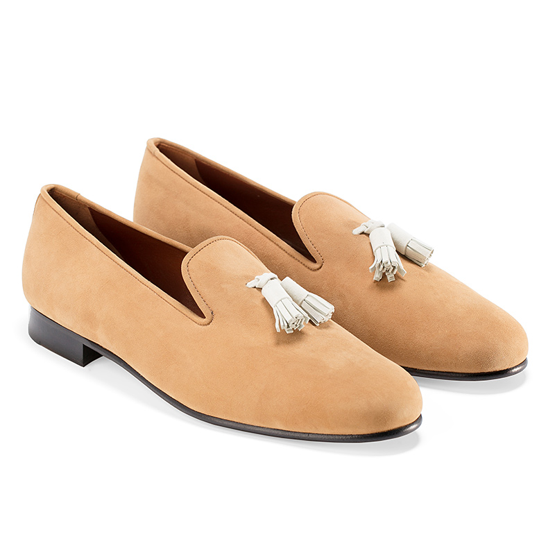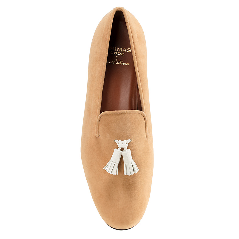 Мужские слиперы Aminas Code Х Checkroom на тонкой кожаной подошве тёмно-коричневого цвета. Внутренняя отделка из кожи. С внешней стороны бархатистая замша песочного оттенка. На подъёме слиперы украшены кожаными кисточками.