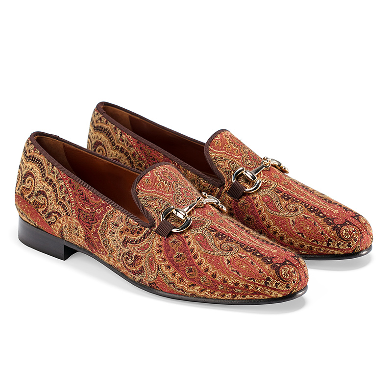 Мужские слиперы Aminas Code X Checkroom на тонкой кожаной подошве тёмно-коричневого. С внешней стороны модель выполнена из яркого текстиля с восточным узором. Внутренняя отделка из тонкой кожи. На подъёме модель украшена пряжкой из полированного металла.