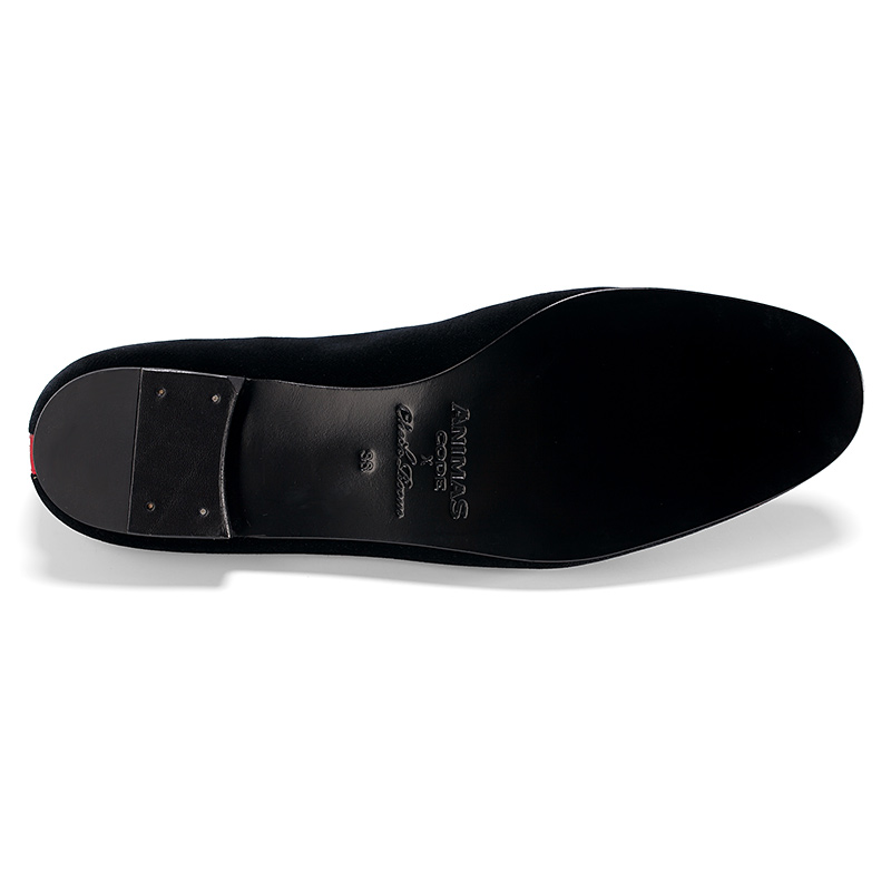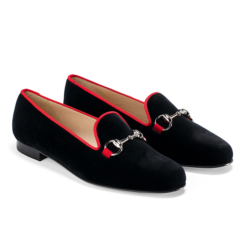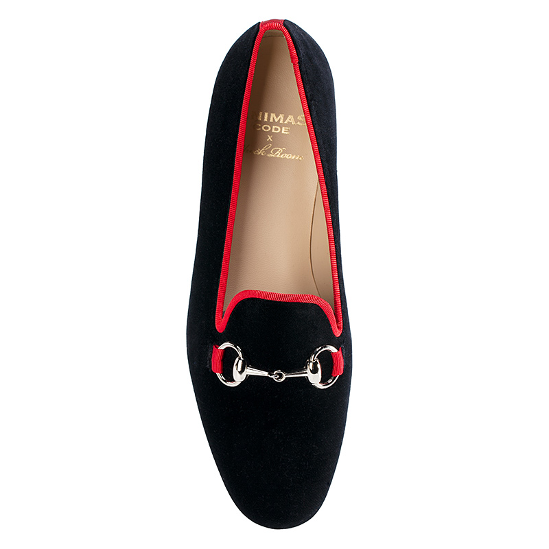 Женские слиперы Aminas Code X Checkroom на тонкой кожаной подошве. С внешней стороны модель выполнена из чёрного бархата и дополнена текстильной окантовкой ярко-красного цвета. Внутренняя отделка из тонкой кожи кремового оттенка. На подъёме модель украшена пряжкой из полированного металла.