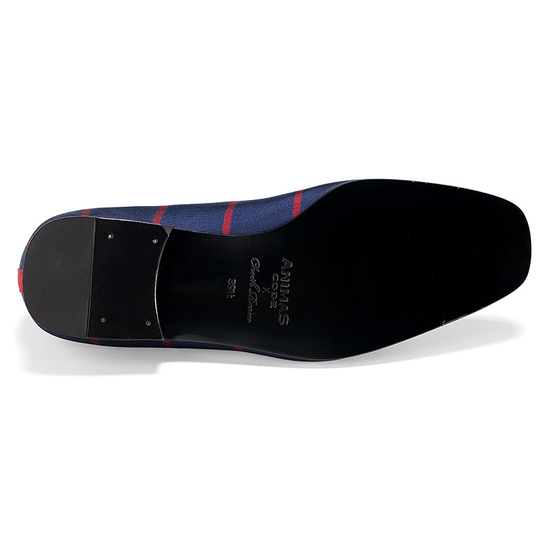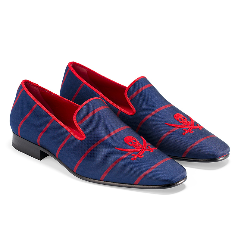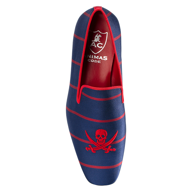 Мужские слиперы Aminas Code X Checkroom на тонкой кожаной подошве. С внешней стороны модель выполнена из шёлка синего цвета с красными полосами. Внутренняя отделка из ярко-красной кожи. Мыс украшен вышивкой в виде Веселого Роджера.
