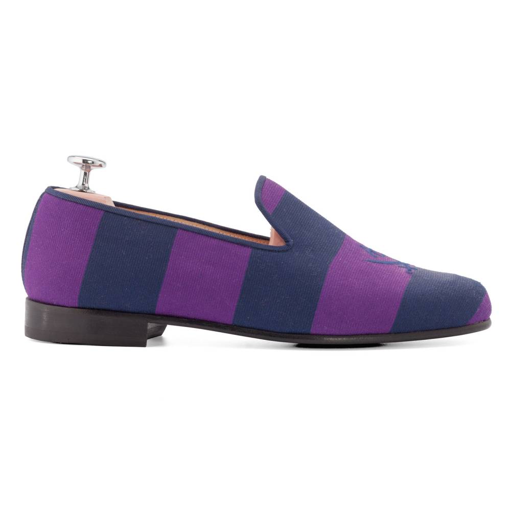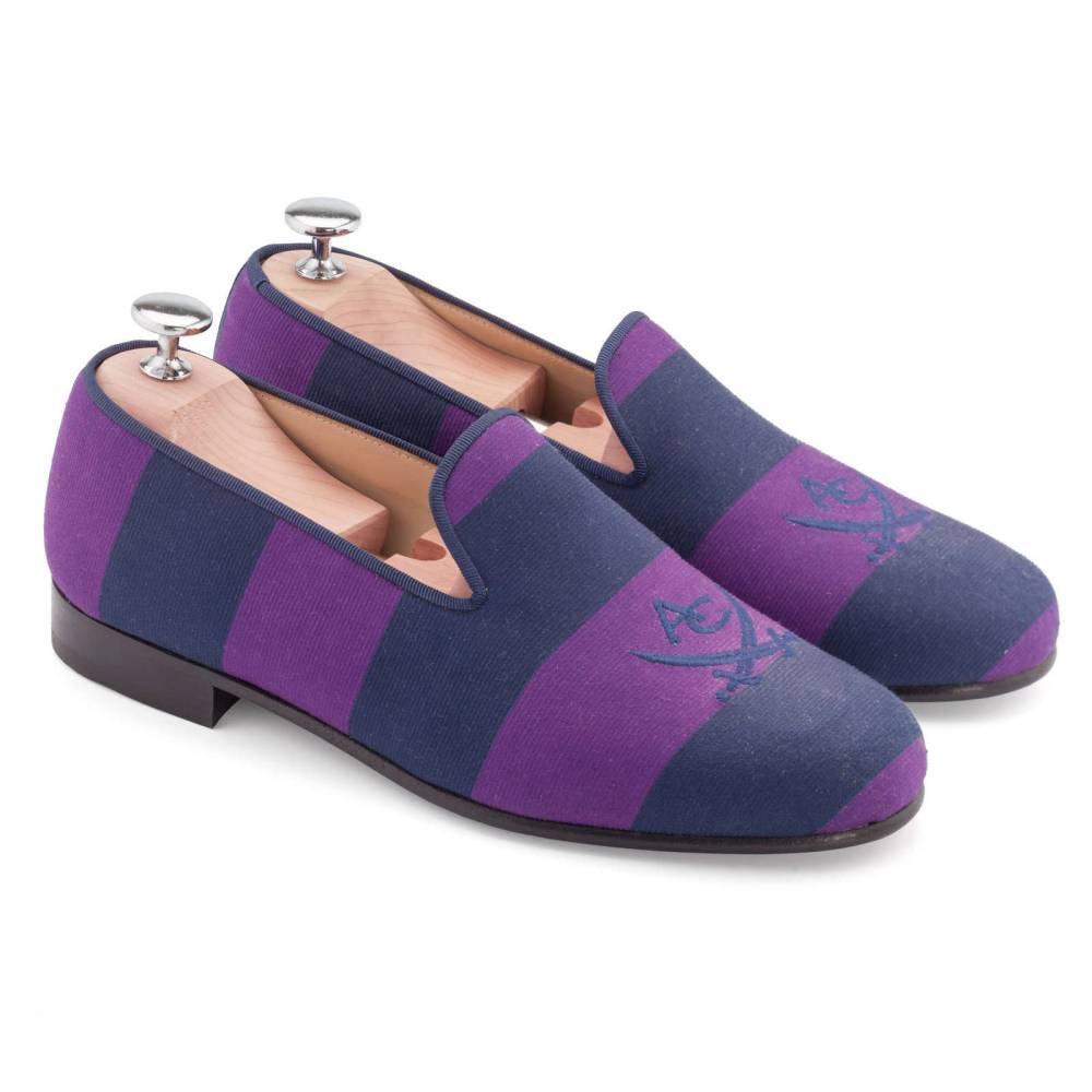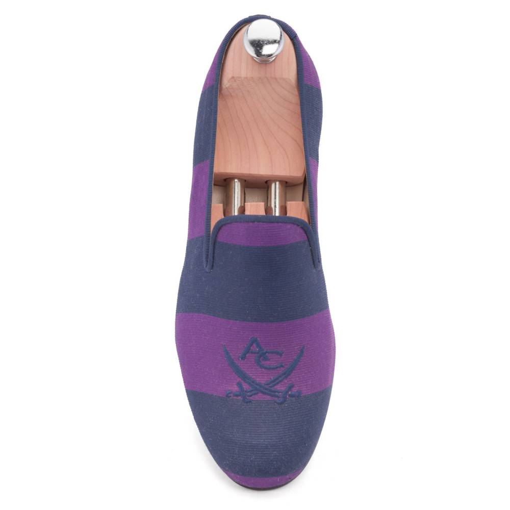 Мужские слиперы Aminas Code X Checkroom на тонкой кожаной подошве. С внешней стороны модель выполнена из фактурного текстиля с синими и фиолетовыми полосами. На мысе слиперы декорированы вышивкой в виде перекрещенных кинжалов. Внутренняя отделка из тонкой кожи. Окантовка из тёмно-синего текстиля.