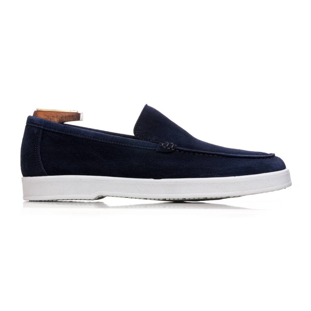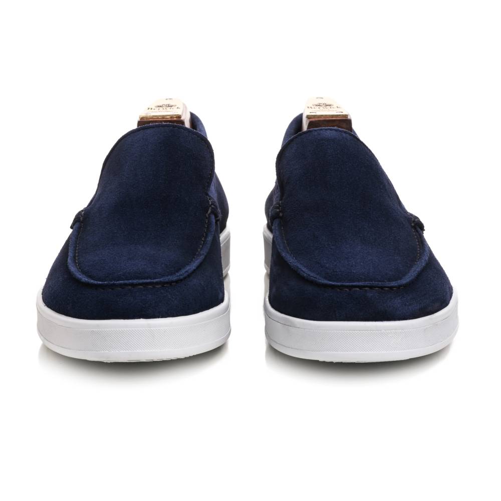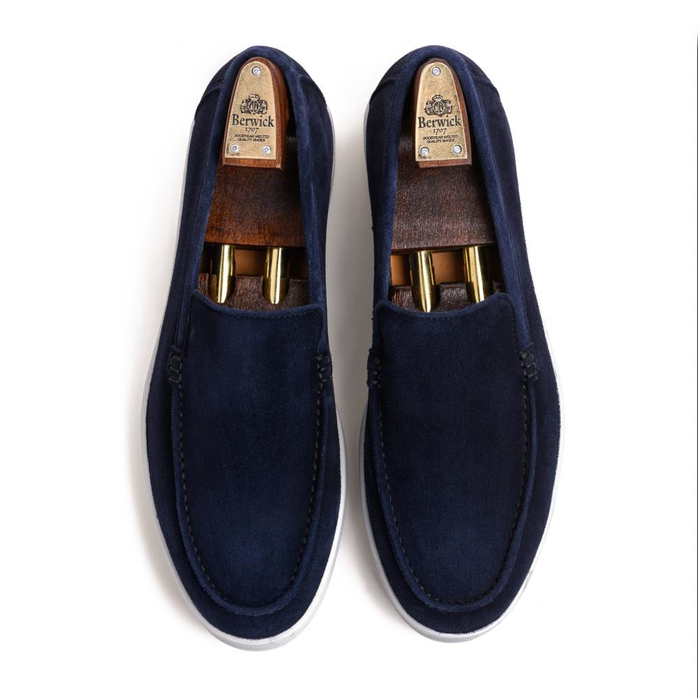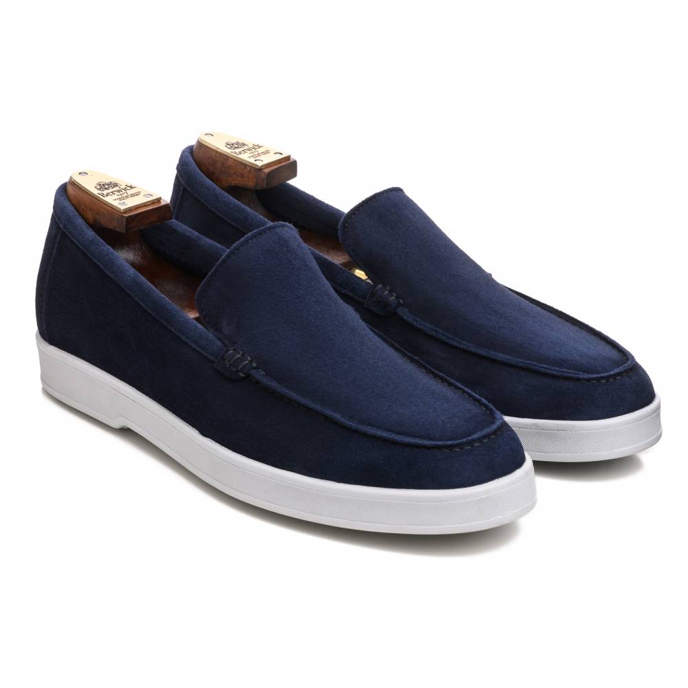 Удобные и мягкие слипоны из спортивной линейки испанского бренда Berwick. Верх выполнен из натуральной бархатистой замши синего цвета без подкладки. В конструкции модели используется гибкая подошва из литой белой резины.