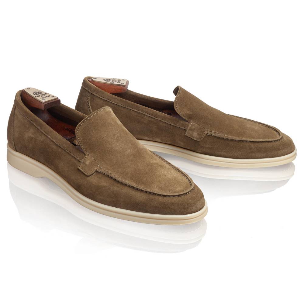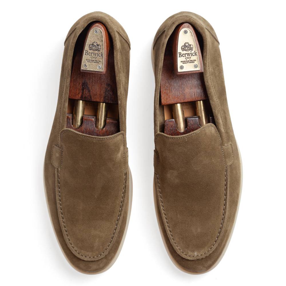 Удобные и мягкие слипоны Berwick из натуральной бархатистой замши оливкового цвета без подкладки. Лёгкая и гибкая подошва, прошитая на 270°, изготовлена из качественной резины белого цвета. Пара оснащена съёмной анатомической стелькой из пористого материала с отделкой из кожи растительного дубления. Слипоны сшиты на колодке средней полноты (F) и рассчитаны на стопу средней ширины со средним или умеренно высоким подъёмом.