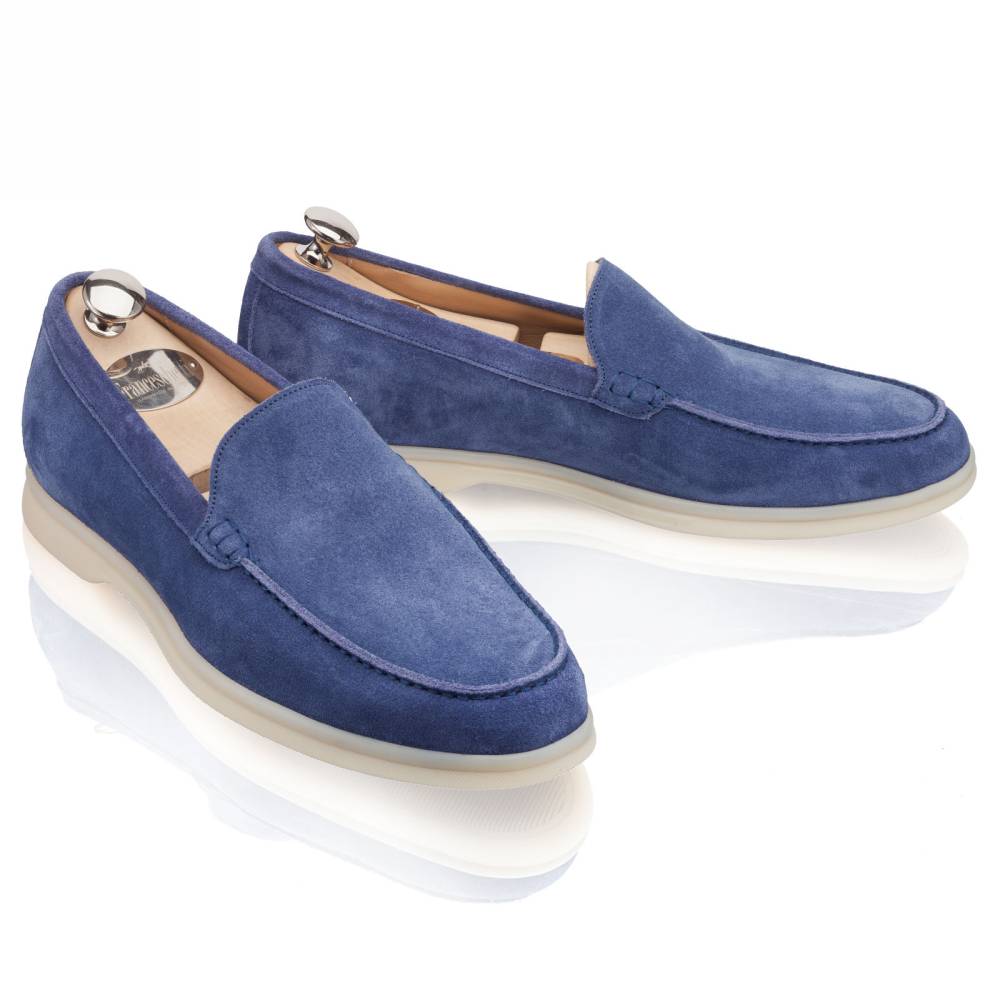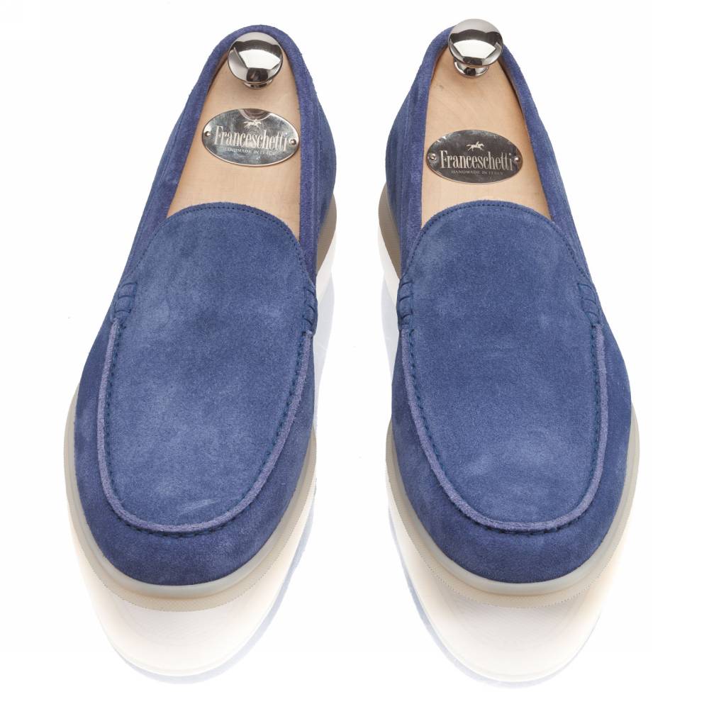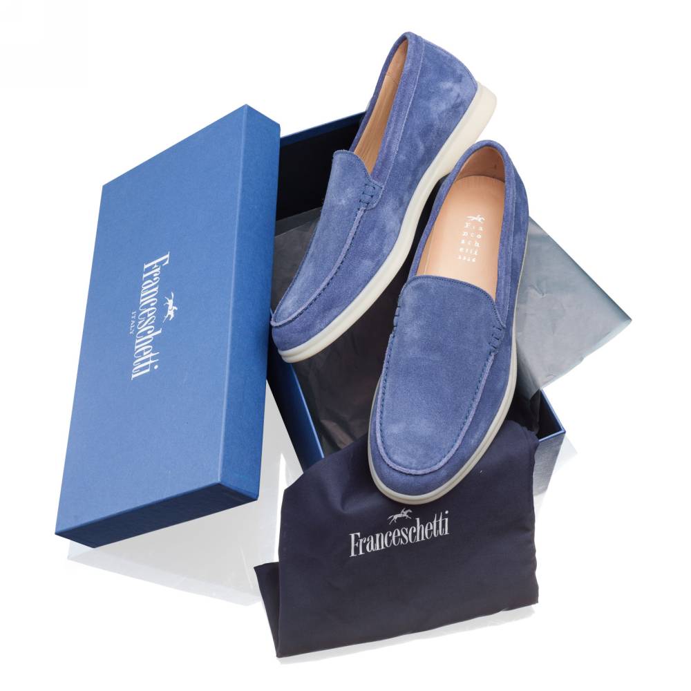Удобные и мягкие слипоны итальянской марки Franceschetti. Верх выполнен из натуральной бархатистой замши синего цвета, а подкладка — из бежевой телячьей кожи. Лёгкая и гибкая подошва изготовлена из качественной резины бежевого цвета. Слипоны сшиты на колодке средней полноты (F) и рассчитаны на стопу средней ширины со средним или умеренно высоким подъёмом.