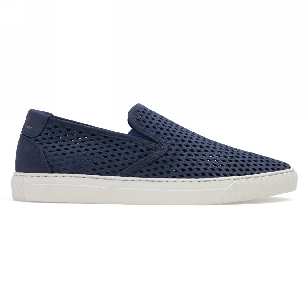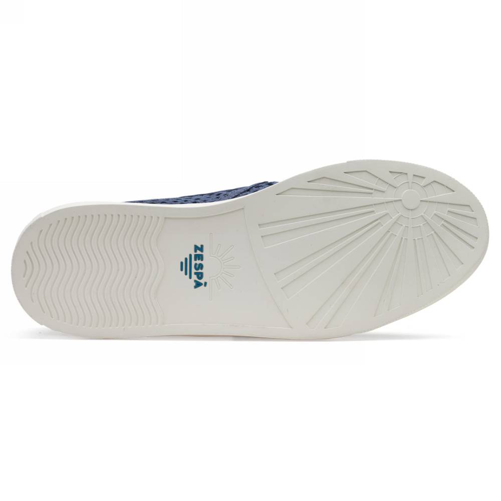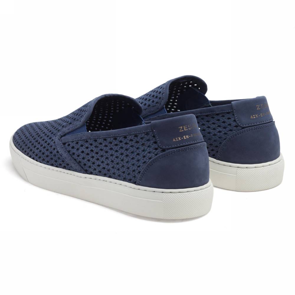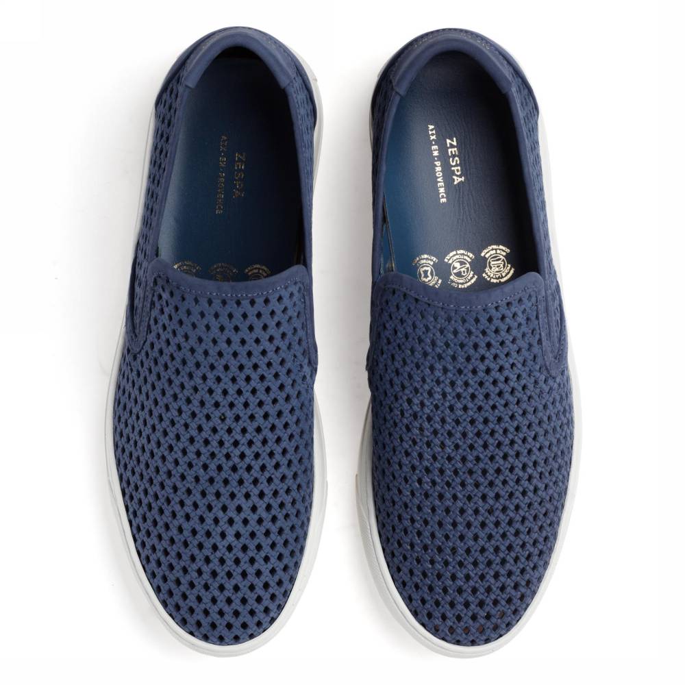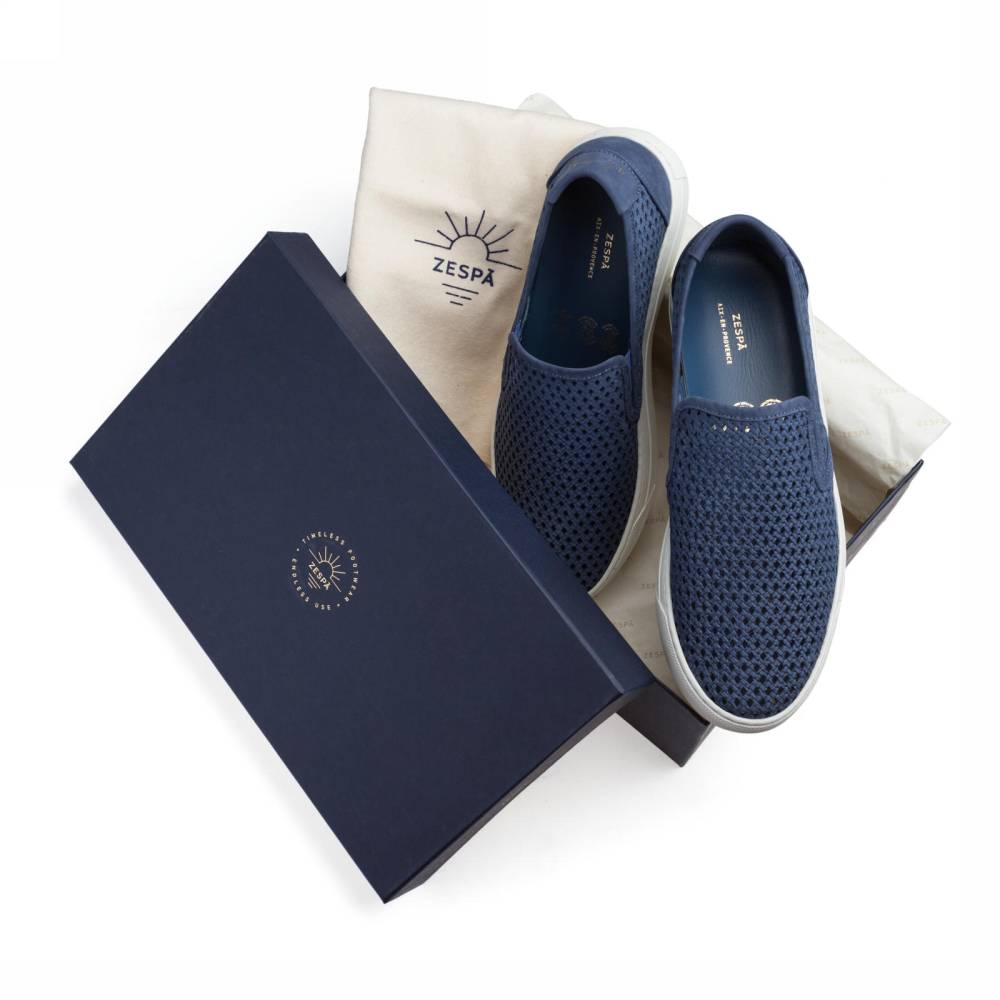 Флагманская летняя модель французского бренда Zespa — слипоны ZSP10. Вдохновлённая культурой скейтбординга, она представляет собой сочетание узнаваемого неформального силуэта и аристократичного комфорта. Верх выполнен из высококачественного перфорированного нубука тёмно-синего цвета, поставляемого итальянской дубильней. Внутренняя отделка и анатомическая стелька из натуральной телячьей кожи. Подошва из белой премиальной резины по окружности надёжно пришита к верху. Слипоны созданы с применением ручного труда на мануфактуре в Португалии.
