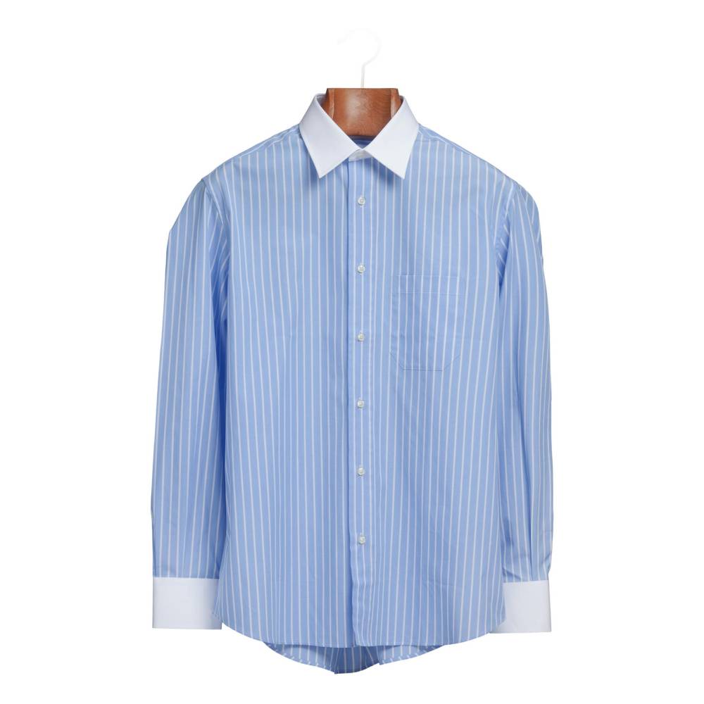 Классическая мужская сорочка от итальянского бренда Gallia. Эта модель Winchester современного кроя выполнена из высококачественного хлопка-поплина голубого цвета в тонкую белую полоску. Ключевая особенность — контрастный белый прямой воротник и манжеты, которые придают сорочке элегантный и формальный вид. Они дают прямой визуальный сигнал о золотом веке классической мужской одежды, когда такие элементы были широко распространены у стильных джентльменов. Этот стиль был популярен как на Уолл-стрит, где он ассоциировался с финансовой культурой 1980-х годов, так и в Лиге Плюща.