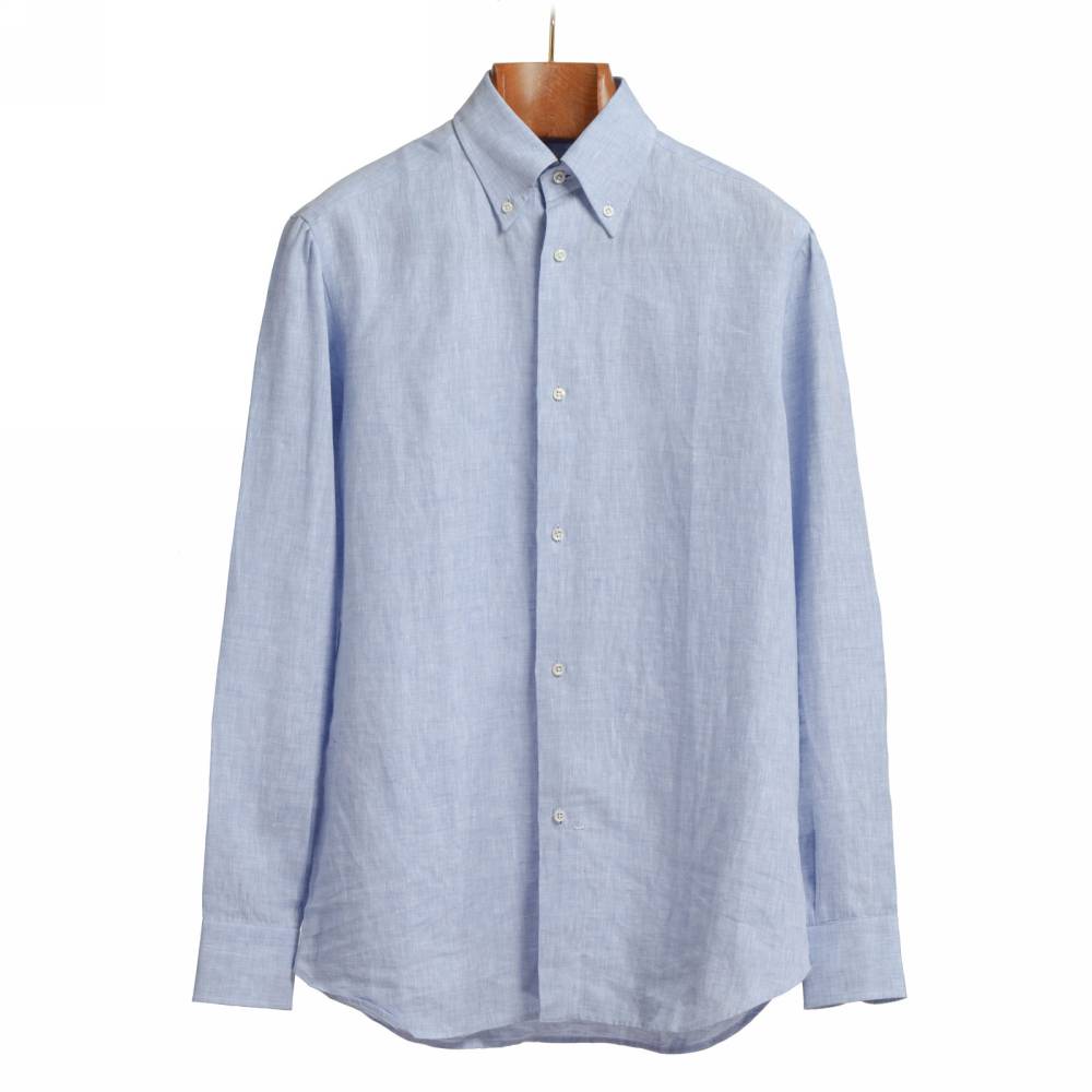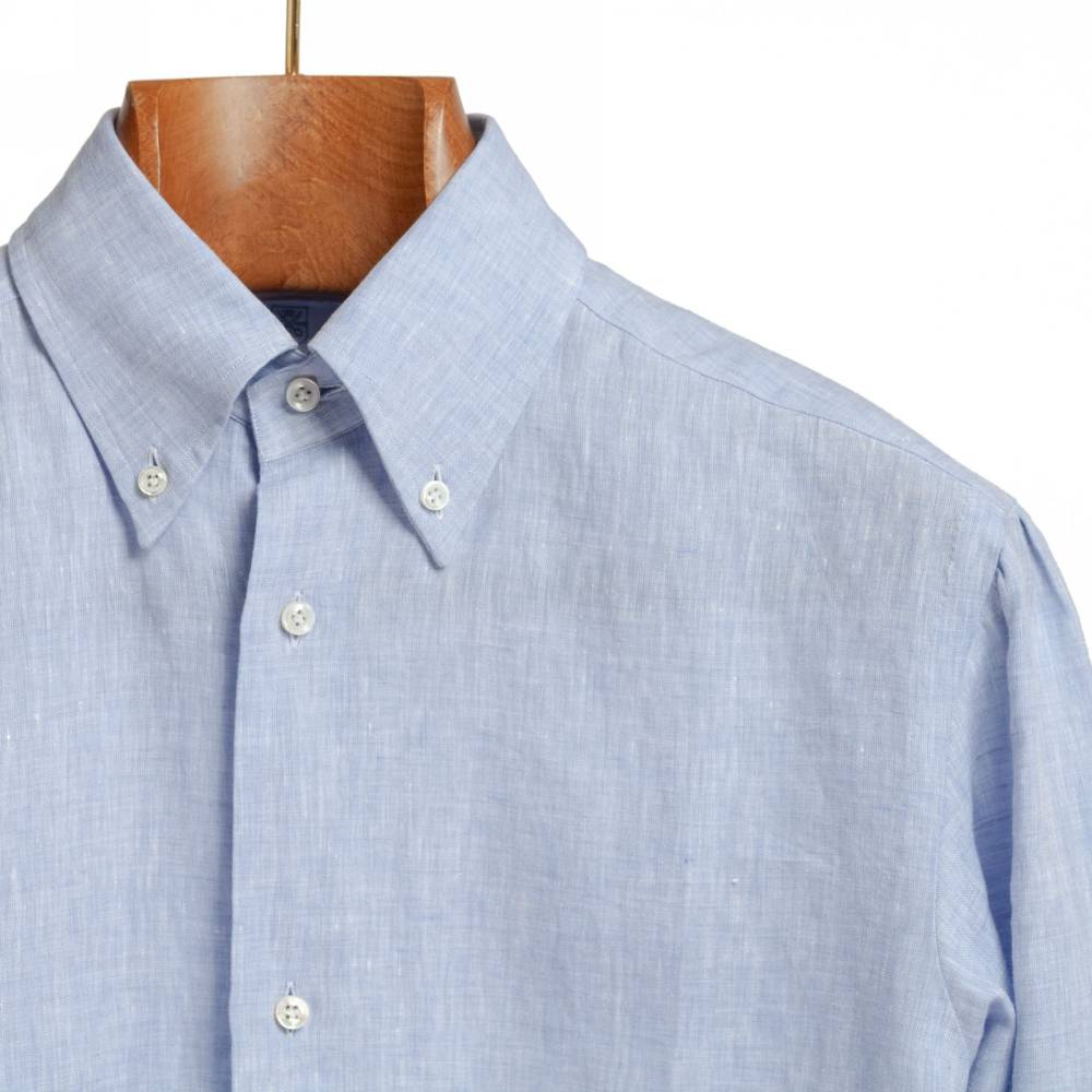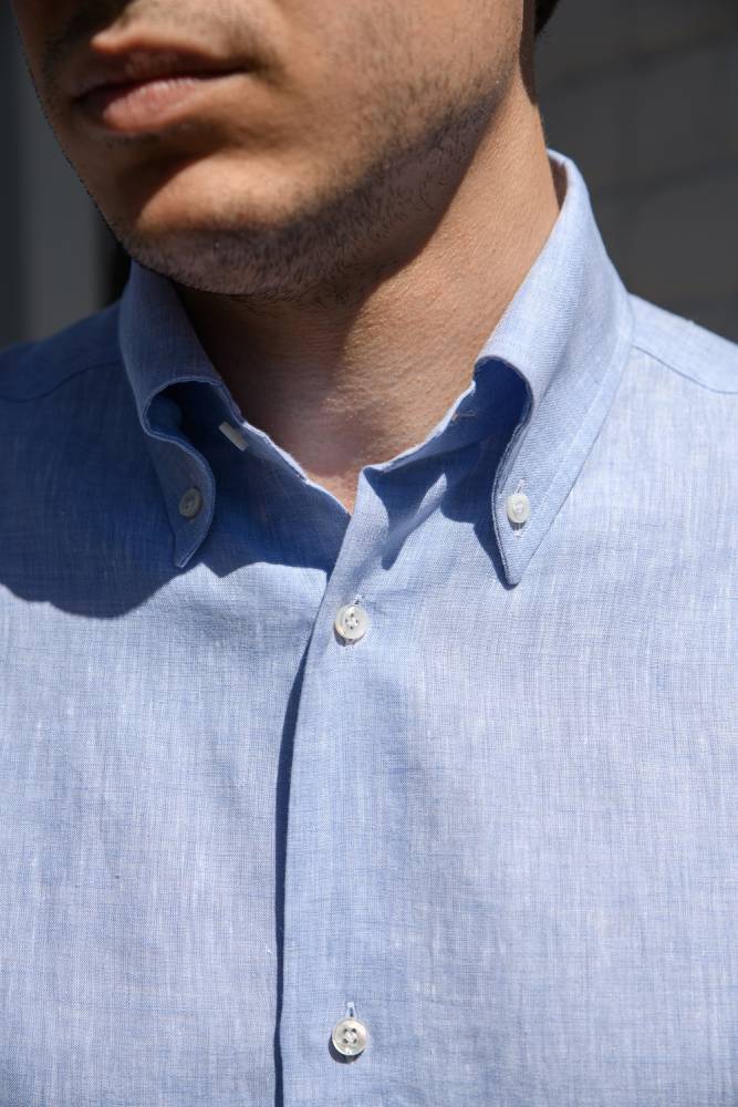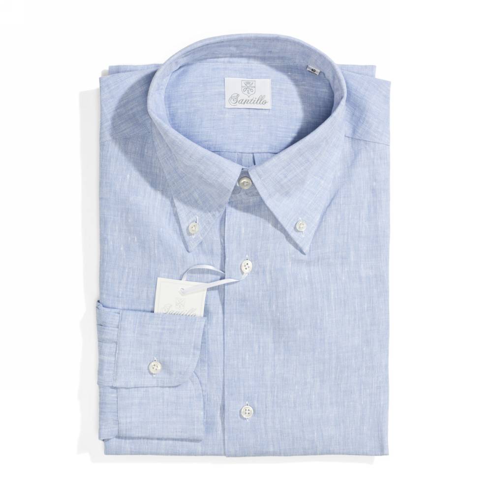 Классическая мужская сорочка итальянской марки Santillo с воротником на пуговицах создана с применением ручных операций. Модель выполнена из лёгкой (117 г) льняной ткани фирмы Thomas Mason. Воротник и манжеты мягкие. Благодаря правильному крою воротник имеет узнаваемый изгиб (англ. collar roll). Перламутровые пуговицы толщиной 2,5 мм пришиты на ножке методом «воронья лапка». На спинке по центру бантовая складка для большего объёма, а также петелька – дань популярному в прошлом элементу, берущему начало в стиле Лиги Плюща. Рукав пришит вручную после сшивания передней и задней частей сорочки. Это даёт большую свободу и комфорт. Он также дополнен сборкой на плече для лучшей посадки. Закрепка на конце передней планки, которая известна как "travetto" – отличительный признак качественной рубашки мастеров с юга Италии. Полуприталенный силуэт.
