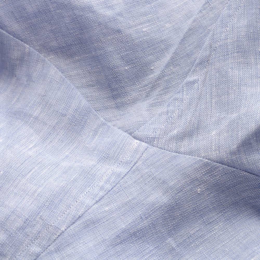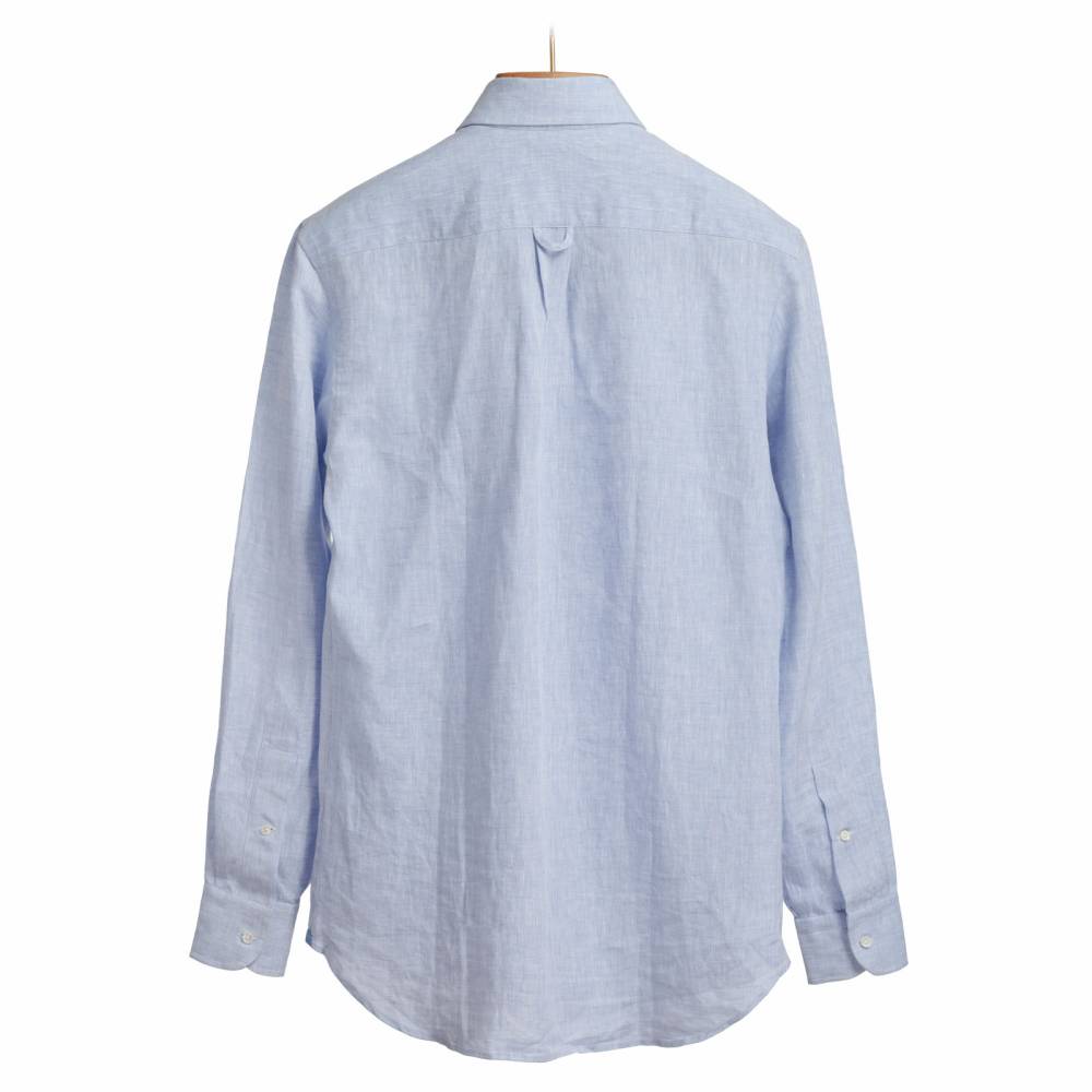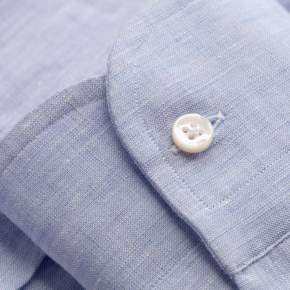 Классическая мужская сорочка итальянской марки Santillo с воротником на пуговицах создана с применением ручных операций. Модель выполнена из лёгкой (117 г) льняной ткани фирмы Thomas Mason. Воротник и манжеты мягкие. Благодаря правильному крою воротник имеет узнаваемый изгиб (англ. collar roll). Перламутровые пуговицы толщиной 2,5 мм пришиты на ножке методом «воронья лапка». На спинке по центру бантовая складка для большего объёма, а также петелька – дань популярному в прошлом элементу, берущему начало в стиле Лиги Плюща. Рукав пришит вручную после сшивания передней и задней частей сорочки. Это даёт большую свободу и комфорт. Он также дополнен сборкой на плече для лучшей посадки. Закрепка на конце передней планки, которая известна как "travetto" – отличительный признак качественной рубашки мастеров с юга Италии. Полуприталенный силуэт.