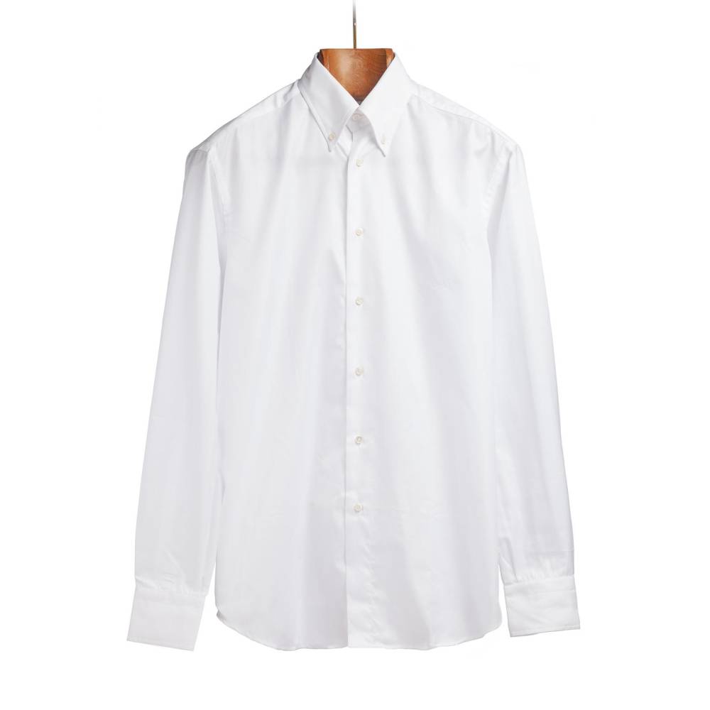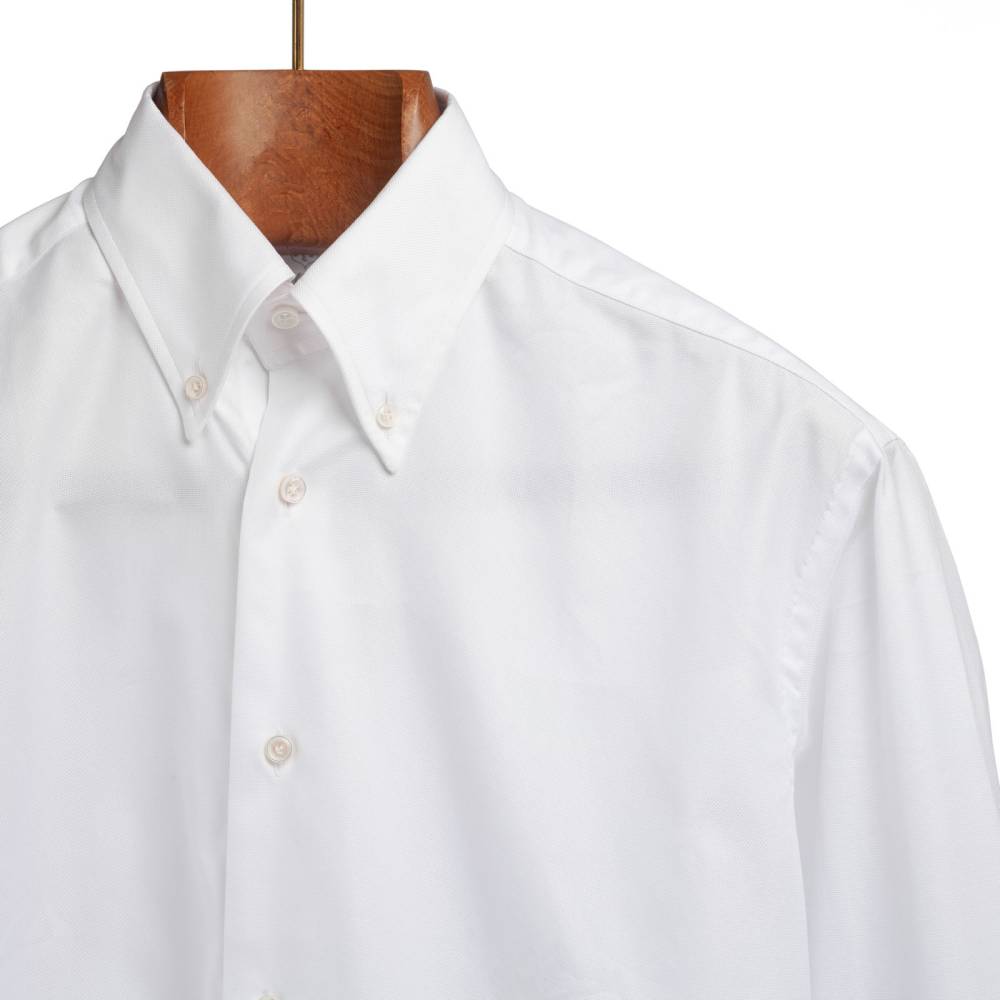 Классическая мужская сорочка итальянской марки Santillo с воротником на пуговицах создана с применением ручных операций. Модель выполнена из плотного белого хлопка-оксфорда с характерной фактурой. Воротник и манжеты мягкие. Благодаря правильному крою воротник имеет узнаваемый изгиб (англ. collar roll). Перламутровые пуговицы толщиной 2,5 мм пришиты на ножке методом «воронья лапка». На спинке по центру бантовая складка для большего объёма, а также петелька – дань популярному в прошлом элементу, берущему начало в стиле Лиги Плюща. Рукав пришит вручную после сшивания передней и задней частей сорочки. Это даёт большую свободу и комфорт. Закрепка на рукаве, которая известна как "travetto" – отличительный признак качественной рубашки мастеров с юга Италии. Полуприталенный силуэт.