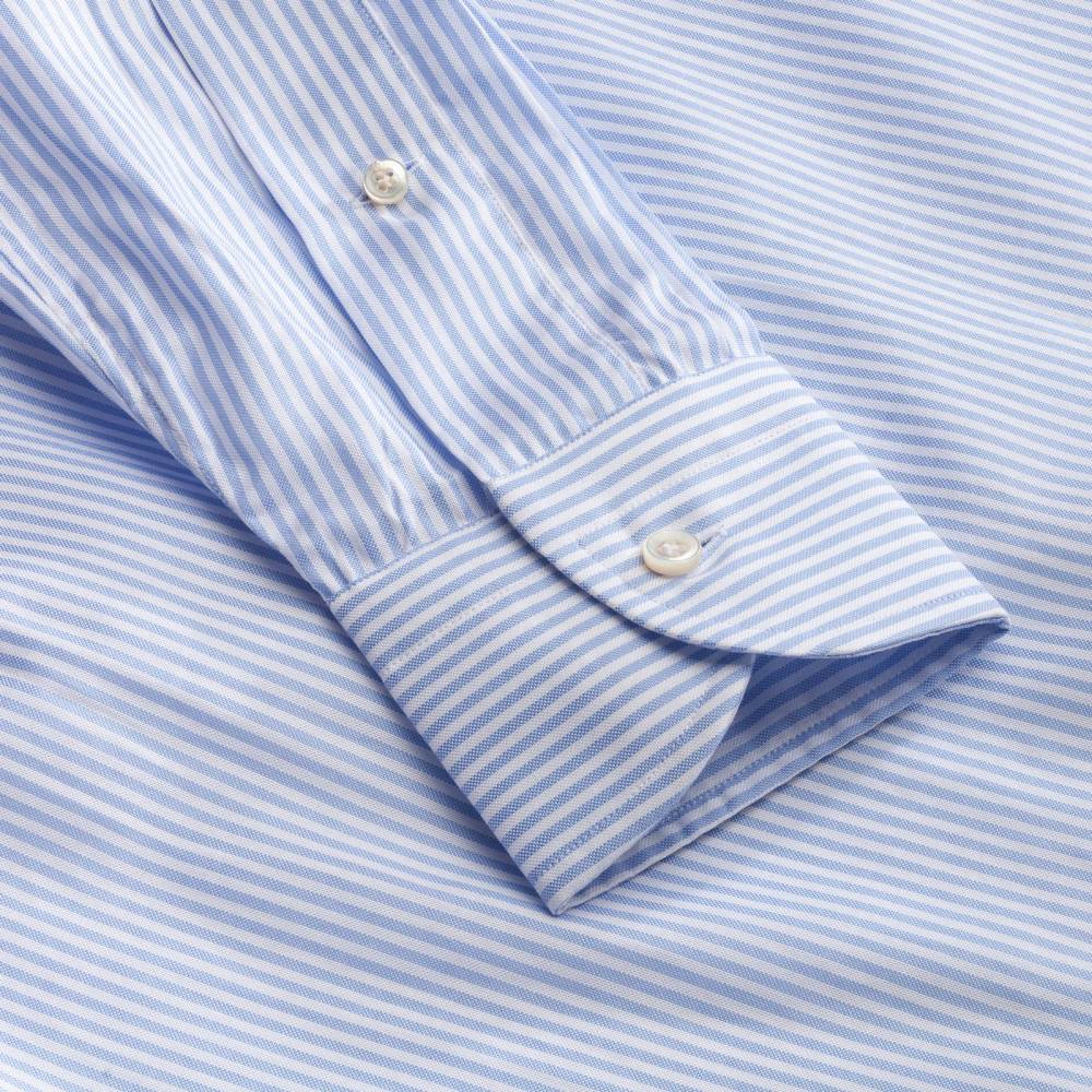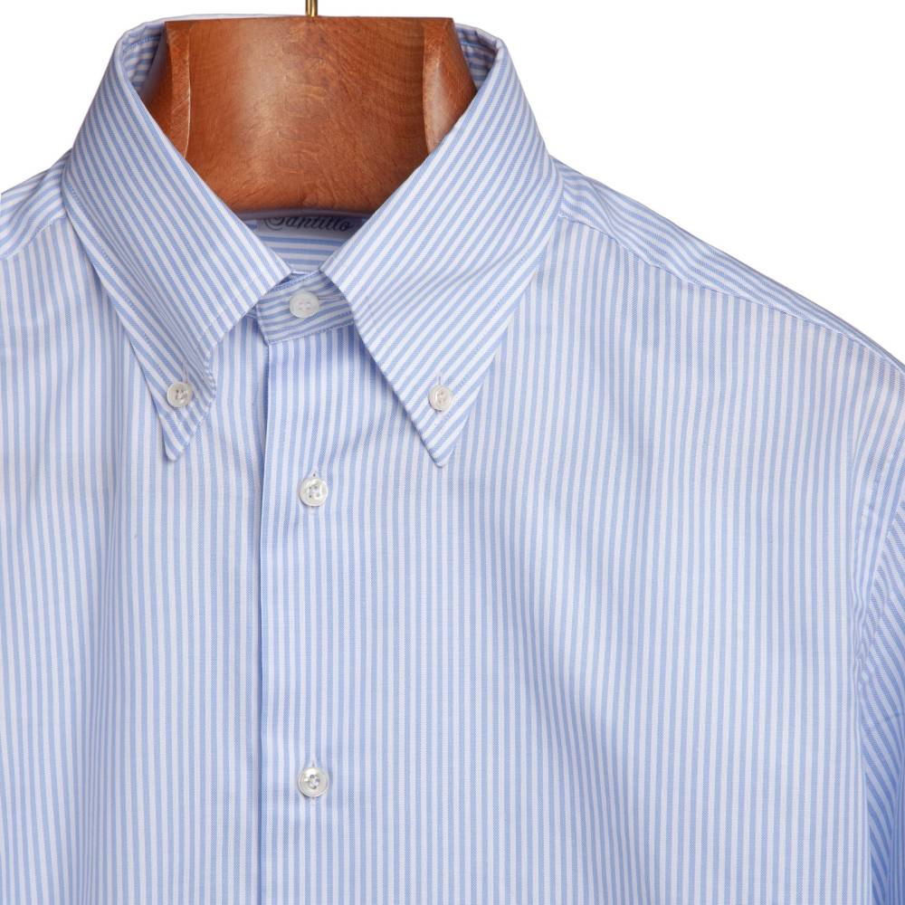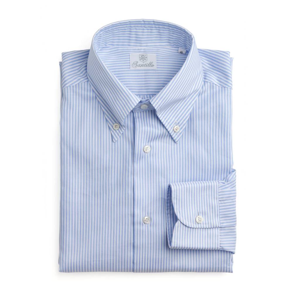 Классическая мужская сорочка итальянской марки Santillo с воротником на пуговицах создана с применением ручных операций. Модель выполнена из плотного (140 г) полосатого хлопка-оксфорда фирмы Cotonificio Albini с характерной фактурой. Воротник и манжеты мягкие. Благодаря правильному крою воротник имеет узнаваемый изгиб (англ. collar roll). Перламутровые пуговицы толщиной 2,5 мм пришиты на ножке методом «воронья лапка». На спинке по центру бантовая складка для большего объёма, а также петелька – дань популярному в прошлом элементу, берущему начало в стиле Лиги Плюща. Рукав пришит вручную после сшивания передней и задней частей сорочки. Это даёт большую свободу и комфорт. Полуприталенный силуэт.