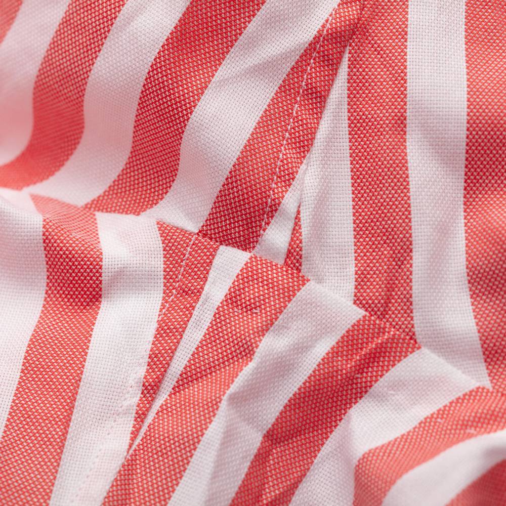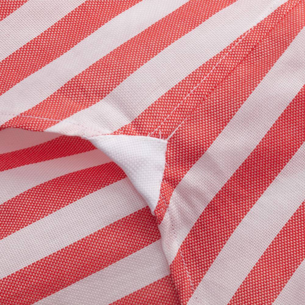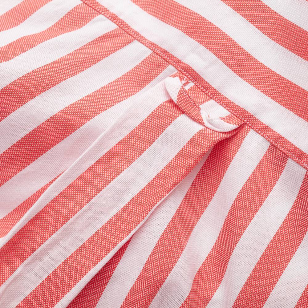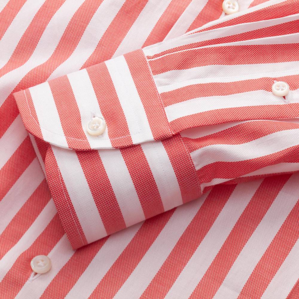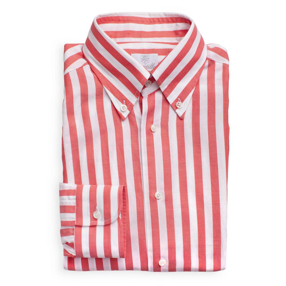 Классическая сорочка итальянской мануфактуры Santillo 1970. Изготовлена из фактурного хлопка-оксфорда в широкую красную полоску (Awning Stripe). Модель полуприталенного силуэта с мягким воротником button-down, имеющим узнаваемый изгиб (collar roll). Дизайн сочетает неаполитанский крой с эстетикой Лиги Плюща: бантовая складка на спинке обеспечивают дополнительный объем. Исключительный класс изделия подтверждают четыре ручные операции. Рукава вшиты вручную после сборки стана, что обеспечивает естественную посадку и подвижность. Перламутровые пуговицы толщиной 2,5 мм пришиты вручную на ножке методом «воронья лапка» (итал. a zampa di gallina). Артизанальную ценность изделия дополняют ручные закрепки travetto на разрезах рукавов и вшитые вручную ластовицы.