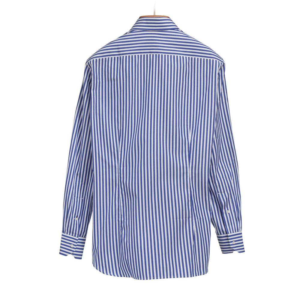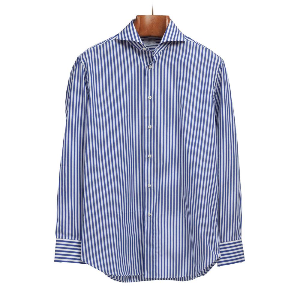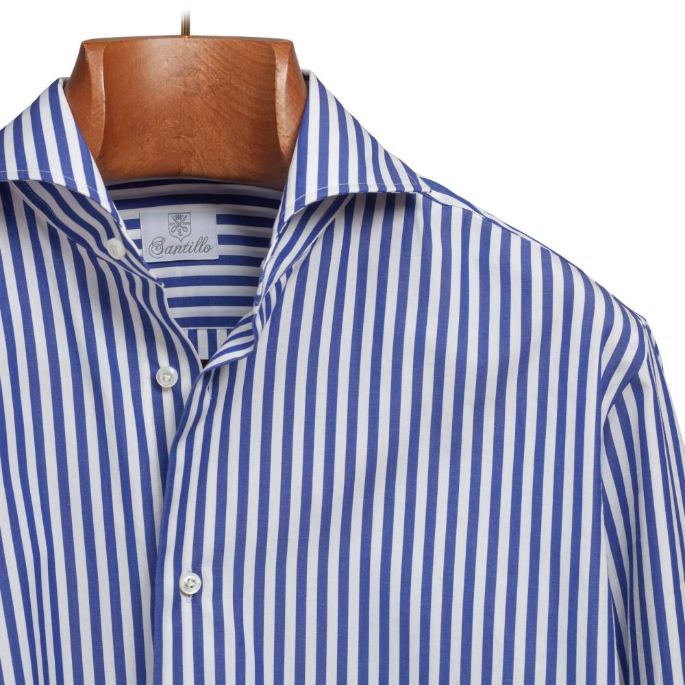 Классическая сорочка итальянской мануфактуры Santillo 1970 изготовлена из премиального хлопкового поплина в синюю бенгальскую полоску. Модель полуприталенного силуэта с мягким воротником «акула» (cut-away) — квинтэссенция неаполитанского стиля, безупречна как с крупным узлом галстука, так и в расстегнутом виде. Исключительный класс изделия подчеркивают ручные операции: рукава пришиты вручную после сборки стана для максимальной свободы движений, перламутровые пуговицы 2,5 мм закреплены методом «воронья лапка». Артизанальную ценность модели подчеркивают ручные закрепки Travetto на разрезах рукавов и планке, которые дополнительно укрепляют конструкцию.