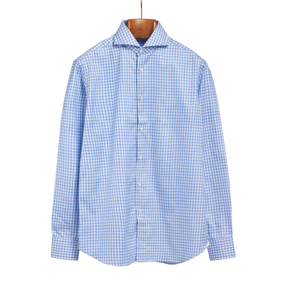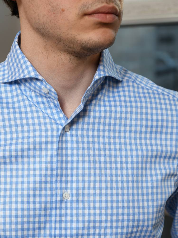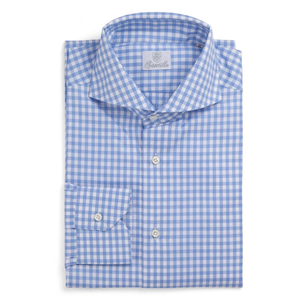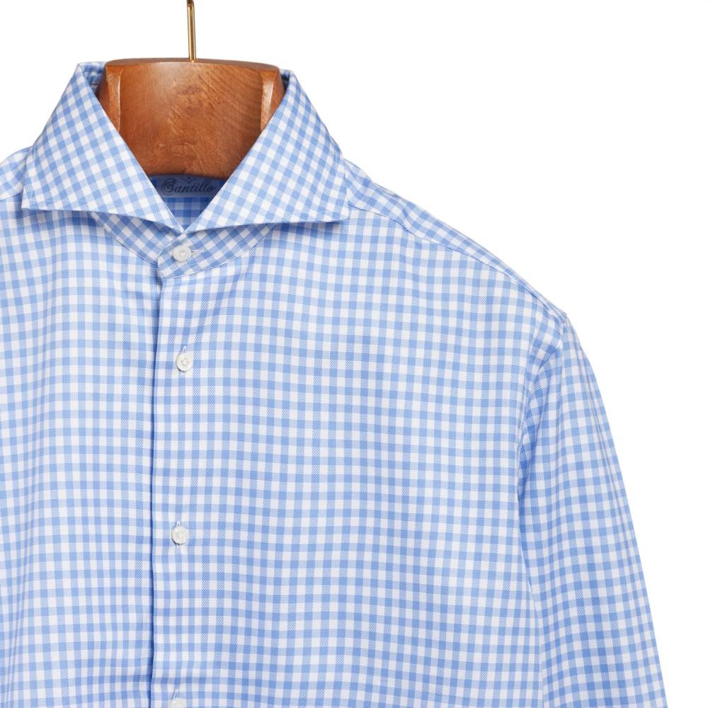 Классическая мужская сорочка итальянской марки Santillo с воротником cutaway создана с применением ручных операций. Модель выполнена из плотного (130 г) голубого хлопка-оксфорда в клетку фирмы Thomas Mason с характерной фактурой. Воротник и манжеты мягкие. Перламутровые пуговицы толщиной 2,5 мм пришиты на ножке методом «воронья лапка». На спинке на талии две вытачки. Рукав пришит вручную после сшивания передней и задней частей сорочки. Это даёт большую свободу и комфорт. Закрепка на рукаве, которая известна как "travetto" – отличительный признак качественной рубашки мастеров с юга Италии. Полуприталенный силуэт.