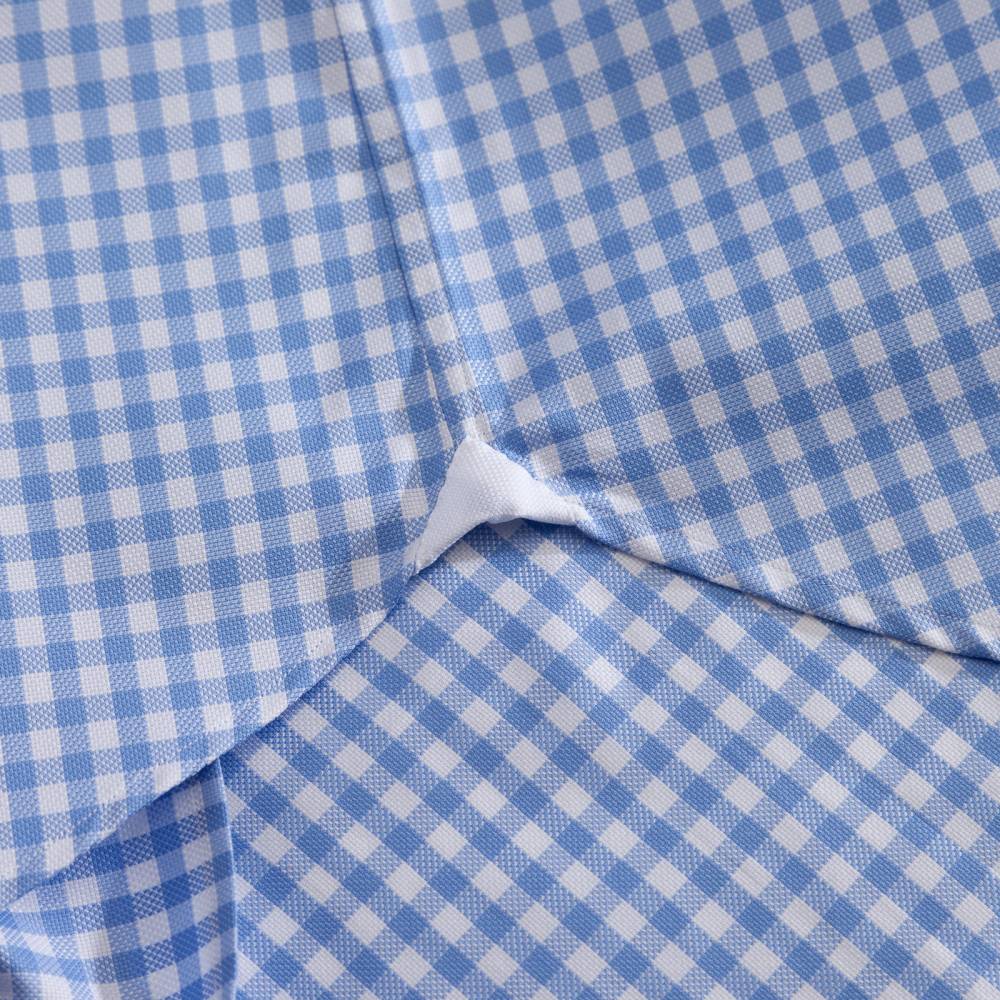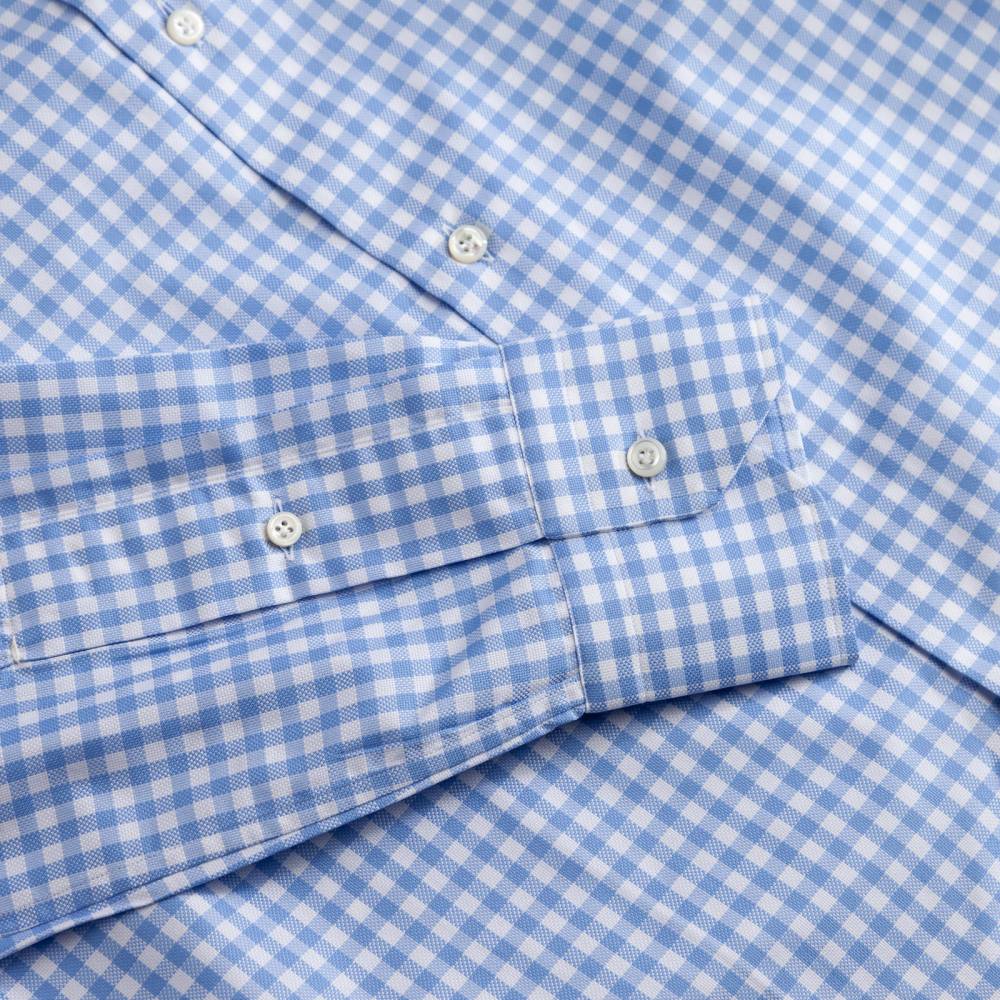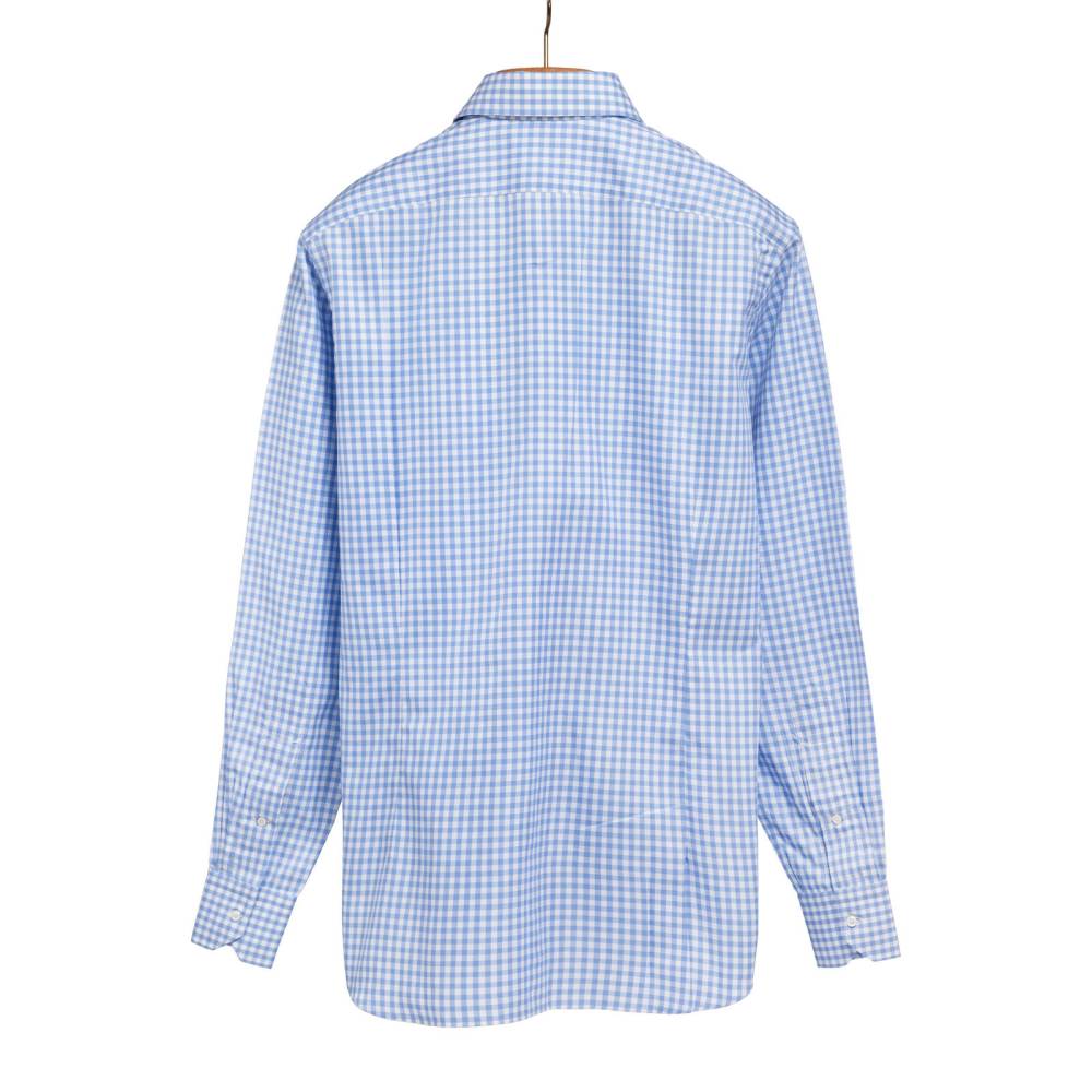 Классическая мужская сорочка итальянской марки Santillo с воротником cutaway создана с применением ручных операций. Модель выполнена из плотного (130 г) голубого хлопка-оксфорда в клетку фирмы Thomas Mason с характерной фактурой. Воротник и манжеты мягкие. Перламутровые пуговицы толщиной 2,5 мм пришиты на ножке методом «воронья лапка». На спинке на талии две вытачки. Рукав пришит вручную после сшивания передней и задней частей сорочки. Это даёт большую свободу и комфорт. Закрепка на рукаве, которая известна как "travetto" – отличительный признак качественной рубашки мастеров с юга Италии. Полуприталенный силуэт.