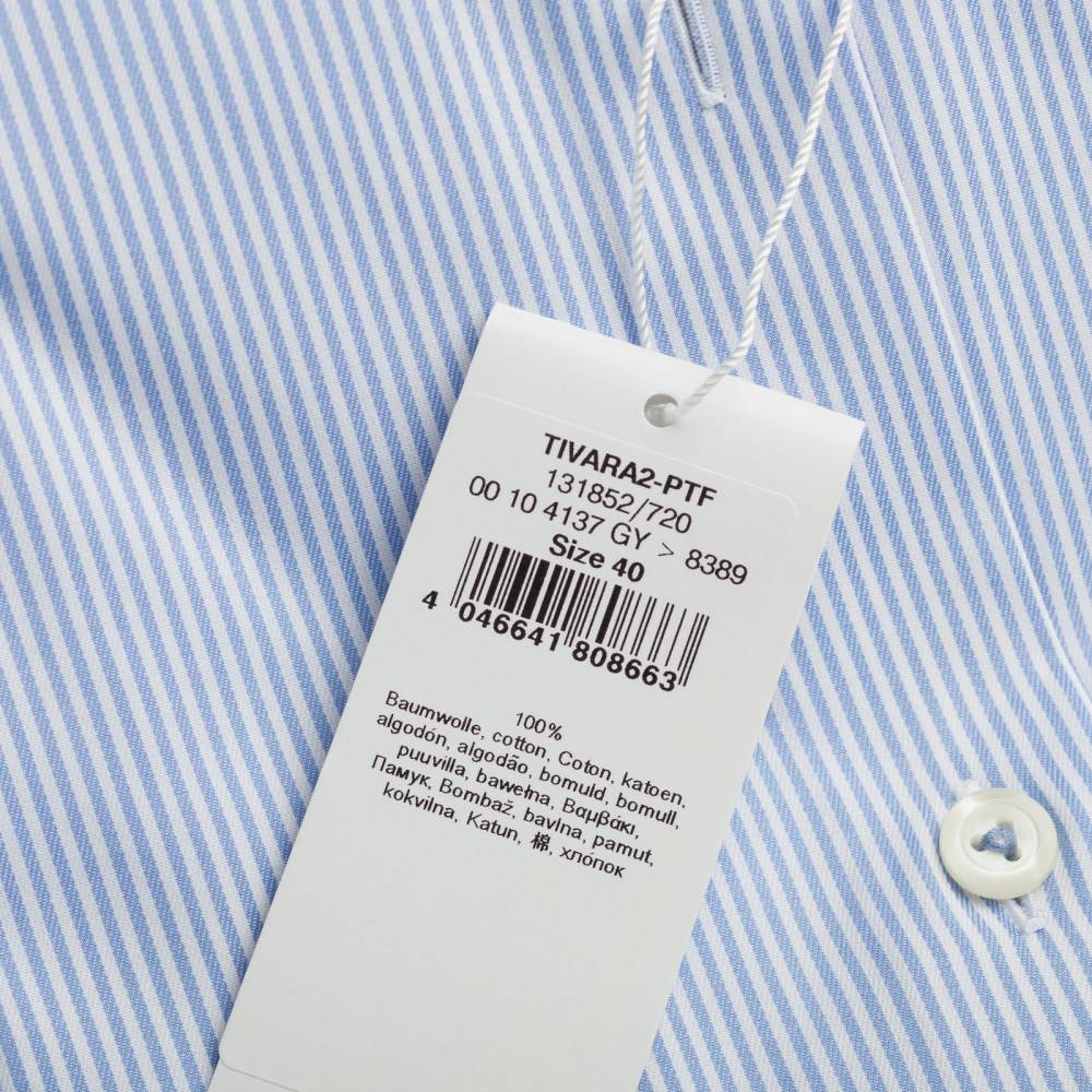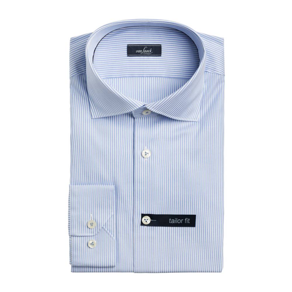 Классическая мужская сорочка голубого цвета Van Laack Blue Label из высококачественной ткани (100% хлопок) в мелкую полоску. Модель универсального силуэта «tailor fit». Застегивается на пуговицы из натуральных раковин. Сорочка имеет традиционный воротник «Cutaway» с далеко расположенными уголками. Уголки воротника дополнены фирменными косточками из гибкого пластика, которые можно вынуть перед стиркой или глажкой.