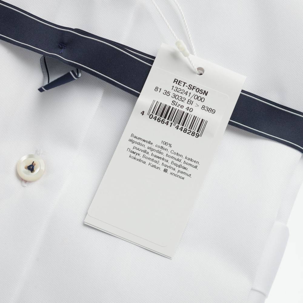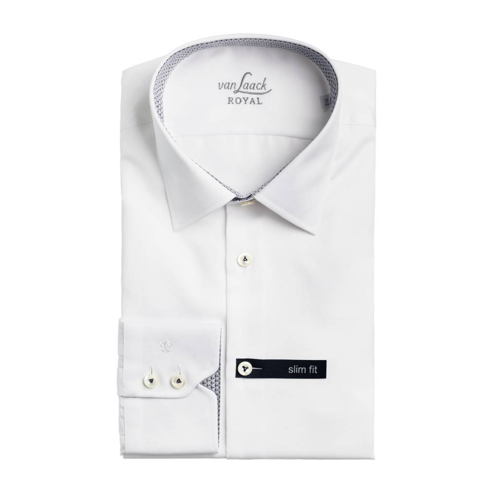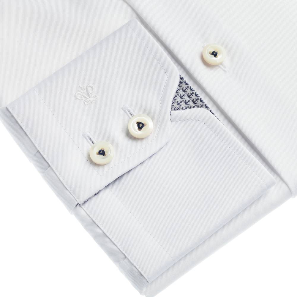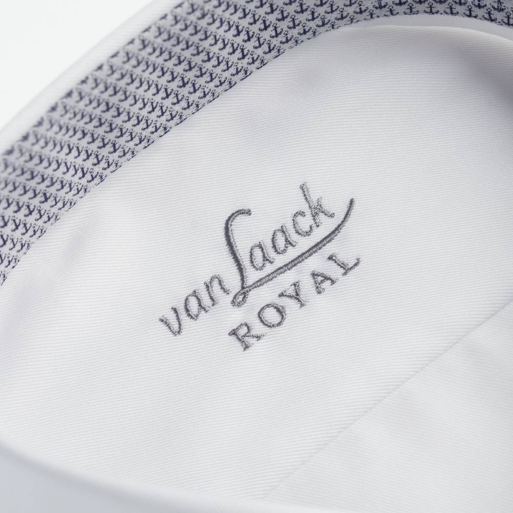 Классическая мужская сорочка белого цвета Van Laack Royal из коллекции Perfect Look. Модель приталенного силуэта выполнена из малосминаемой высококачественной ткани швейцарского производства (100% хлопок). Застегивается на пуговицы из натуральных раковин. Сорочка имеет традиционный воротник «Kent» с контрастной отделкой внутри, украшенной принтом в виде якорей. Уголки воротника дополнены фирменными косточками из гибкого пластика, которые можно вынуть перед стиркой или глажкой.