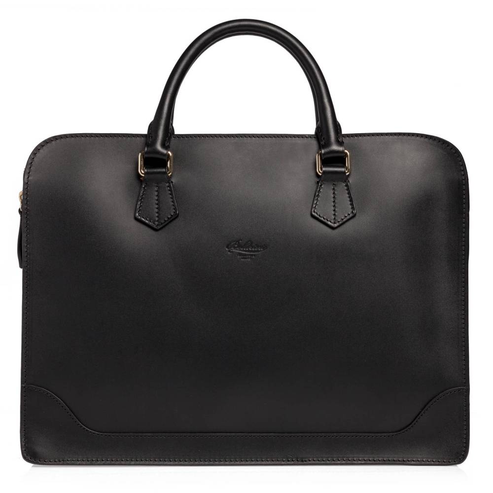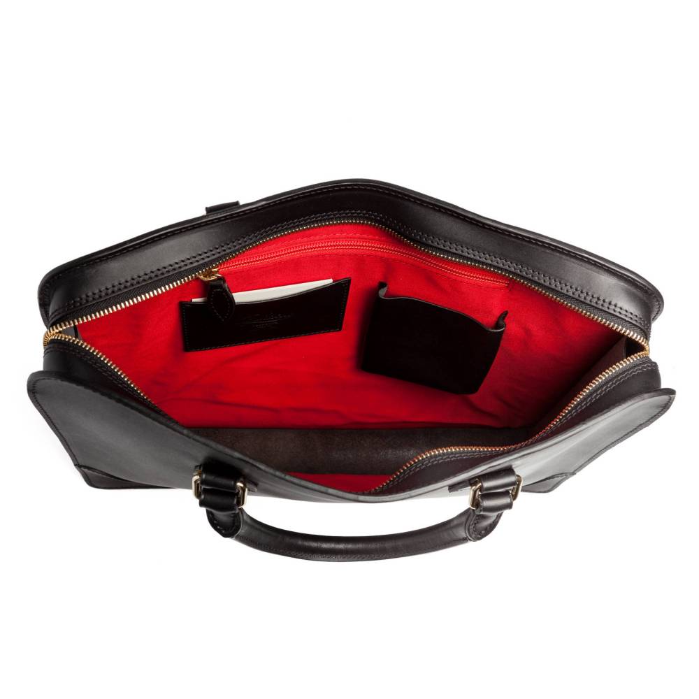 Компактная мужская сумка Boldrini Selleria на молнии. Выполнена из гладкой натуральной кожи чёного цвета с контрастной строчкой. Внутри одно отделение с холдерами для телефона и визиток, а также карман на молнии для ценных вещей. Подкладка из плотного ярко-красного текстиля. С внешней стороны секция на молнии для документов. Модель украшена тиснением в виде логотипа бренда.