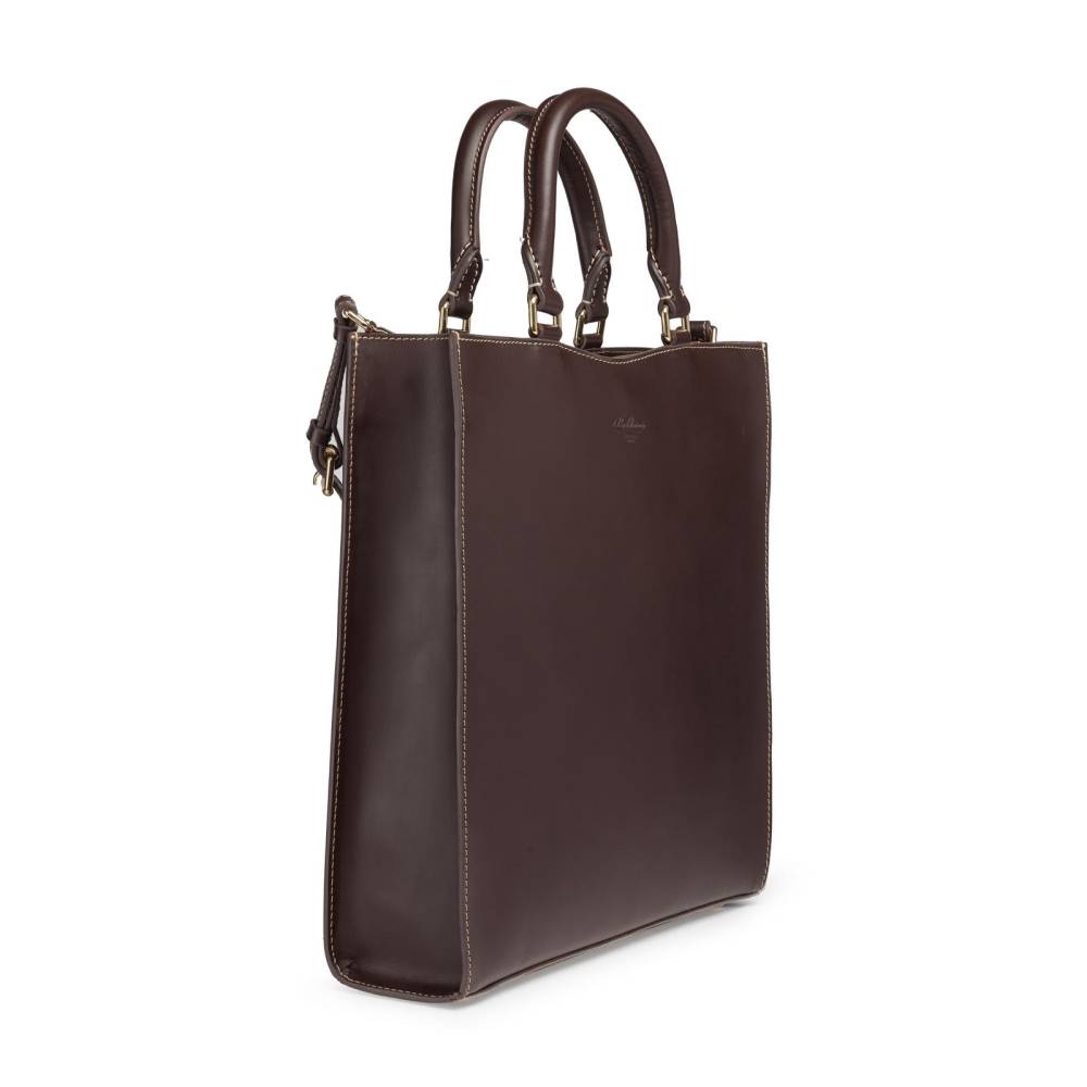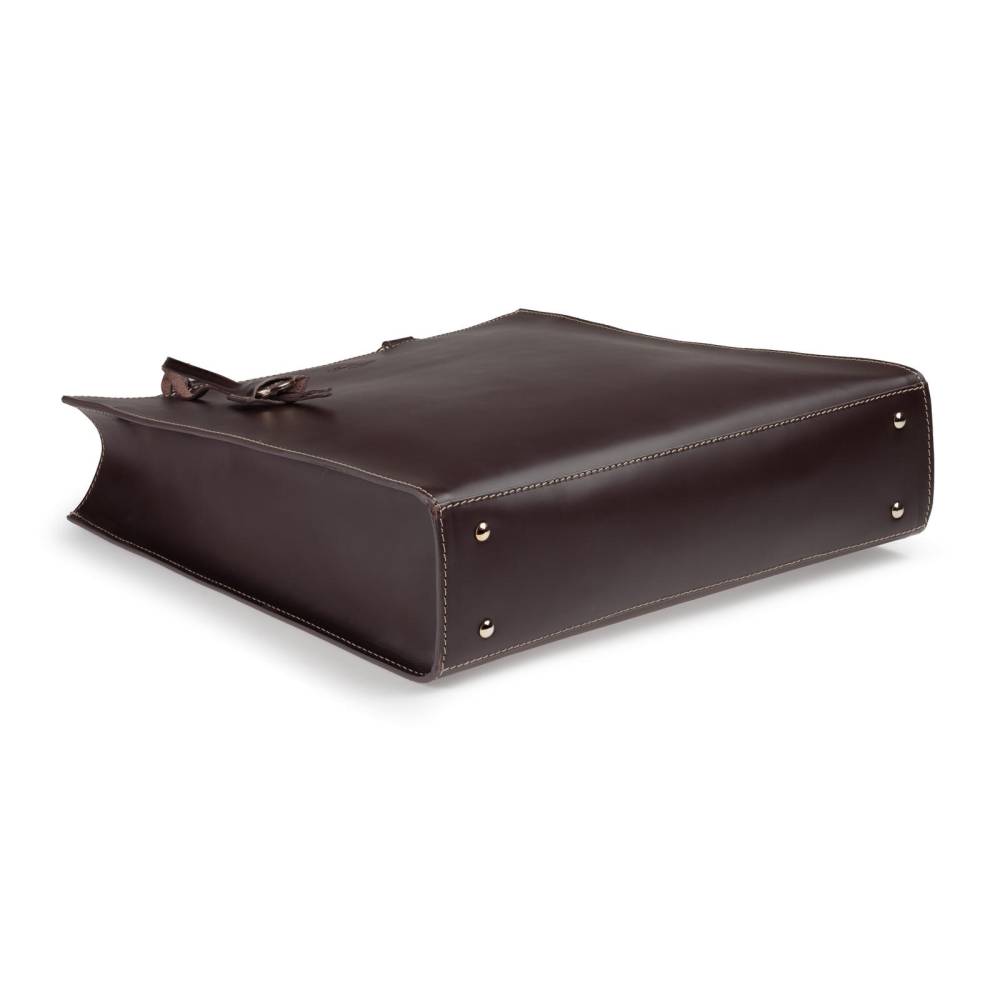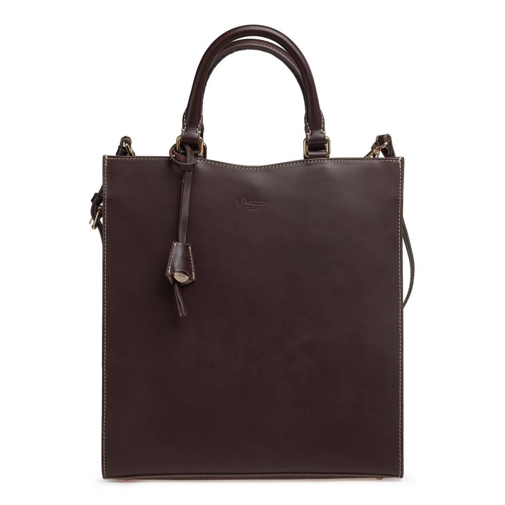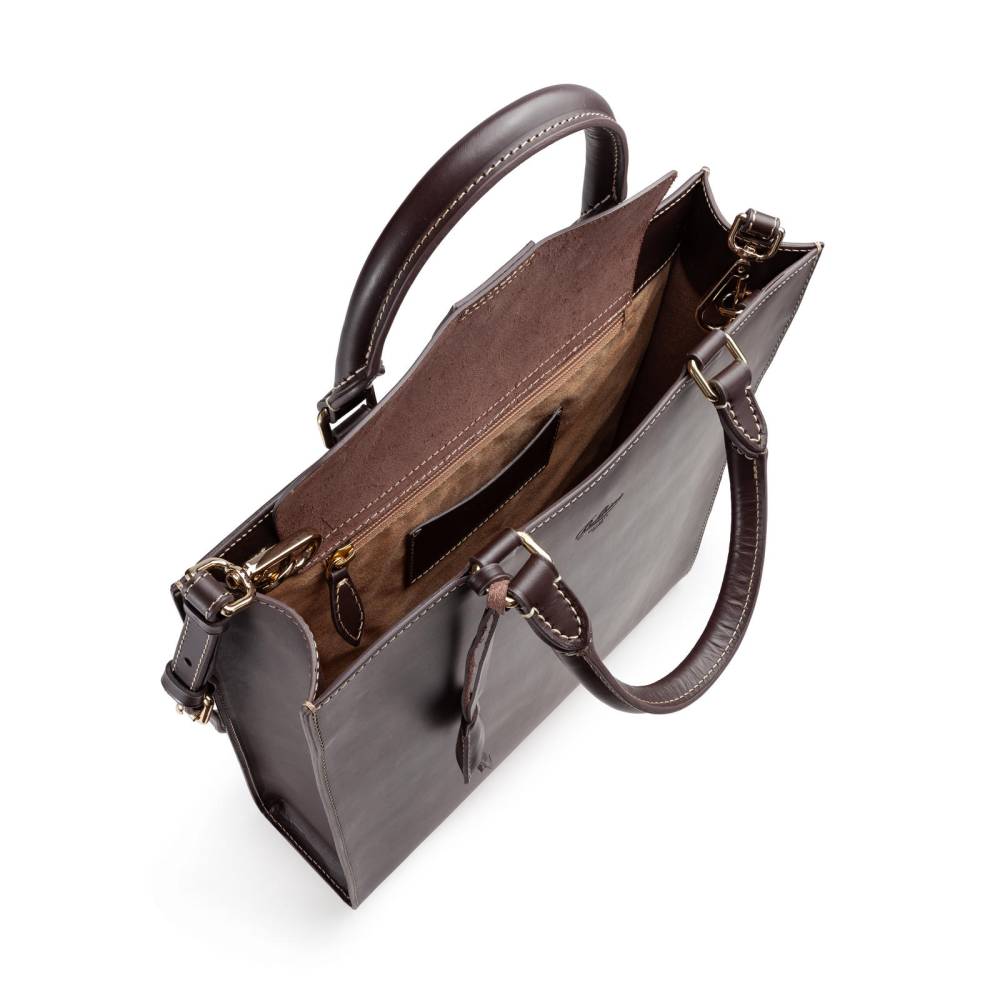 Элегантная и практичная сумка-тоут Boldrini Selleria для повседневного использования, которая подойдёт как для мужчин, так и для женщин. Выполнена из гладкой натуральной кожи тёмно-коричневого и прошита контрастной нитью. Стенки сумки соединяются между собой клапаном на магнитной кнопке. Внутри два небольших кармана для ценных вещей, один из которых на молнии, а также небольшой кожаный кармашек для пластиковых карт или визиток. Подкладка выполнена из высококачественной бархатистой алькантары бежевого цвета. К модели прилагается тонкий плечевой ремень из кожи. Дно усилено элементами из латуни.